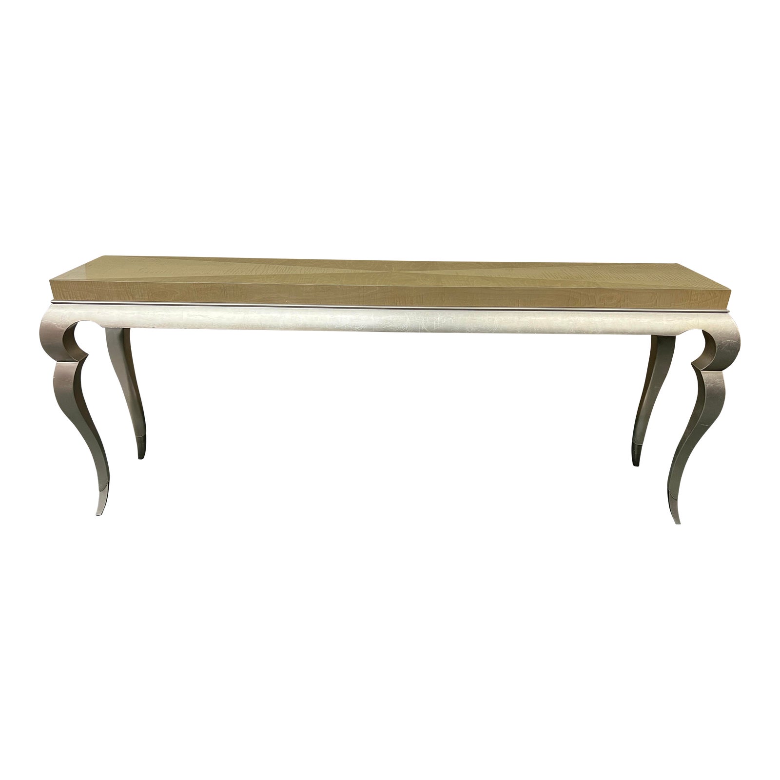 Design Plus Gallery presents a Caracole She’s Got Legs Console Table. Classic French silhouette is modernized with the signature Caracole touch with a mixture of organic and luxurious finishes. Top is inlaid with a thick maple veneer showcasing a subtle wood grain in a champagne finish. Silver leaf detailing accents the legs and apron. Cabriole inspired saber legs are capped with silver feet. There is visible + minor wear from usage , console is in good condition. Frame and legs are mixed with birch and pine.