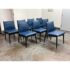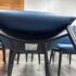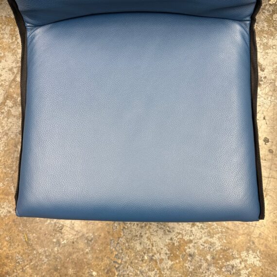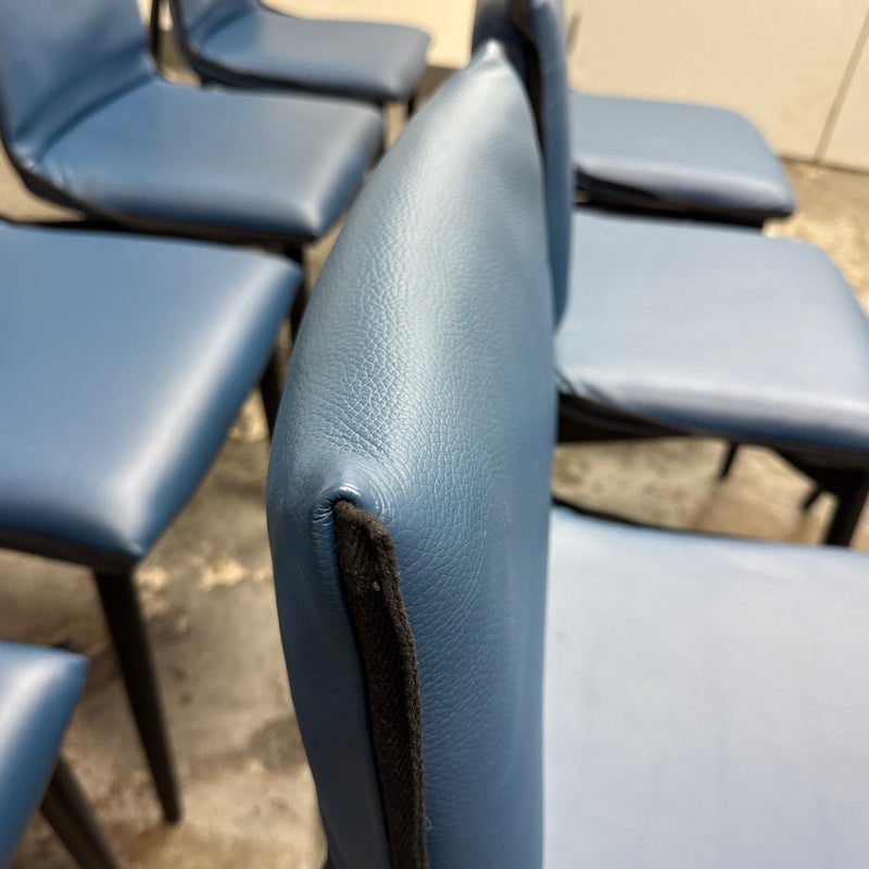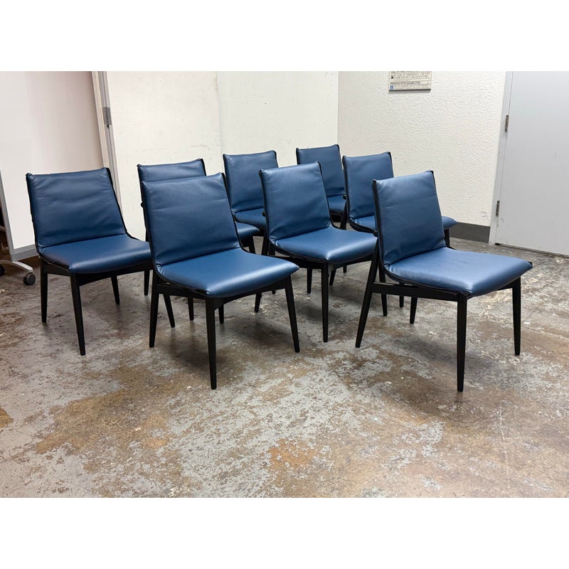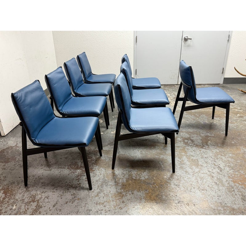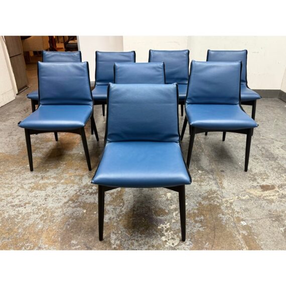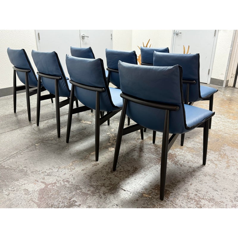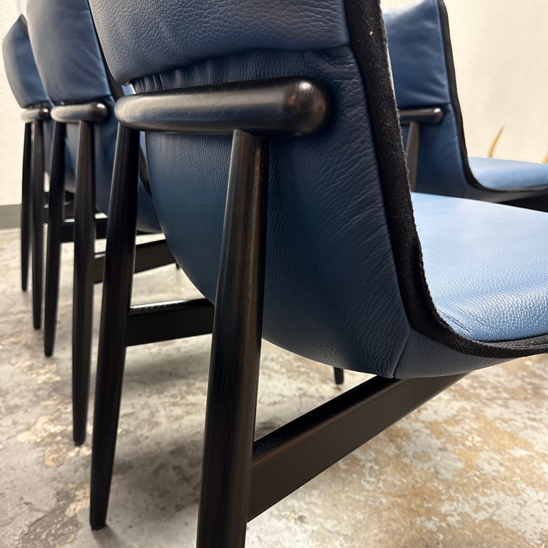 Design Plus Gallery presents a Set of Eight EOOS Embrace Collection Leather Dining Side Chairs from Carl Hansen & Søn. The blue leather fabric folds around the top and bottom edges and perfectly enwraps around their shaped black wooden frames creating a striking contrast. The chairs embody the unity of craftsmanship with innovative design. The frames are an oak black finish and Thor leather with black trim. They are gently padded for a soft, yet supportive seat. In good condition, minimal wear from usage. Made in Denmark.