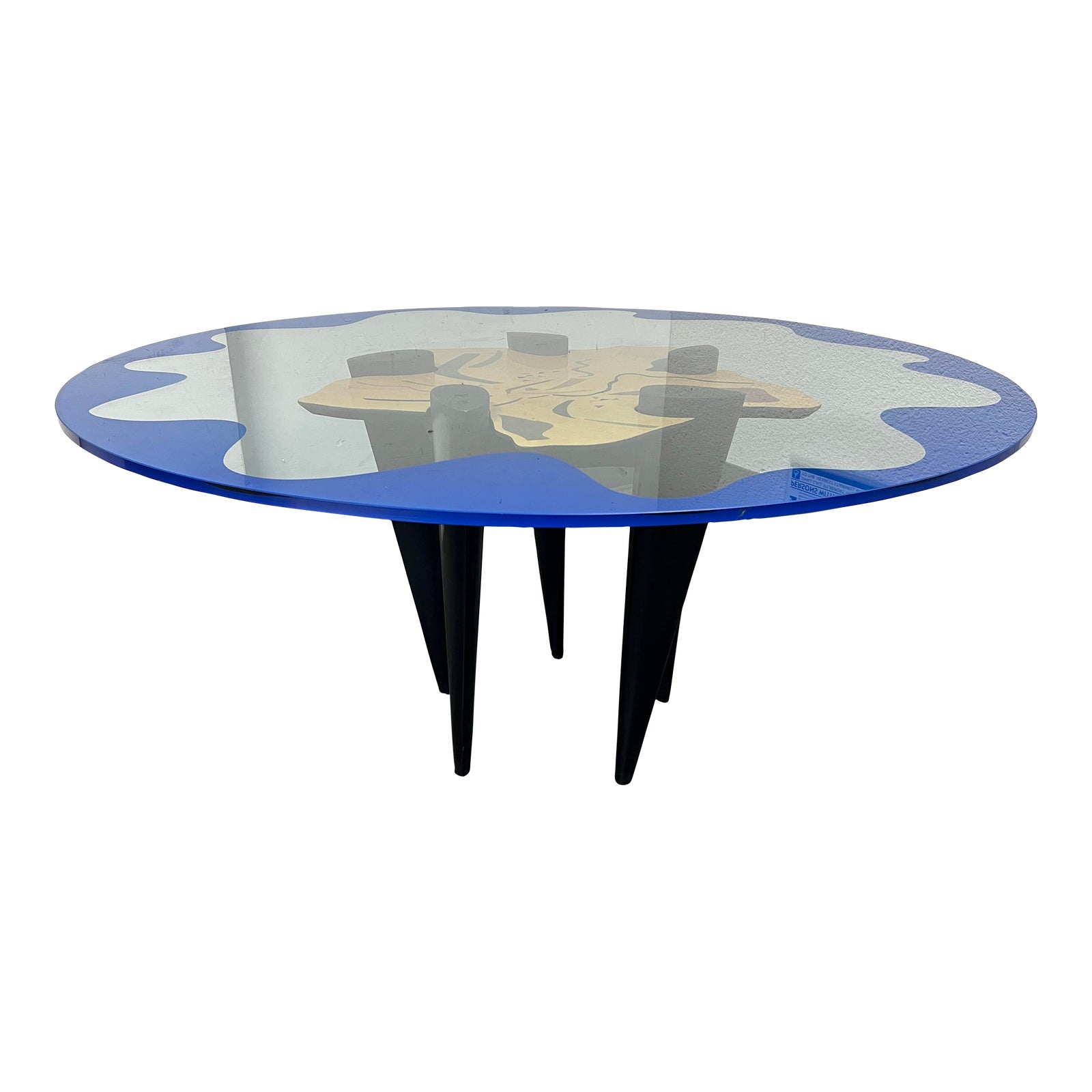 Design Plus Gallery presents a Carlo Malnati Dining Table. Such a visually captivating piece that showcases a unique blend of postmodern Italian design elements. Its exquisite construction and artistic details make it an excellent addition to any dining space. The table features a loose round glass top, adding a sleek and modern touch to the overall design. The glass is held in place by a sturdy frame that is beautifully adorned with a waved paint pattern around the edge. This artistic detail creates a sense of movement and adds a touch of whimsy to the table.