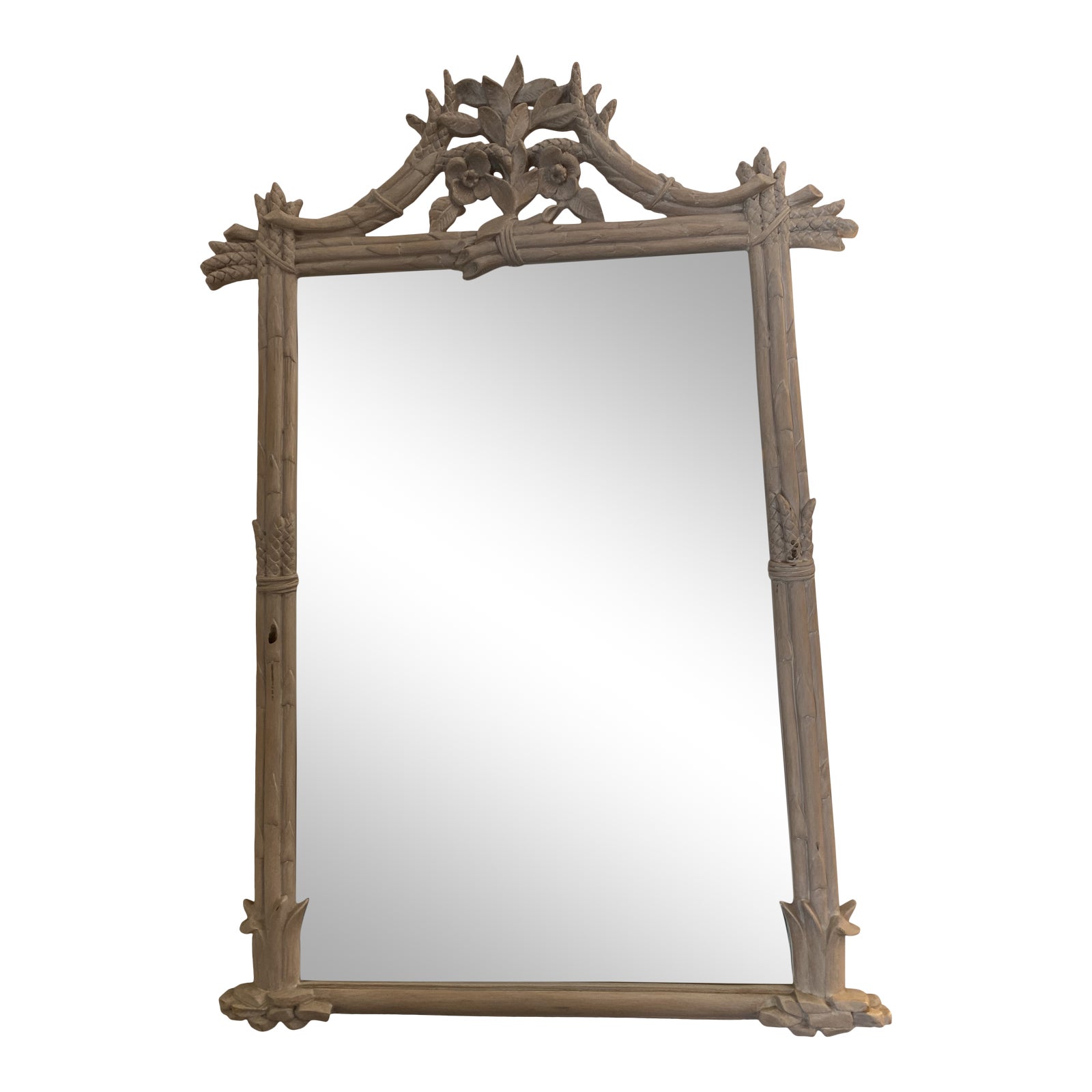 Design Plus Gallery presents a a Mirror by Carolina Mirror Company. A hand carved wood frame with carved wheats and floral crowning. The finish is weathered, compliments a Shabby Chic esthetics. The mirror insert is beveled. Originally purchased from the San Francisco Design Center in the Late 20th Century.