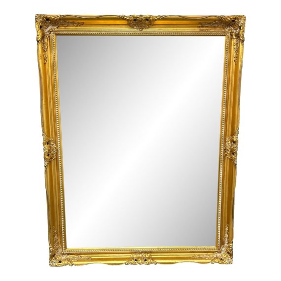 Design Plus Gallery presents a Vintage Traditional Mirror by Carolina Mirror Company. An elegant ornate frame with a gold finish. Ready to hand vertically or horizontally. In good condition, minor wear from usage + age.