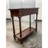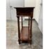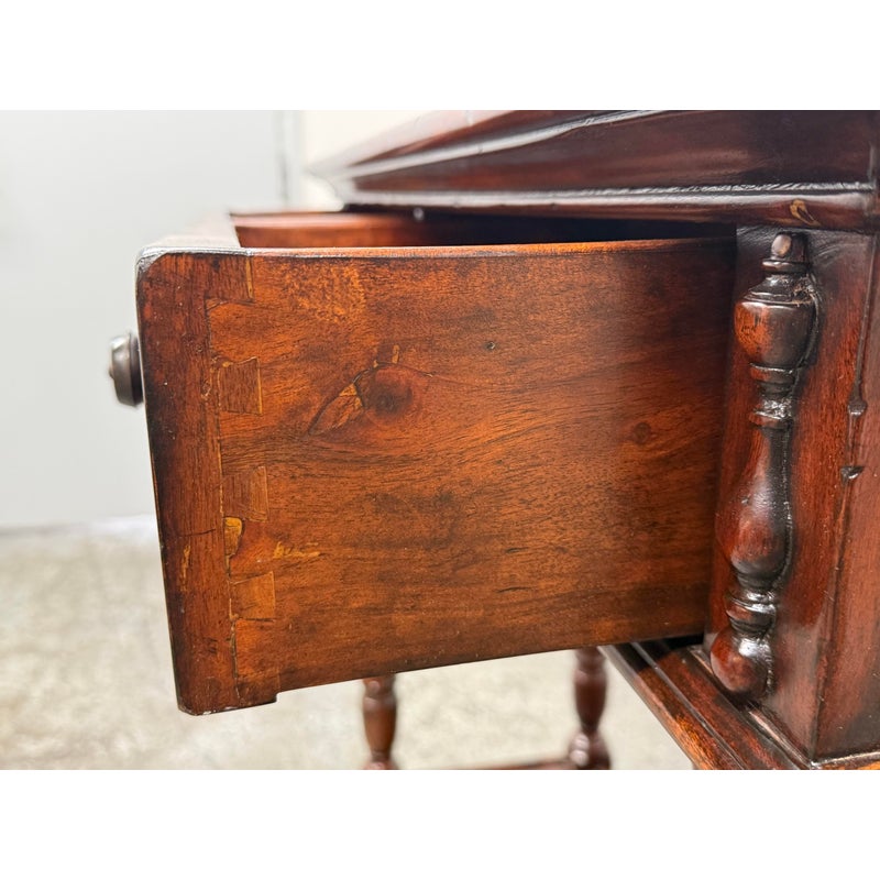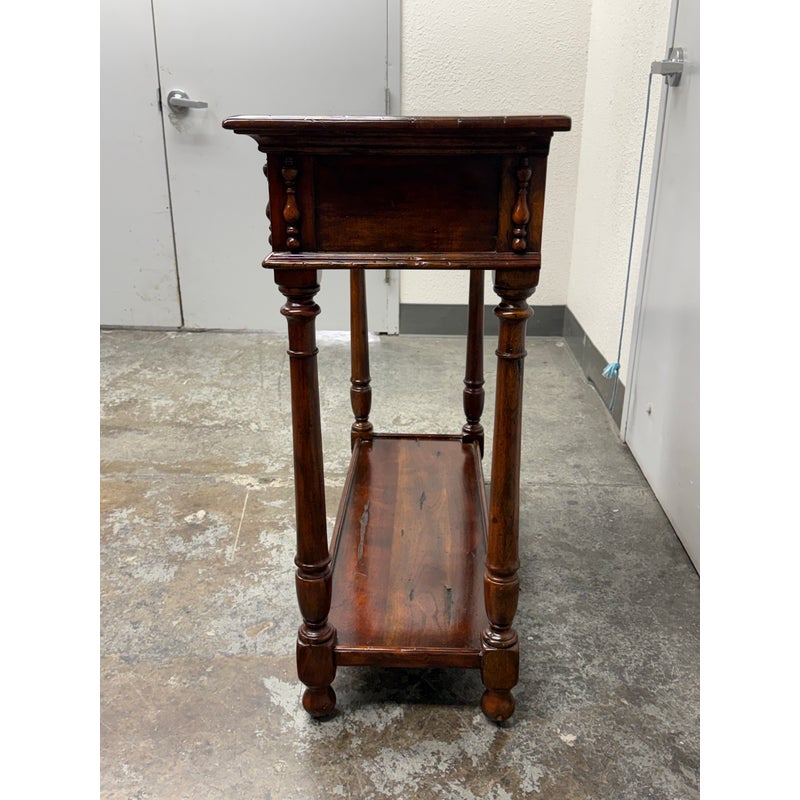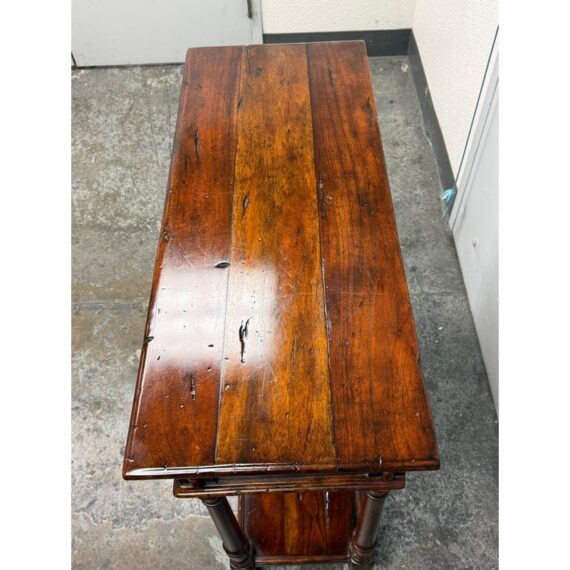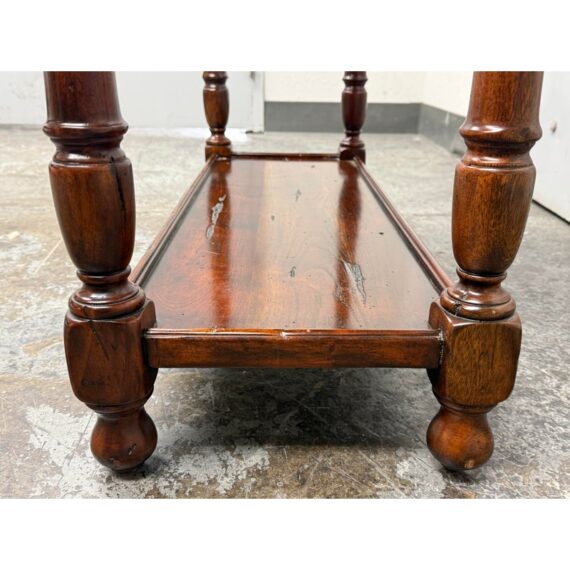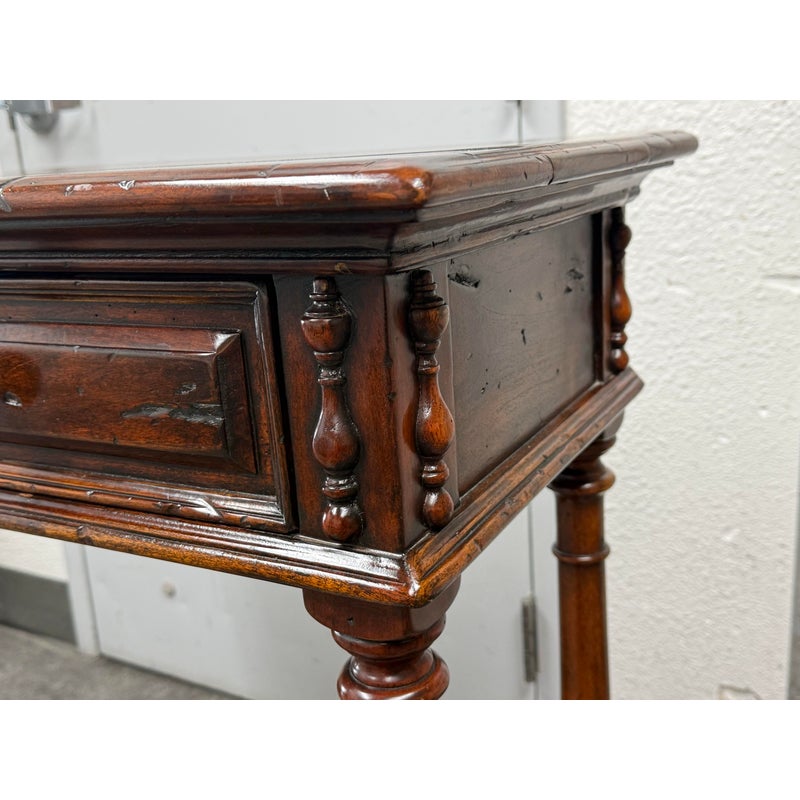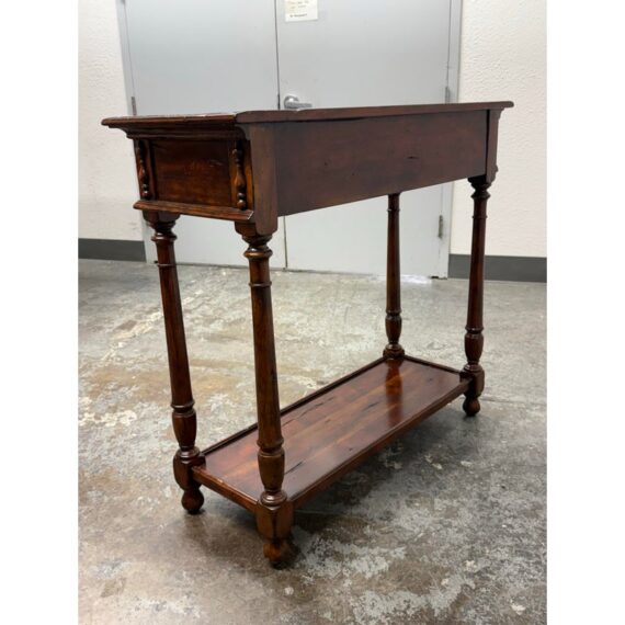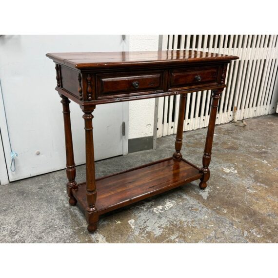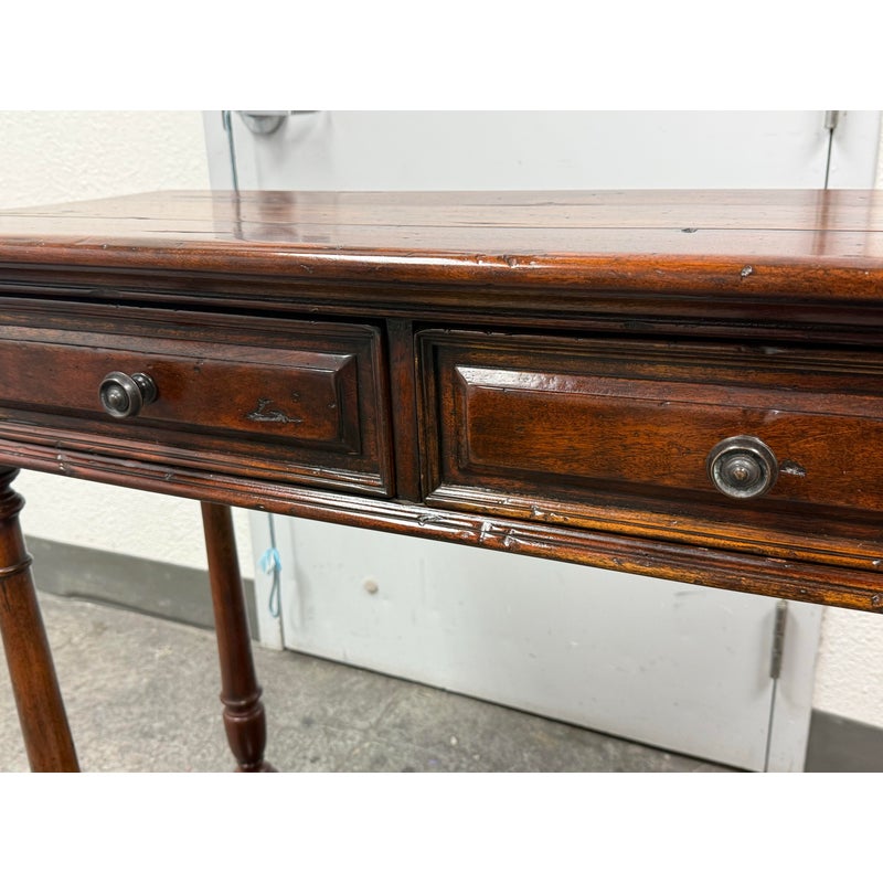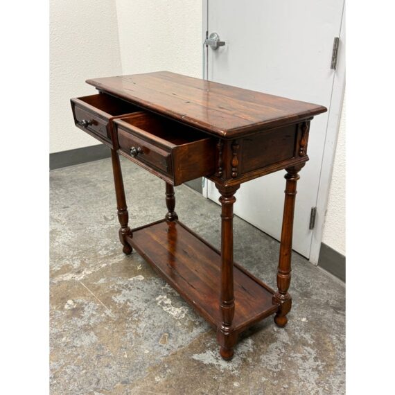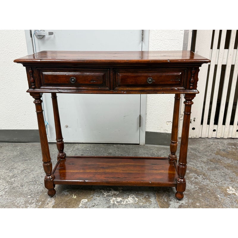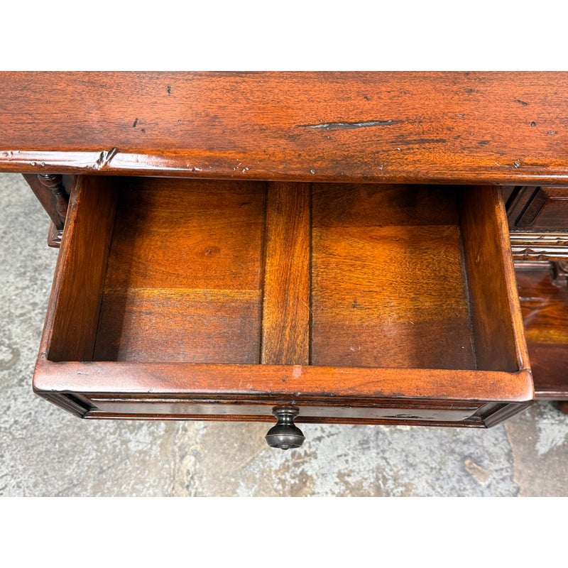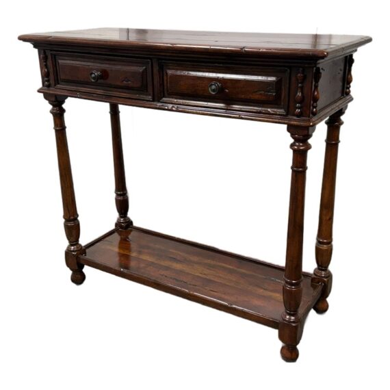 Design Plus Gallery presents the a Vintage Style Mahogany Console Table from ABC Carpet & Home for their Diffusion Line ABC Vintage. The console has classic examples of English Traditional styling with an auburn finish. The surface is smooth with beveled edge and two drawers at the top with knob drawer pulls. The legs are all identical with turned and shapely carvings and a lower shelf. It is in good condition overall with minimal visible wear for its usage.
