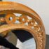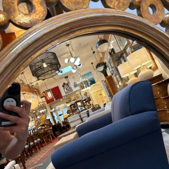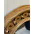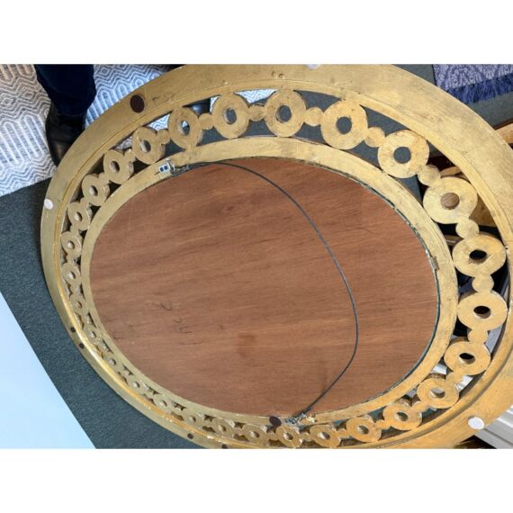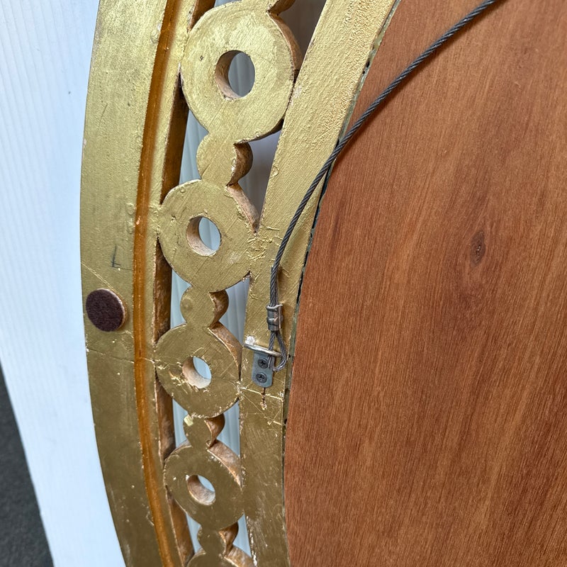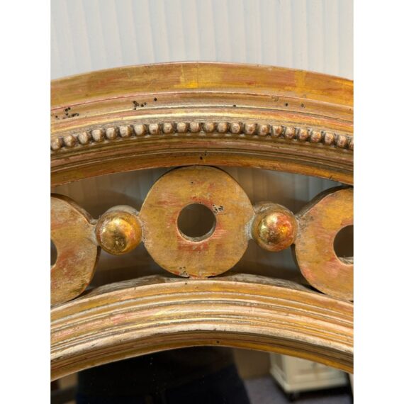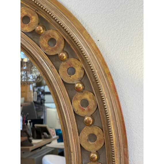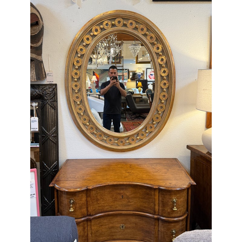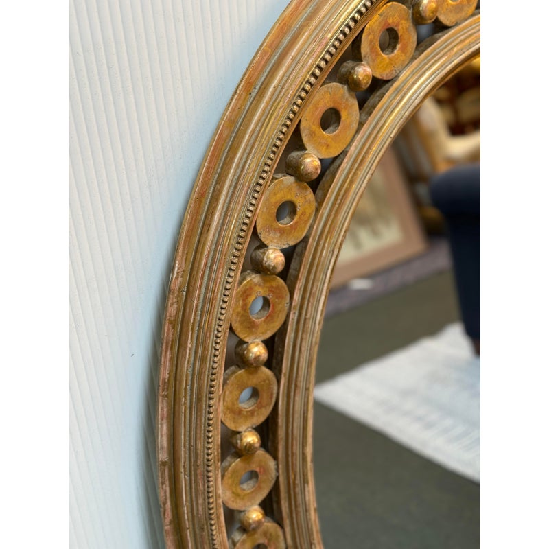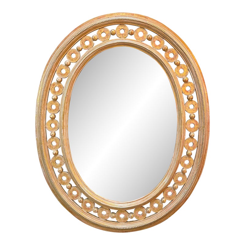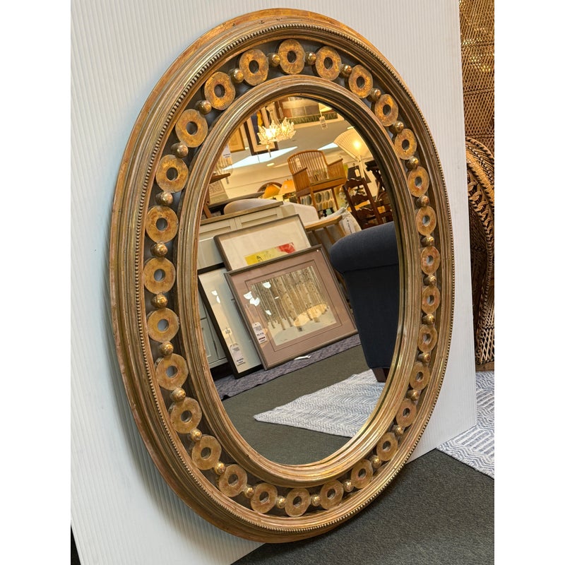 Design Plus Gallery presents a Contemporary Gilt Wall Mirror. The large wood mirror combines traditional elements with modern details for a unique focal point. A traditional oval shape with bevels and dentil patterns and distressed gilt finish goes to another level with the open and graphic circles within. Lovely with many styles, the mirror reflects your excellent taste. Little wear; condition is good.