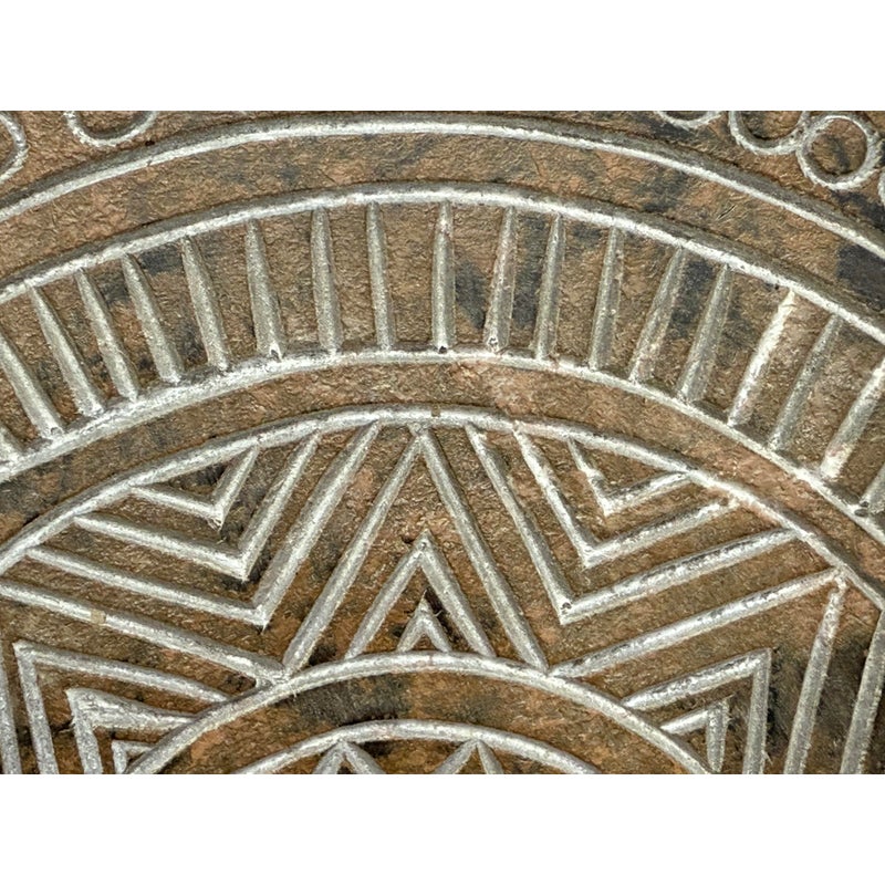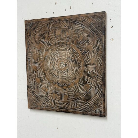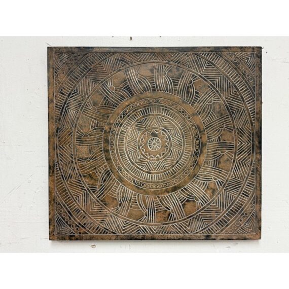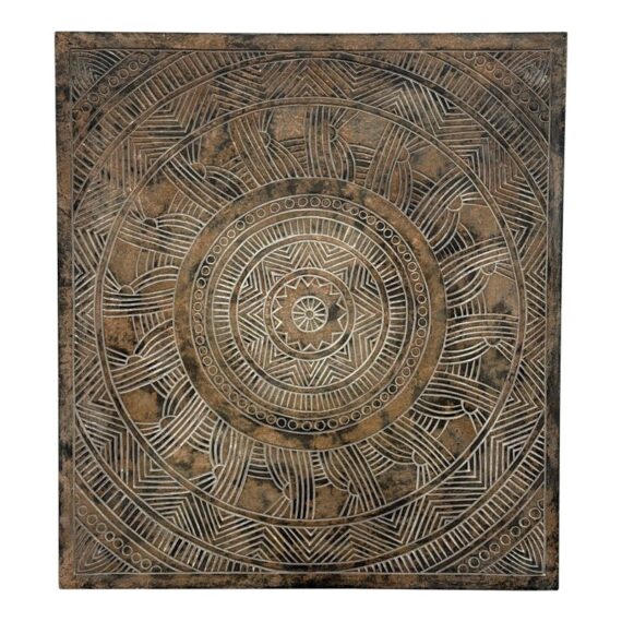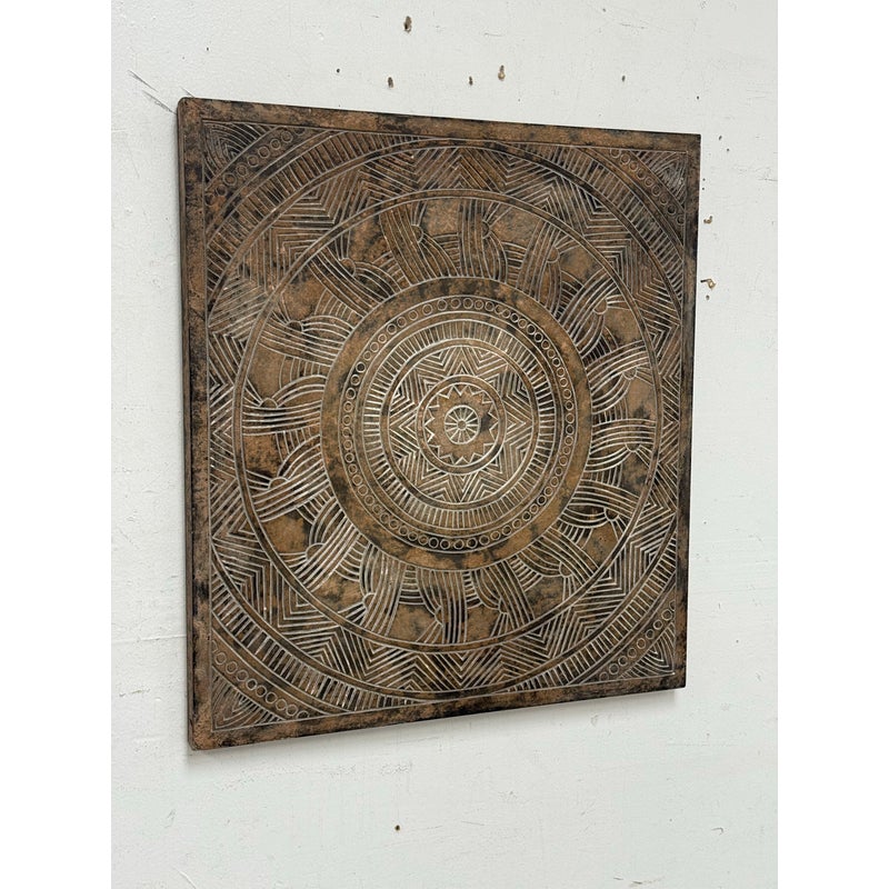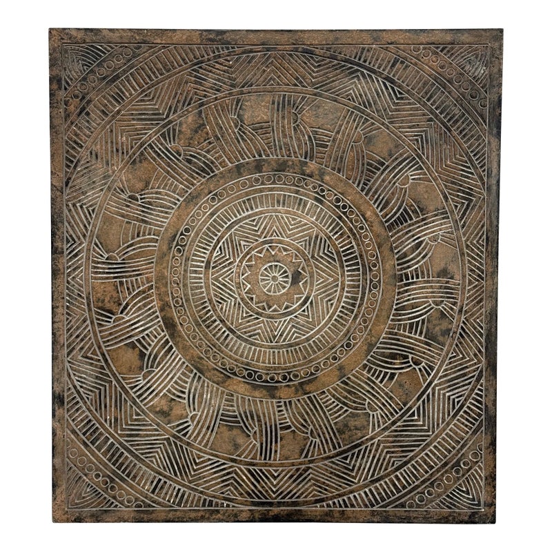 Design Plus Gallery presents a Medallion Wall Plaque.Bring texture and quiet elegance to your space with this carved square frame showcasing a mandala at its heart. The frame’s distressed brown finish reveals subtle, made intentionally bare patches that suggest a life well lived. In contrast, the mandala is kept in a light, matte finish that brightens the relief and draws the eye to its balanced geometry. Equally at home in bohemian, rustic, or modern settings, this piece adds warmth without overpowering, making it a versatile focal point for many spaces. In good condition, visible and minimal wear.