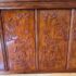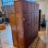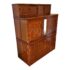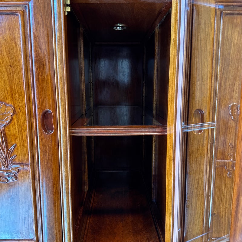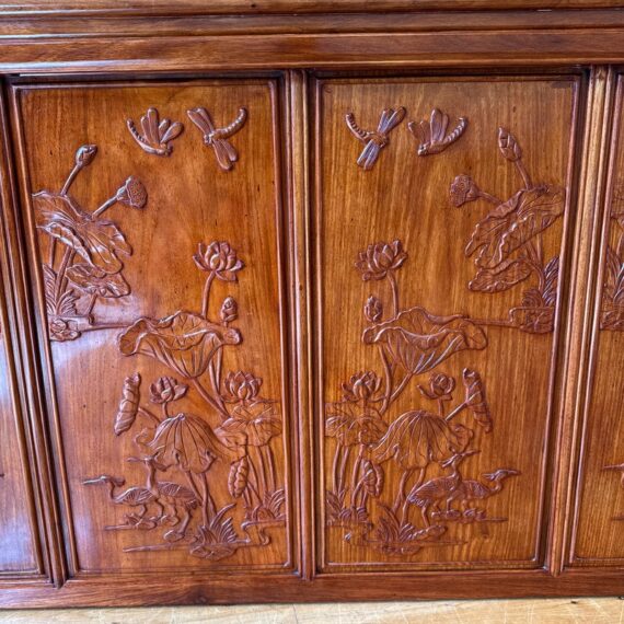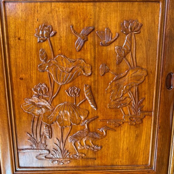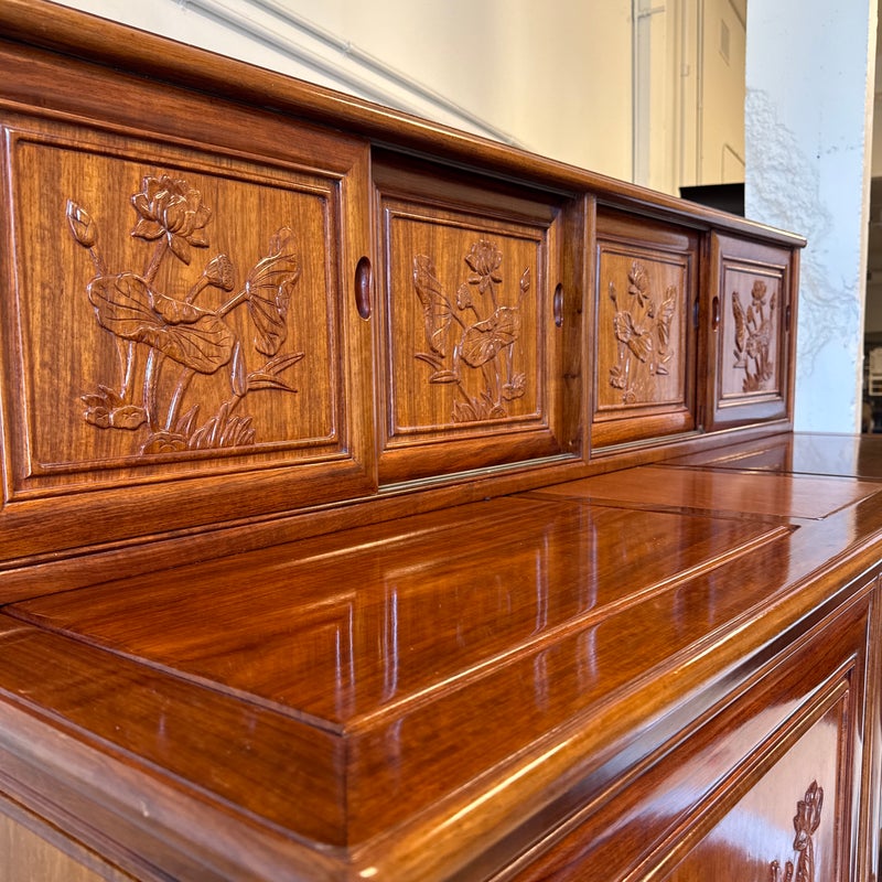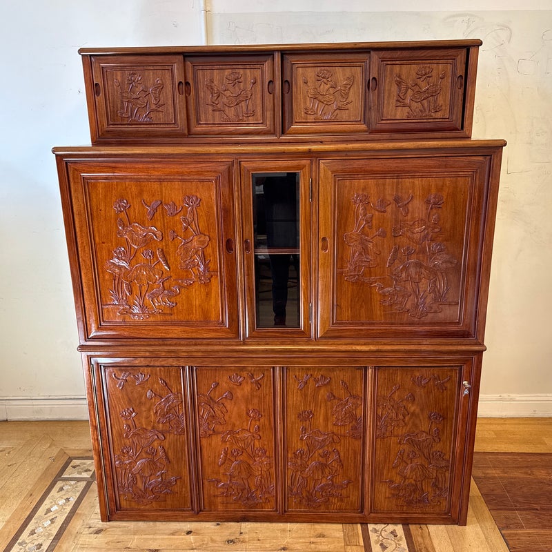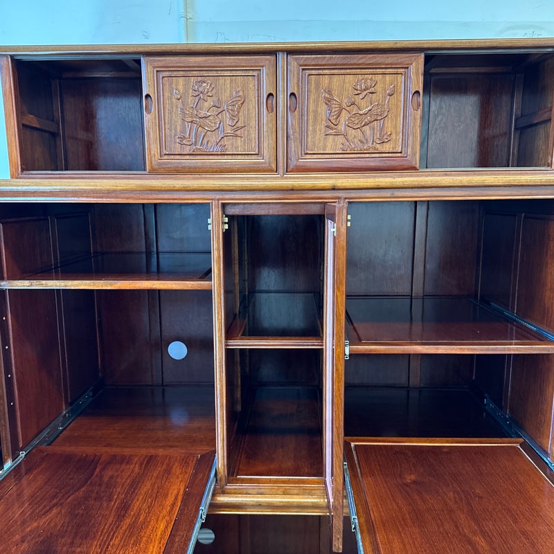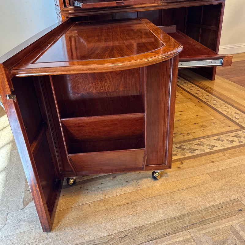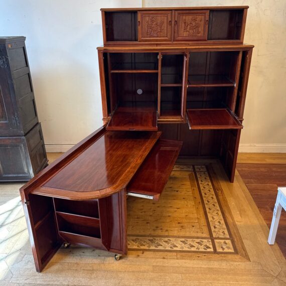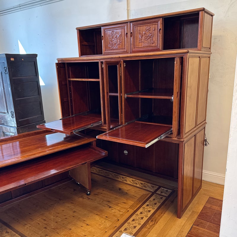 Design Plus Gallery presents an Three Piece Chinoiserie Workstation. A strikingly well crafted office station completely closes up into a piece of art for your home or work place. The bottom portion swings outward with casters to reveal a nicely composed desk with its dual level surfaces and shelving. The middle section has pull out shelving for ease of reach, maneuverability. The upper unit has sliding cabinet doors for storage as well. All sides are finished and the front has lovingly crafted floral patterns. Is in good solid condition with minimal wear for its usage.