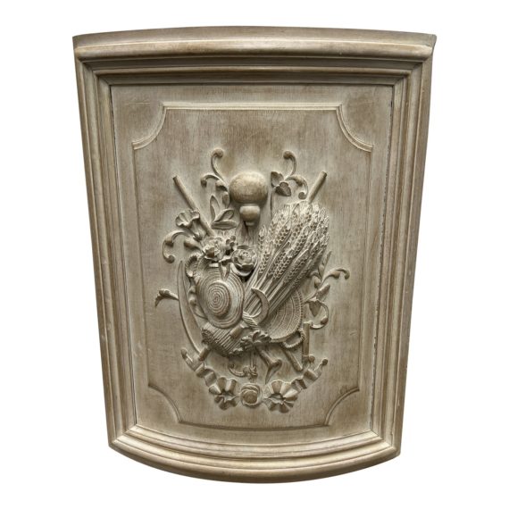 Design Plus Gallery presents a Carved Walnut Wood Panel. The panel is constructed with walnut wood and is rectangular with an outward curve. The middle of the panel features a carved-in motif of harvest plants and tools. Near the perimeter runs a rounded wood accent. Minor wear from use; panel is in good condition.