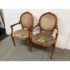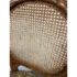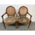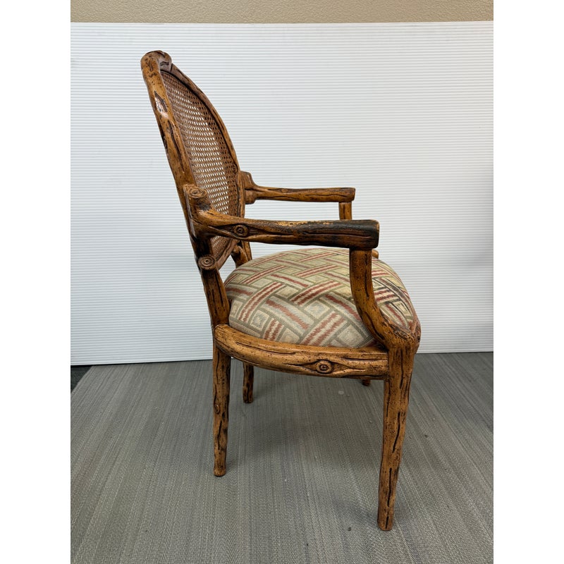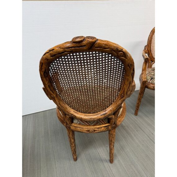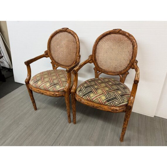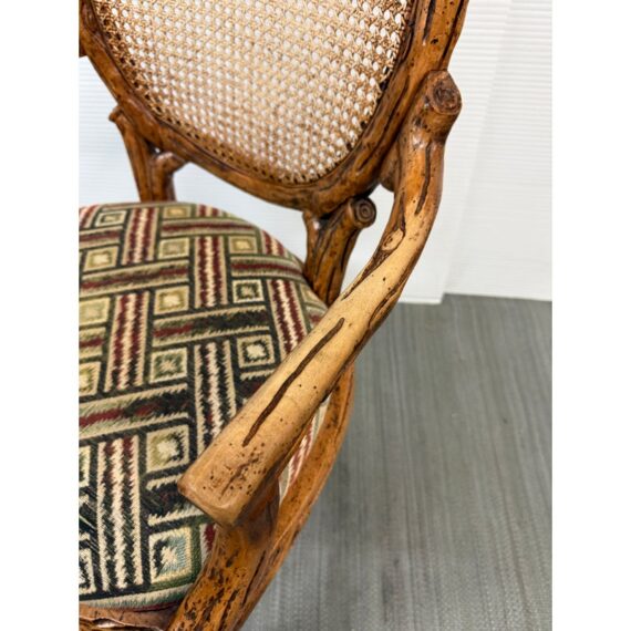 Design Plus Gallery presents a Pair of Caned Back Arm Chairs. The likely vintage chairs have a distressed and notched wood appearance to the frame that is craftsmanlike and unique. The seat back of wicker, cane gives it a casual feel while the seat cushion of velvet captivates in its funky pattern work. The chairs are both in good condition for their usage with some sun exposure to their upholstery and small breaks to the wicker.