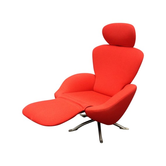 Design Plus Gallery brings us a Red k10 Dodo Swivel Armchair by Cassina, designed by Toshiyuki Kita. The chair is on a fixed base which can become a chaise-longue with different tilting positions. The back and footrest are movable; the different positions can be adjusted respectively through the use of a small lever operating a gas spring and of one side handle.