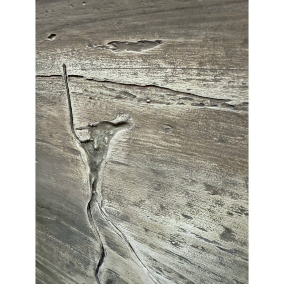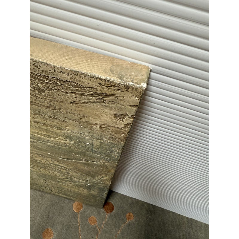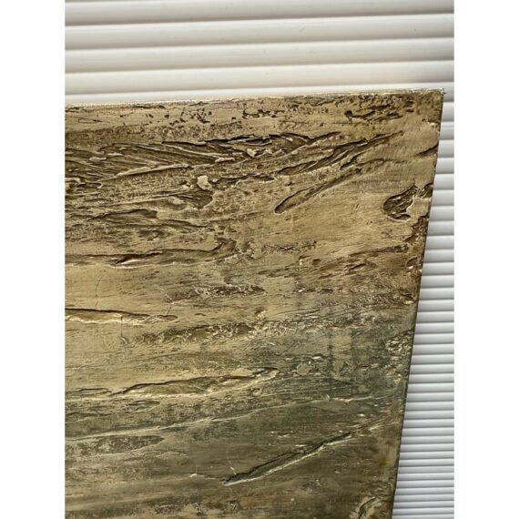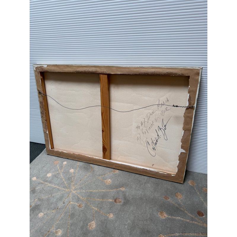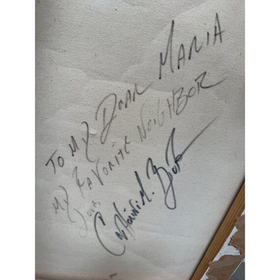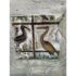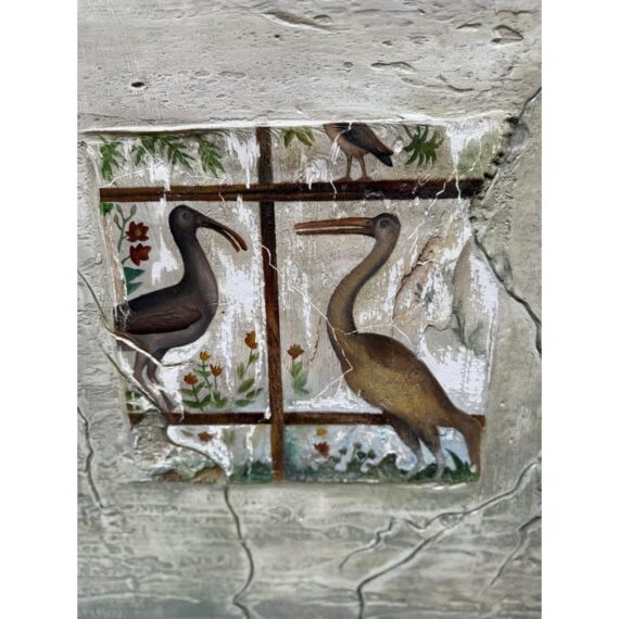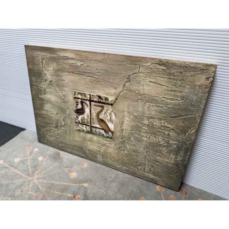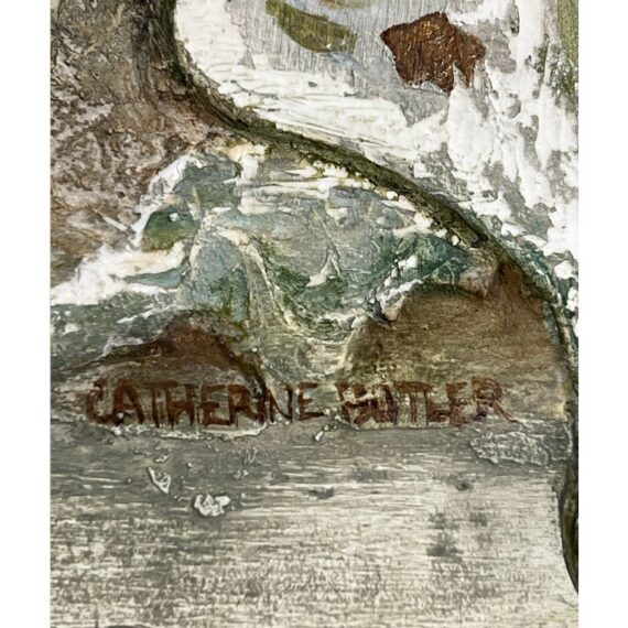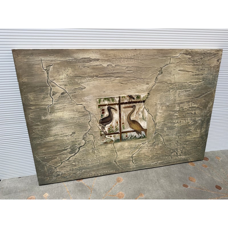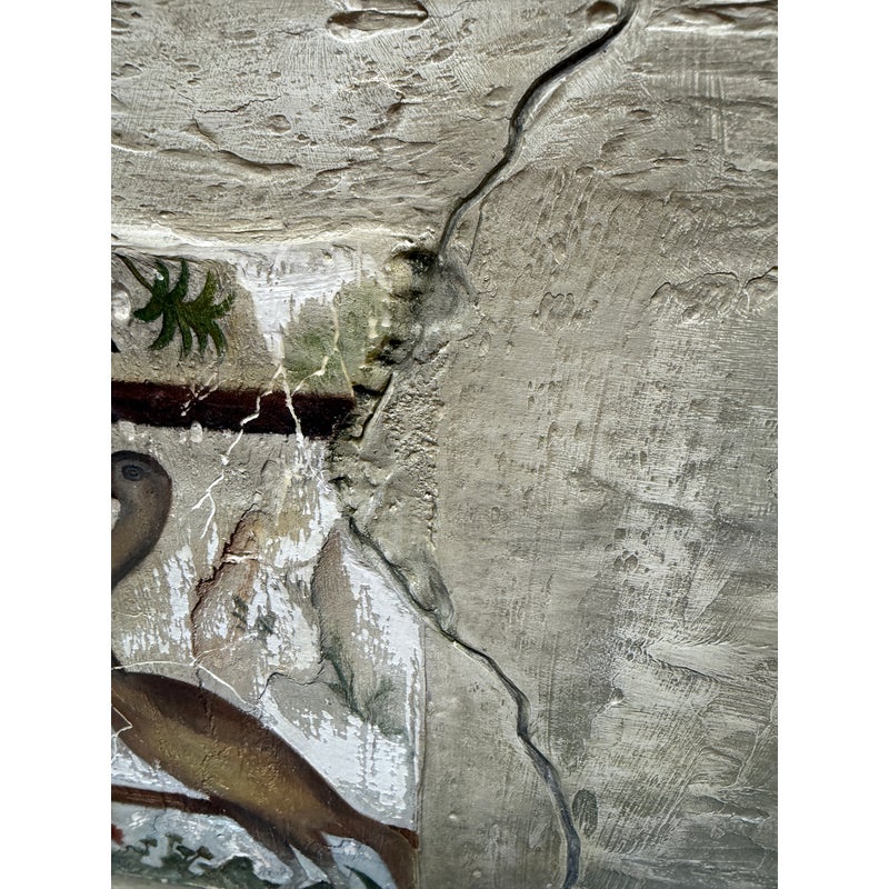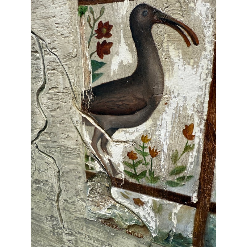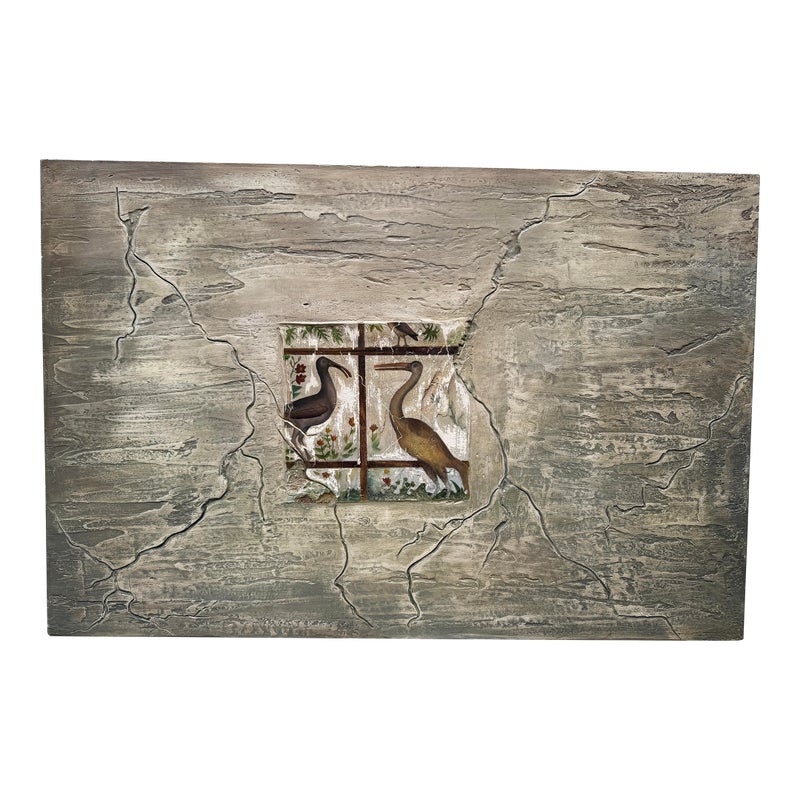 Design Plus Gallery presents “Favorite Neighbor” a Mixed Media Artwork by Catherine Butler. Observed through a window, or in front of a fence, the pair of large birds share a moment. Like a tile pushing out of stone, the image takes center stage on the canvas. Signed by artist on lower left of image and on back panel. Small surface wear on artwork; condition is fair.