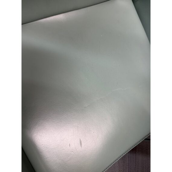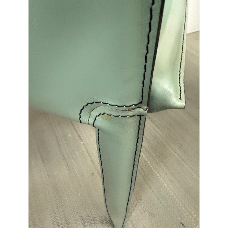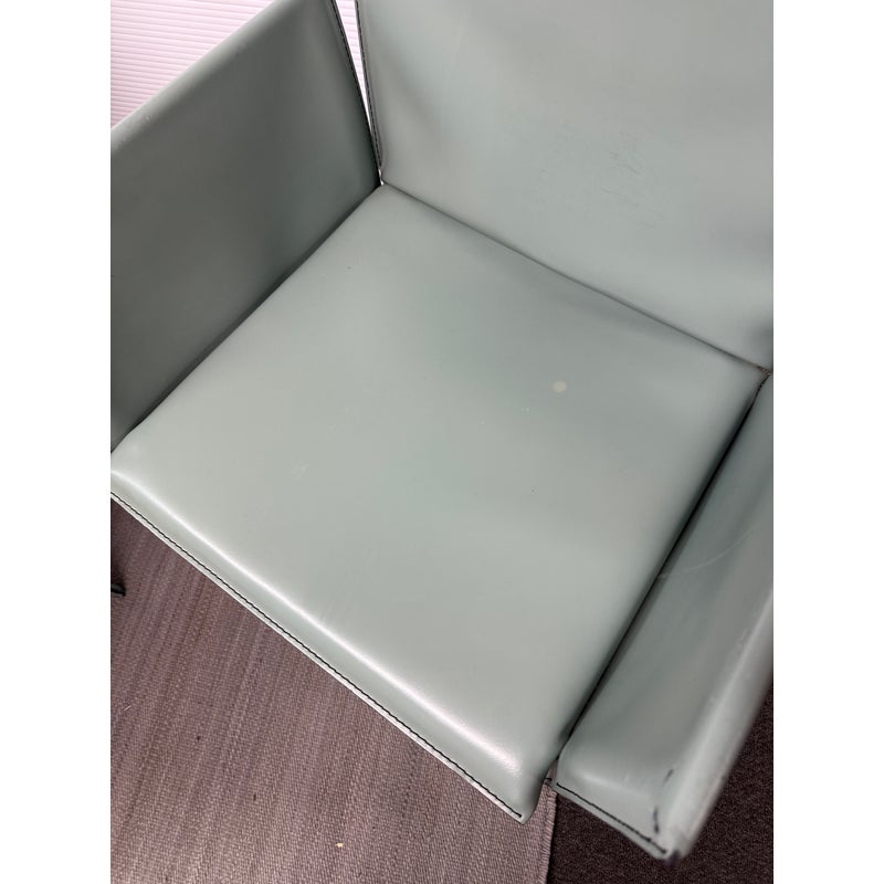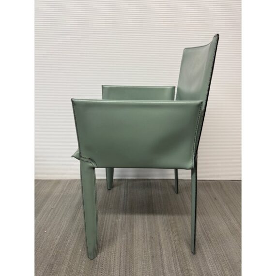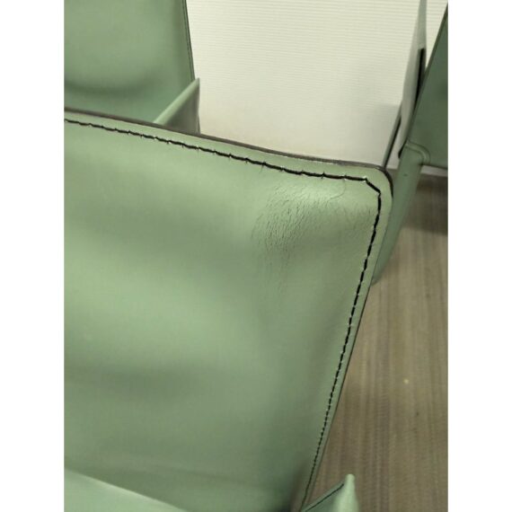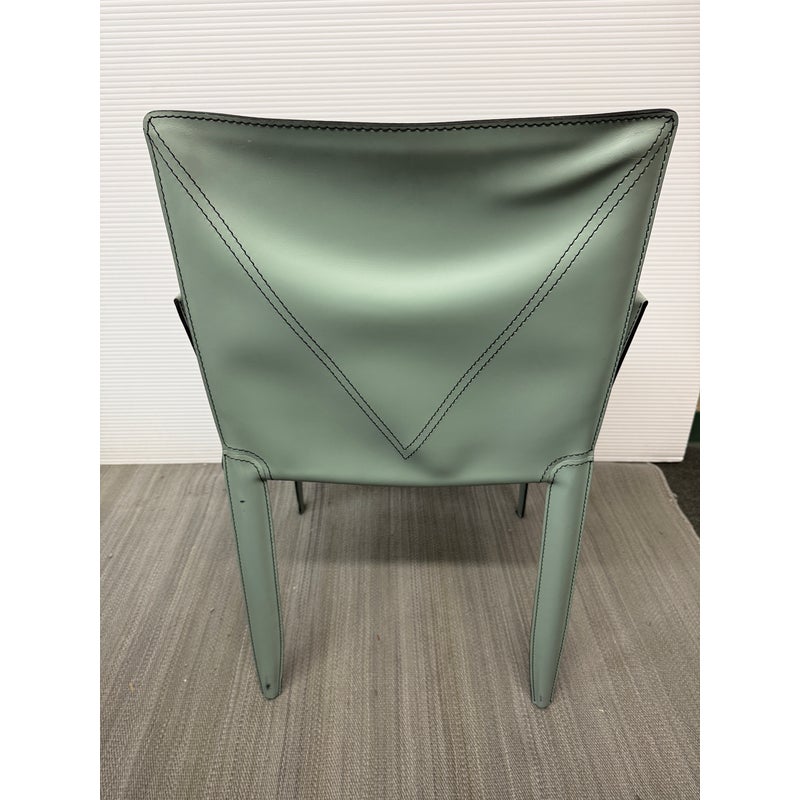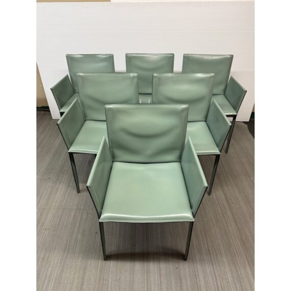 Design Plus Gallery presents a Set of Six Piuma Dining Chairs from Cattelan Italia. These elegant chairs combine an unmistakable personality with comfort and ergonomics. They feature an overstitch pattern as an outline and in a pattern on the back. The modern armchairs are exceptionally lightweight and practical, the steel frame is wrapped from tip to toe in pale green leather. Light surface wear; condition is good for age and use. Made in Italy.