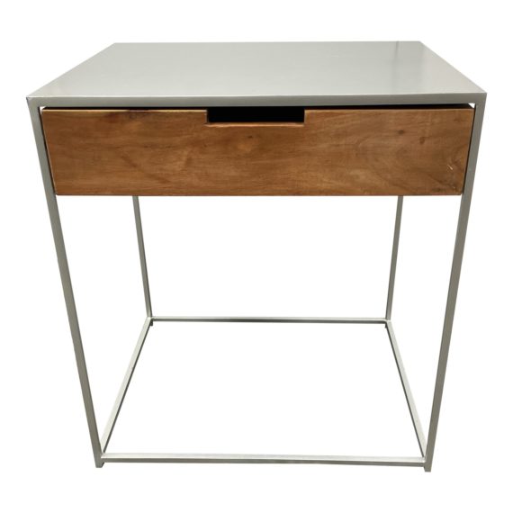 Design Plus Gallery presents a Audrey Side Table by CB2. A mix master. Sleek industrial style storage adds edge in an eclectic mix of delustered metal and warm wood. Handcrafted iron frame with hand-antiqued patina plays cool off the warmth of solid sustainable acacia wood drawer. The beauty is in the details, exposed joint welding shows the mark of a metal smith. Drawer glide opens to reveal precise dovetail joinery. Natural knots, varying grain and warm light-to-dark tones in wood make each piece unique. Makes a clever side table in living room or night