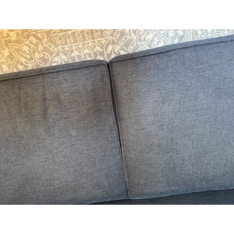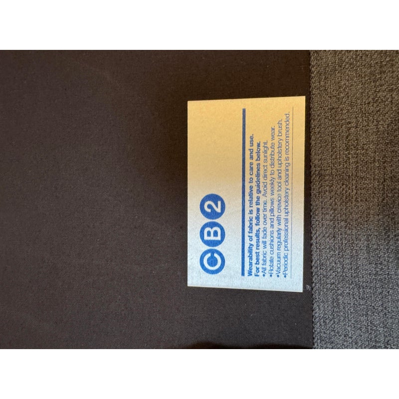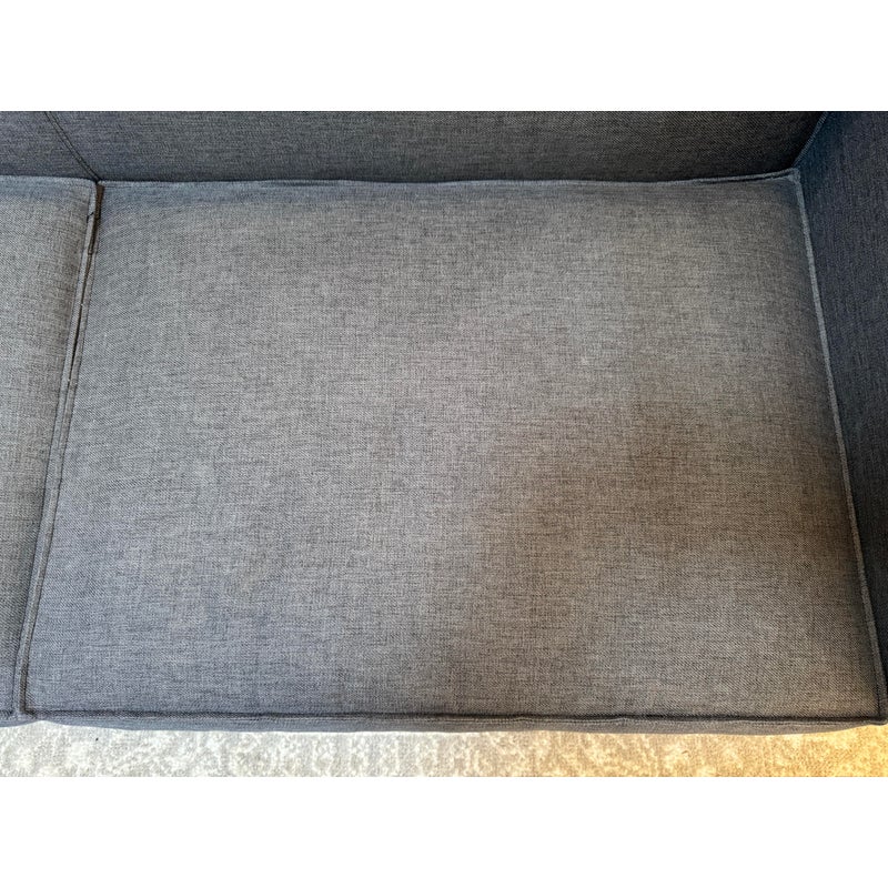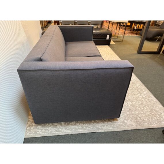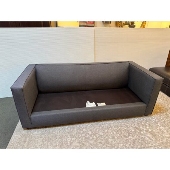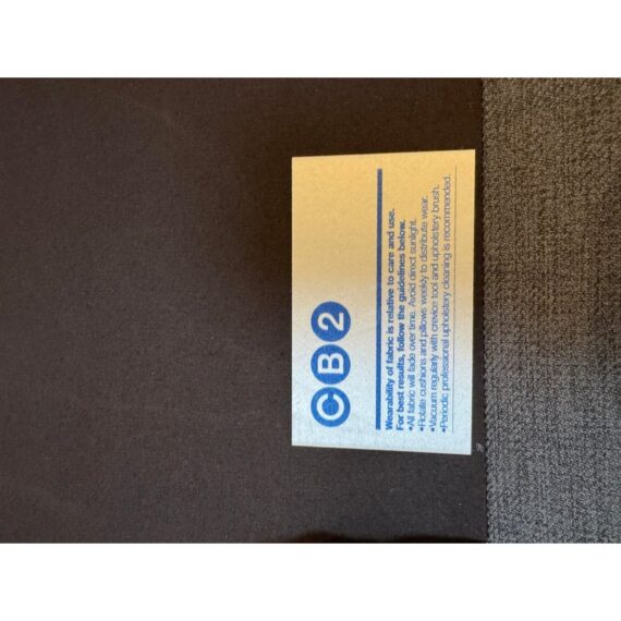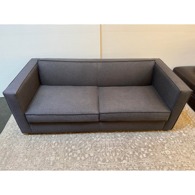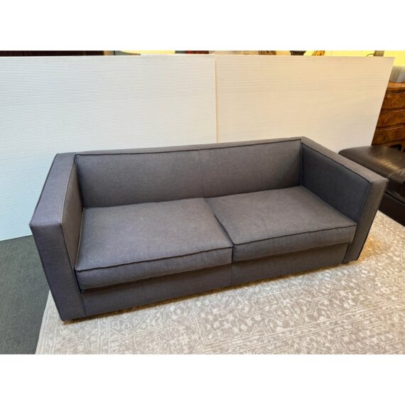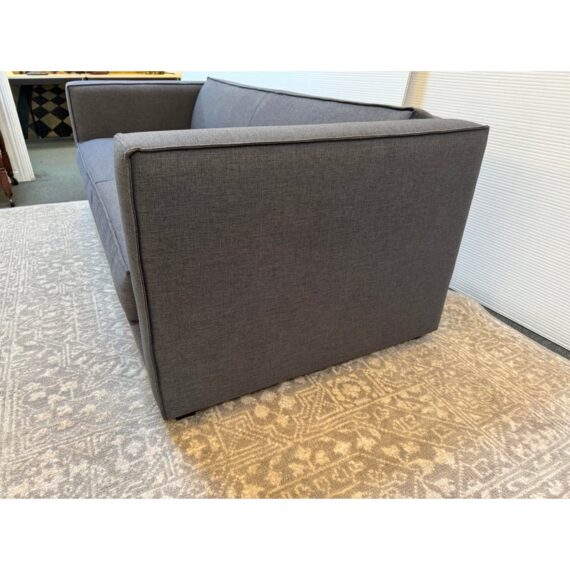 Design Plus Gallery presents a Club Grey Fabric Sofa from CB2. This compact club sofa reinvents tradition with a bold, boxy silhouette distinguished by an exaggerated flange, lending dynamic, tailored definition from every angle. Designed for both statement and snugness, the sofa’s seat cushion features a casual, intentional overhang while the gently curved backrest cradles and supports exactly where you want it. Expertly benchmade, the kiln-dried hardwood frame ensures lasting durability, resisting warping over time. The seat cushion combines soy-based polyfoam and fiber for eco-friendly plushness, while the sinuous wire suspension system maximizes comfort and resilience. Upholstered in grey fabric, this two-seater fits seamlessly into any modern or transitional space. In good condition, visible and minimal wear from usage. Made in USA.