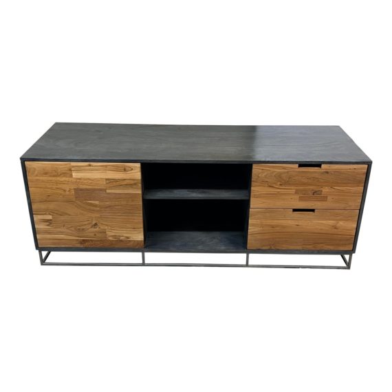 Design Plus Gallery presents a Congo Wood Media Console by Cb2. Dark mango wood and veneers frames natural teak active with beautiful light and dark wood grains with a waxed finish. Two open component middle cubbies are flanked by drawers on the right and a door shelves, leaving lots of room to store audio/video gadgets. The base is a sleek iron frame. Visible and minor wear from usage + age. Made in India.