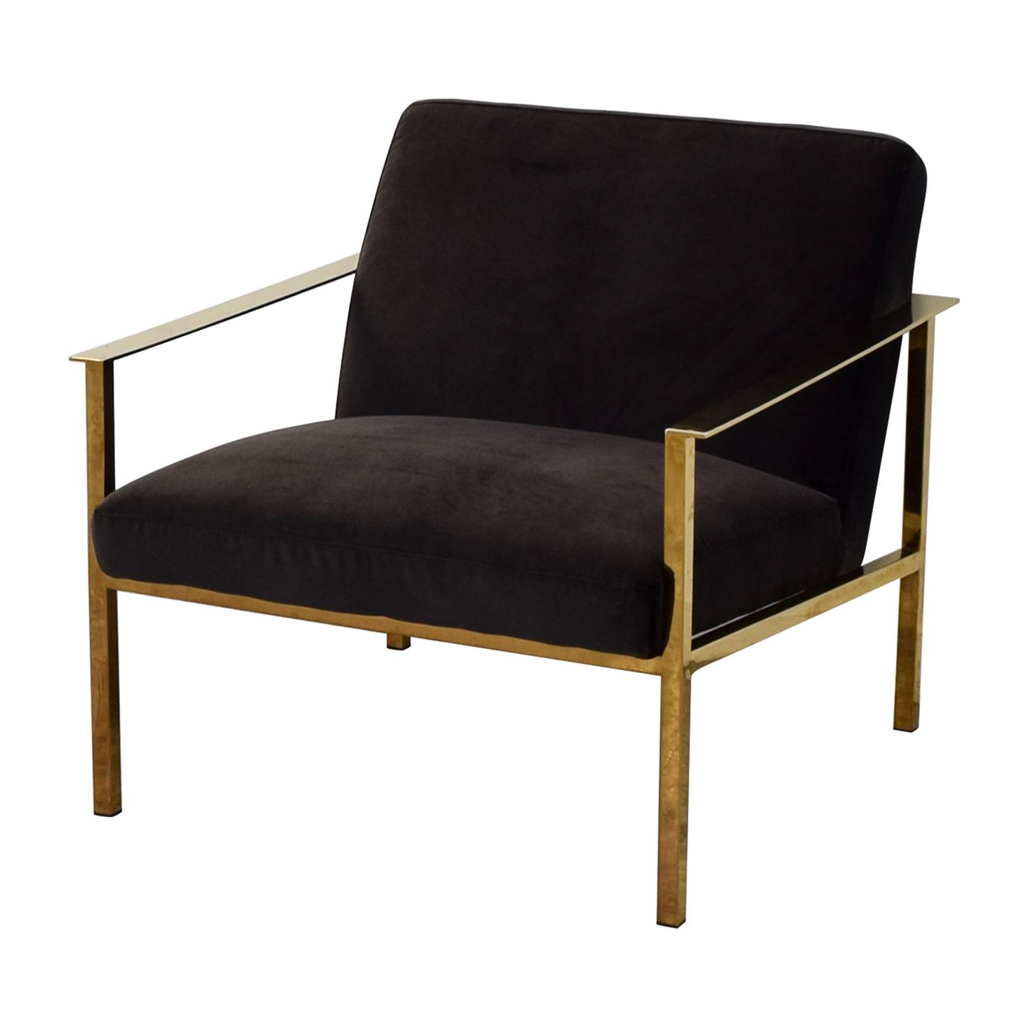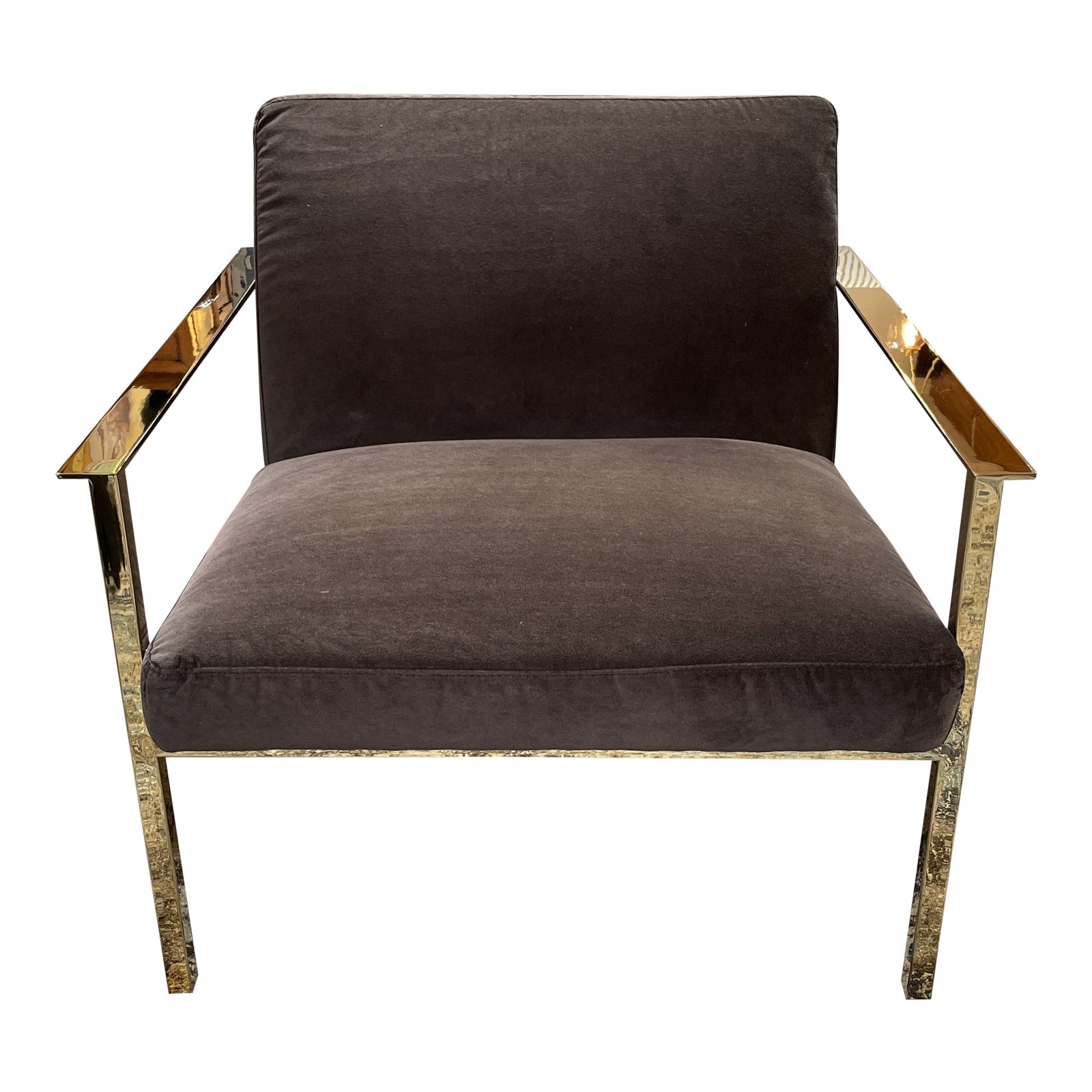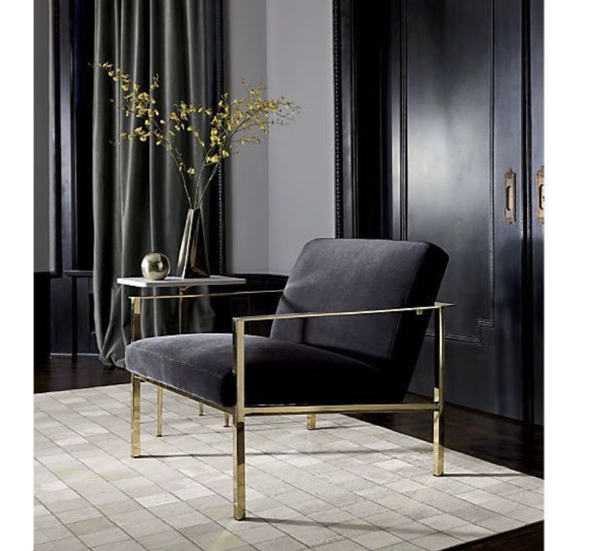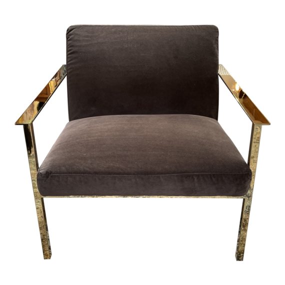 Design Plus Gallery presents a Cue Carbon Chair by CB2. Designed by Mermelada Estudio, a luxe lounger leans ultra modern in shiny brass and moody carbon. Sleek, square base sits low-ish to the ground with an extra-deep seat and wide back perfectly angled for comfort. The upholstery is a Dale, Carbon, a classic polyester velvet woven for durability and softness. Minor wear. Arm Height: 22 inches, Seat Height: 16inches