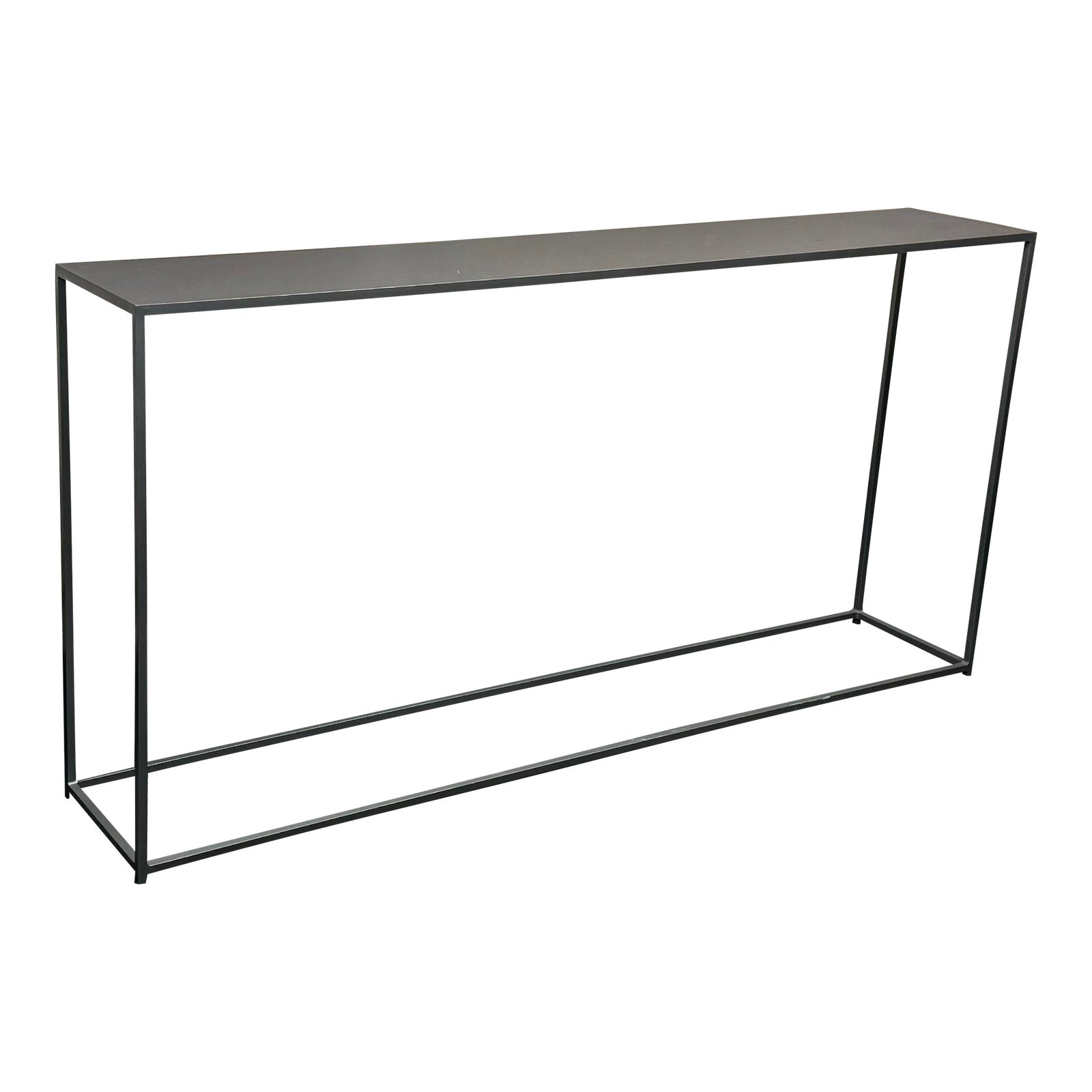 Design Plus Gallery presents a Mills Narrow Slim Console by CB2. Constructed from metal, a modern and industrial look that will complement any contemporary space. The clean and sleek frame of the table is sturdy and durable, making it perfect for displaying decorative items or as a functional surface for everyday use. The narrow design of the console table allows it to fit seamlessly in small spaces such as hallways, entryways, or behind a sofa. In good condition, visible and minor wear from usage + age. This is a discontinued model. Made in India.