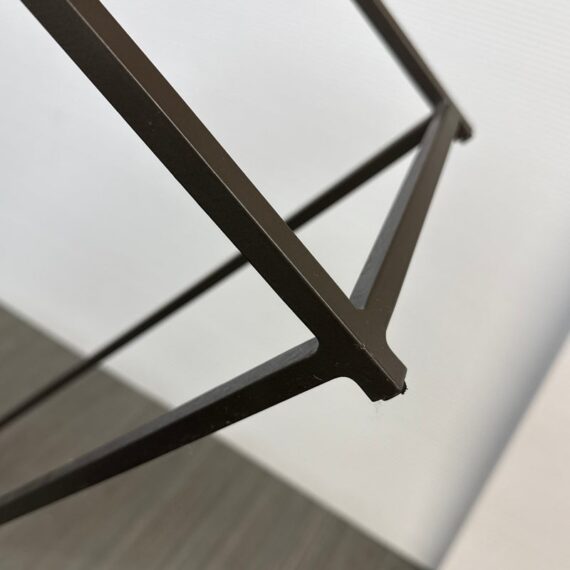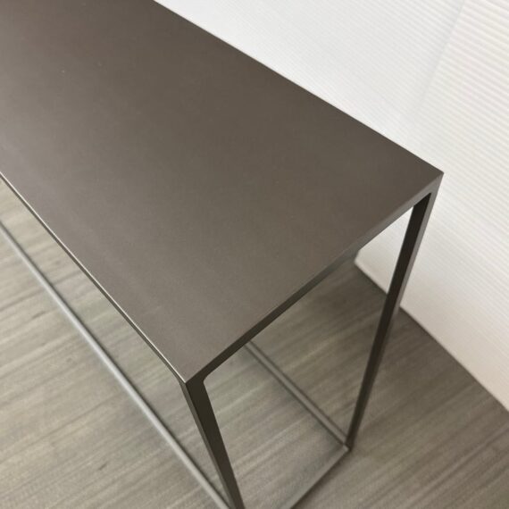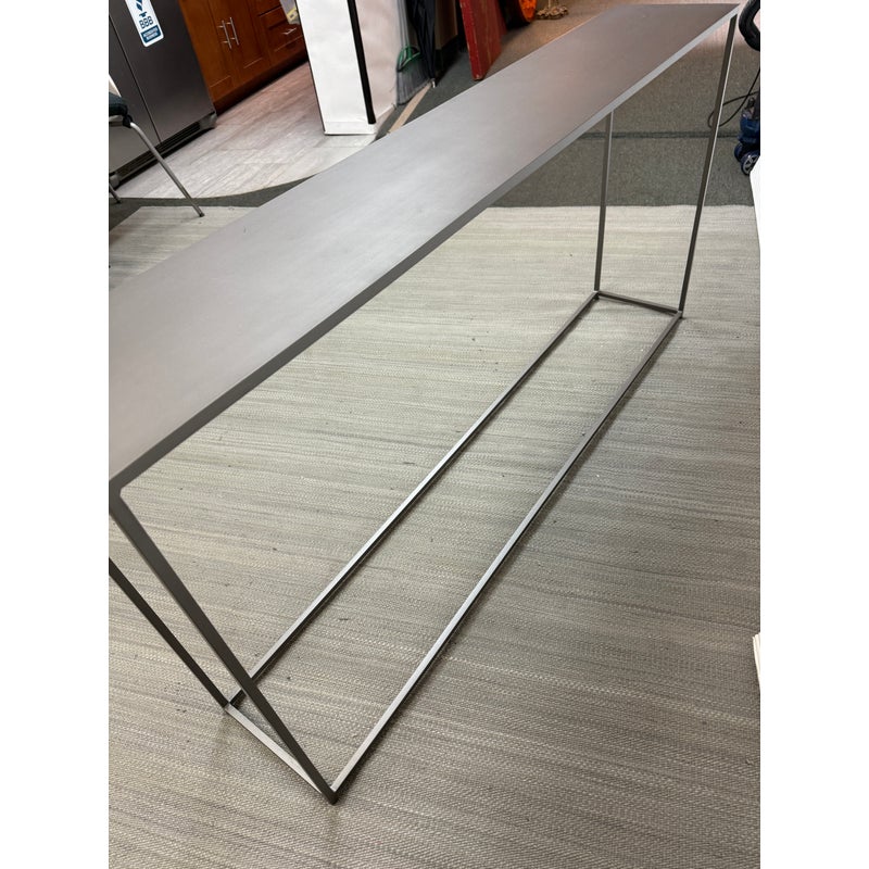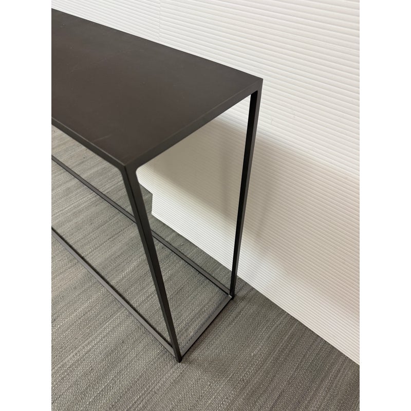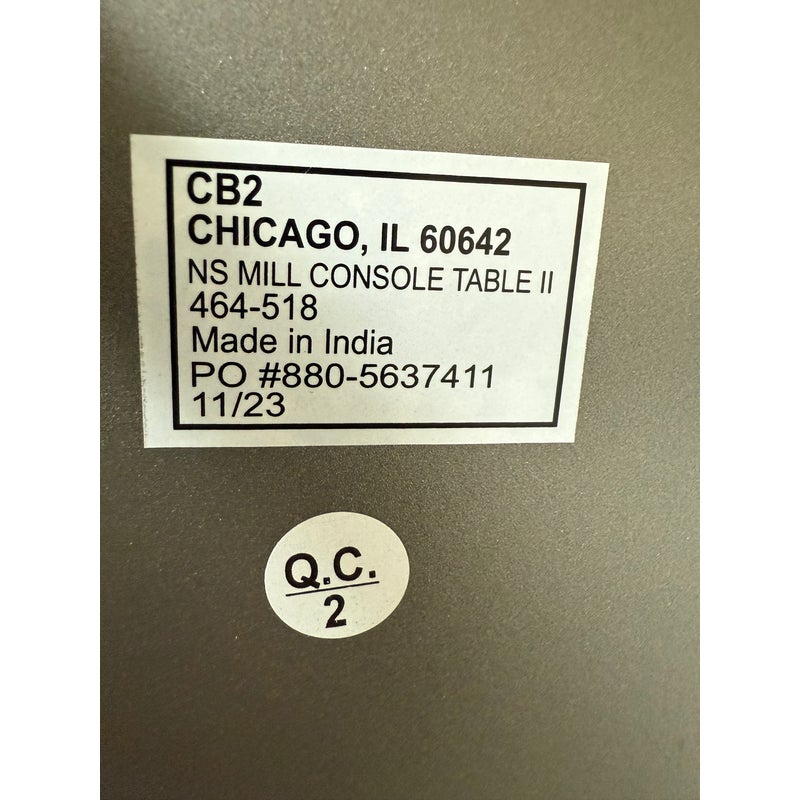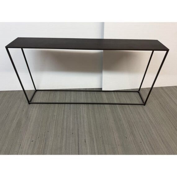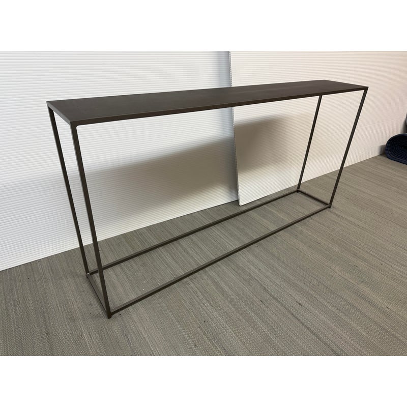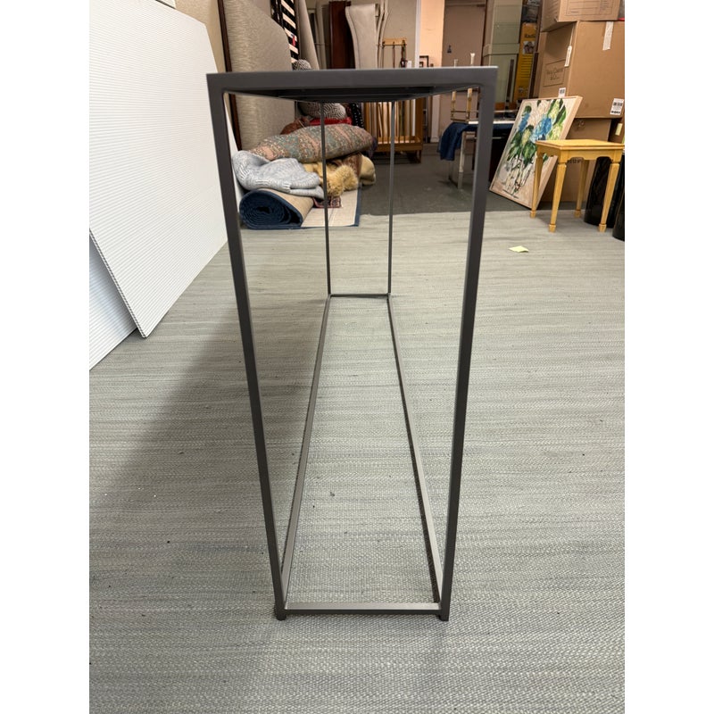 Design Plus Gallery presents a Mills Narrow Slim Console by CB2. Constructed from metal, this modern and industrial console table exudes a clean and sleek vibe that complements any contemporary space. Its sturdy and durable construction makes it ideal for displaying decorative items or serving as a functional drop zone for everyday use. The narrow design ensures that it fits seamlessly in small spaces like hallways, entryways, or behind a sofa. Condition is good. Made in India.