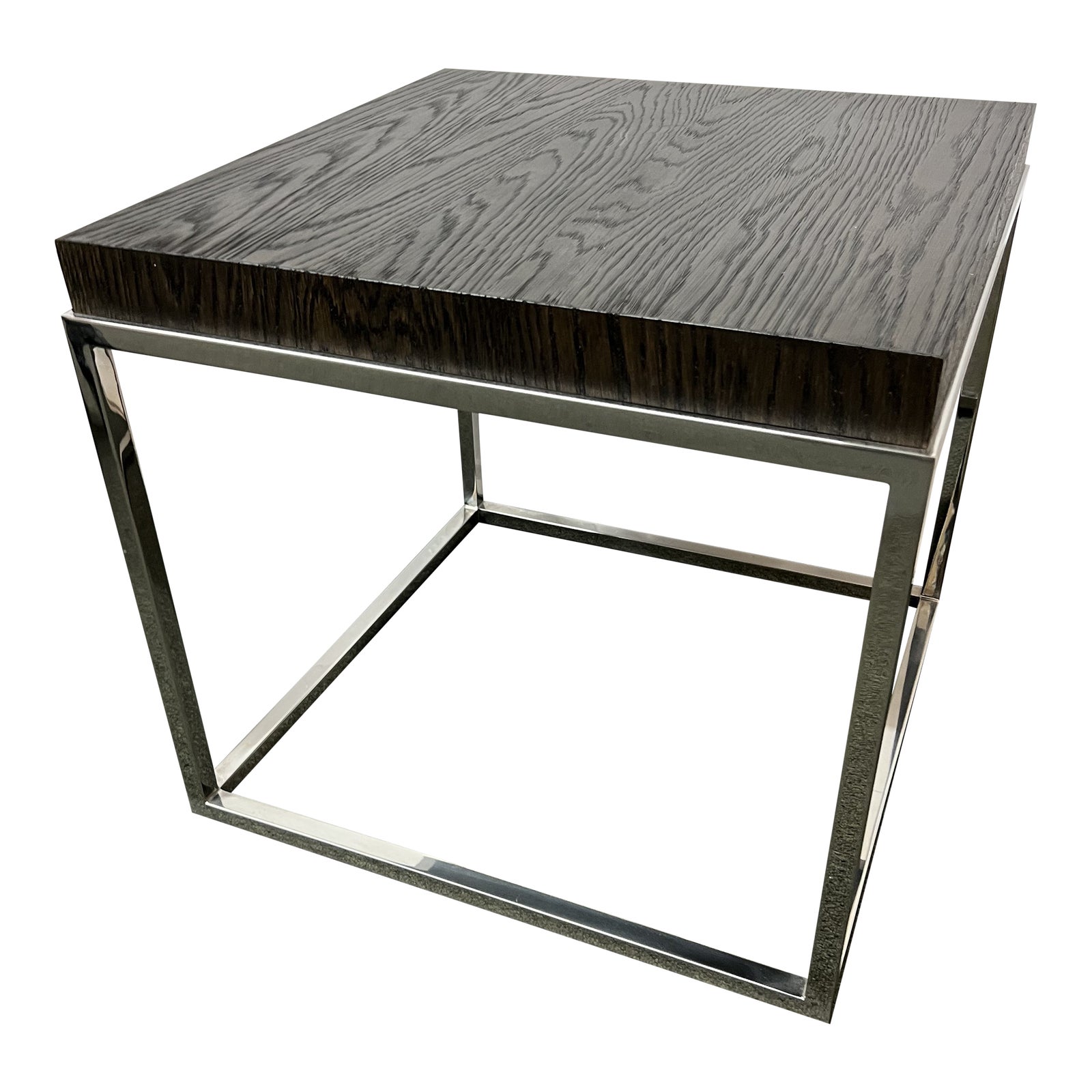 Design Plus Gallery presents the CB2 Nicolas Side Table. Features a chrome base that presents modern appeal via right angles and clean edges. On the base rests a square wood tabletop in a dark finish. The chrome base is barely wider than the tabletop; thus, some chrome stands out underneath the wood on all sides. Minor wear from use; side table is in good condition.