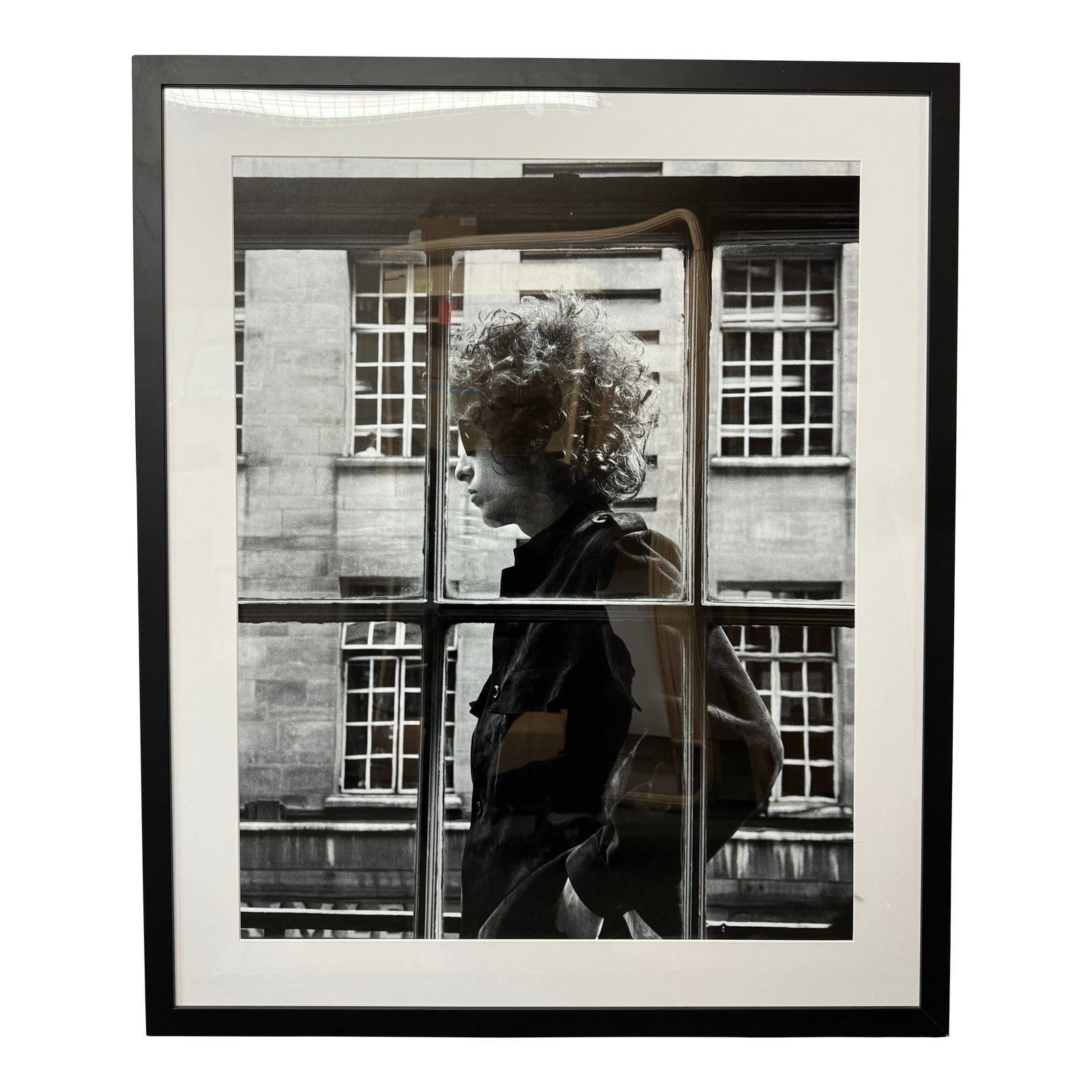 Design Plus Gallery presents a Framed Photo Print of Bob Dylan by CB2. The large image, captured as the artist passed a London shop window in 1966, is matted and mounted in a handmade black finished frame. The hotographic print is on premium archive paper and protected by clear acrylic with UV protection. Little surface wear; condition is good for age and use.