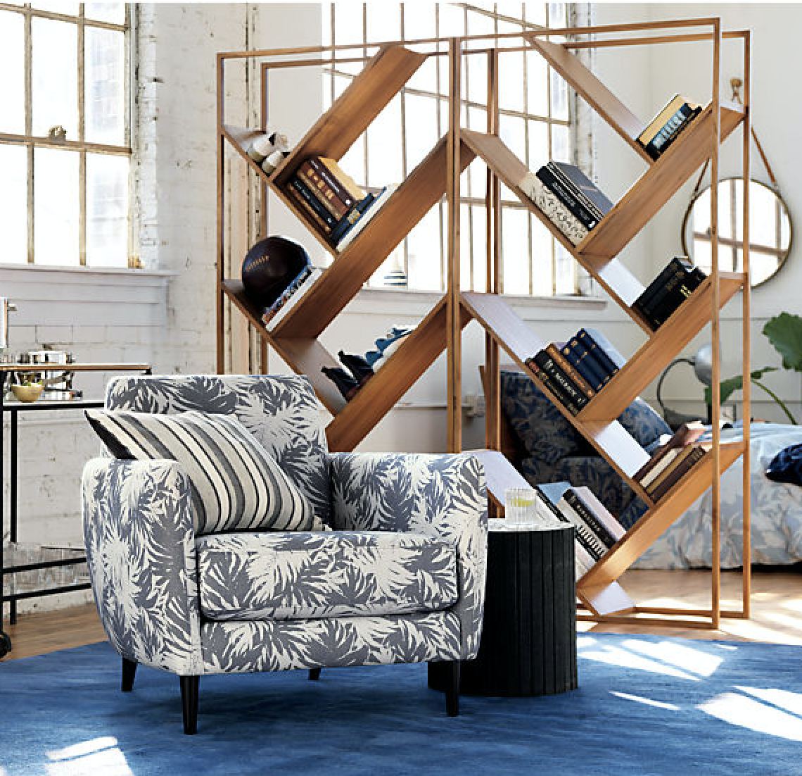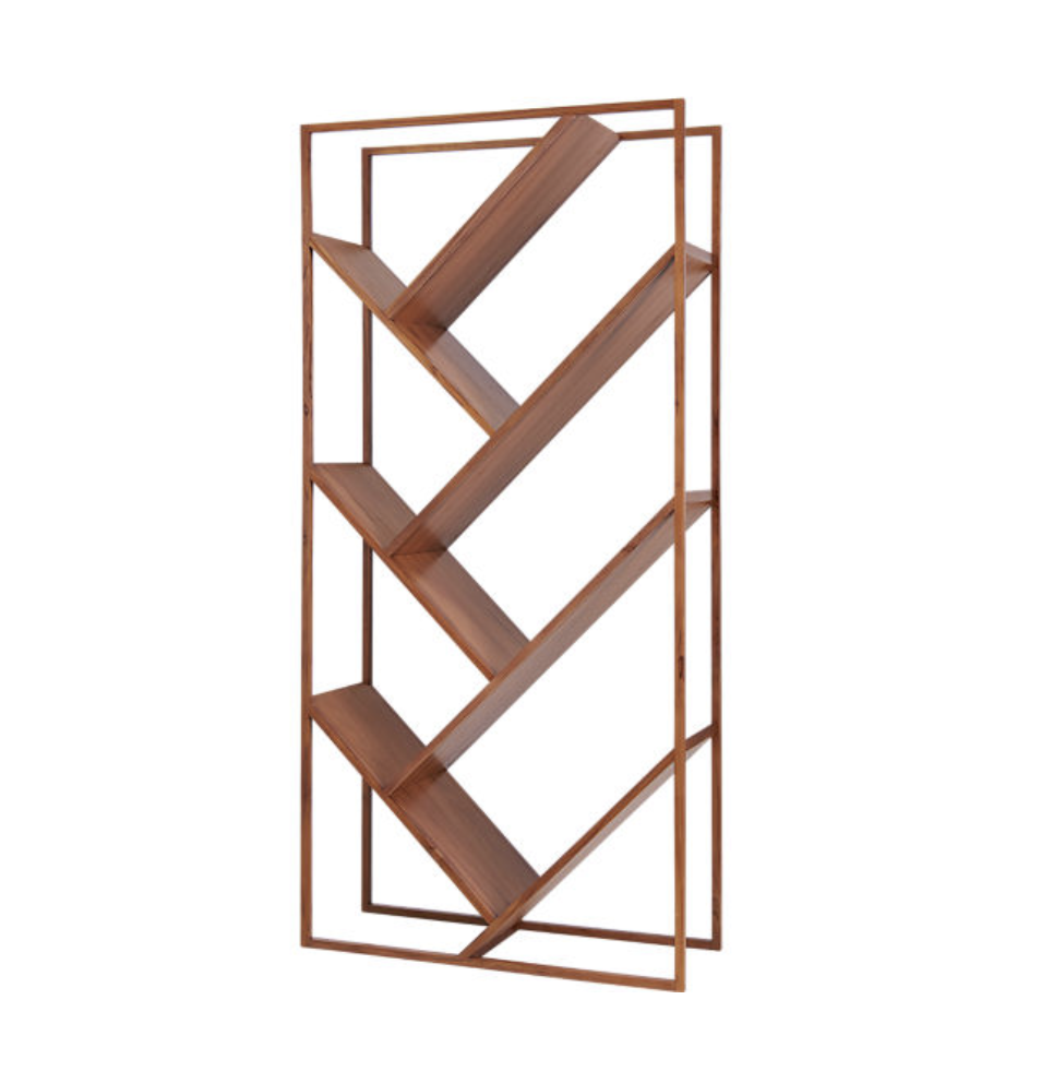 Design Plus Gallery presents the V Bookcase + Room Divider by CB2. Crafted in Teak, and designed by Miron Lior with inventive design angles. Open solid-teak frames slanted shelves in rich wood tones. An open silhouette that can visually break up a large room or divide a small studio. Displays books and disguises clutter.