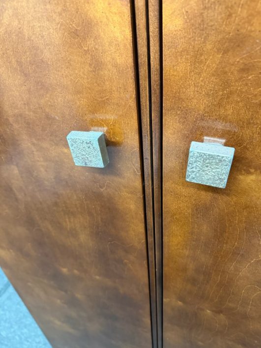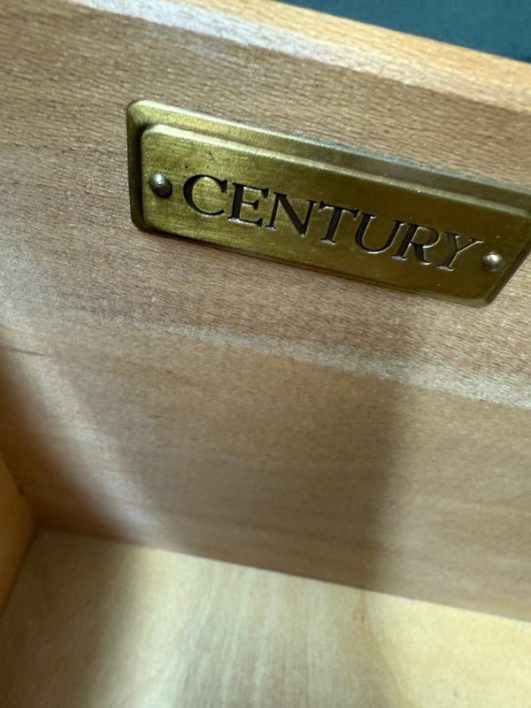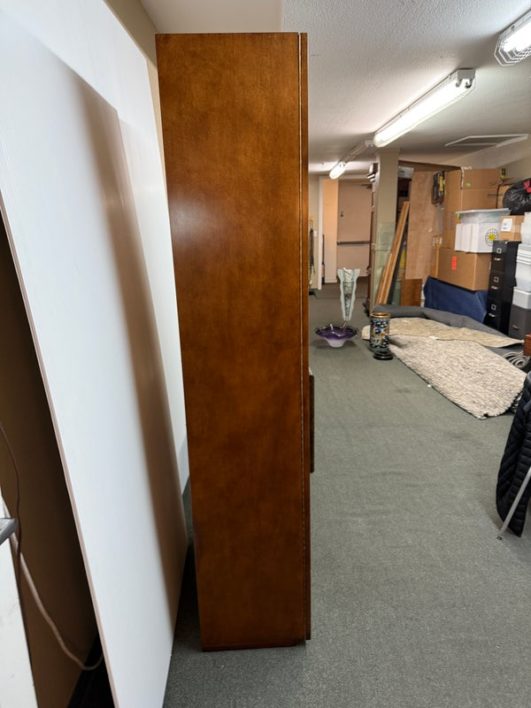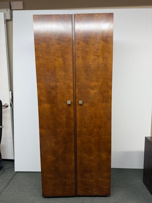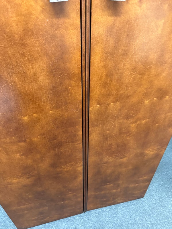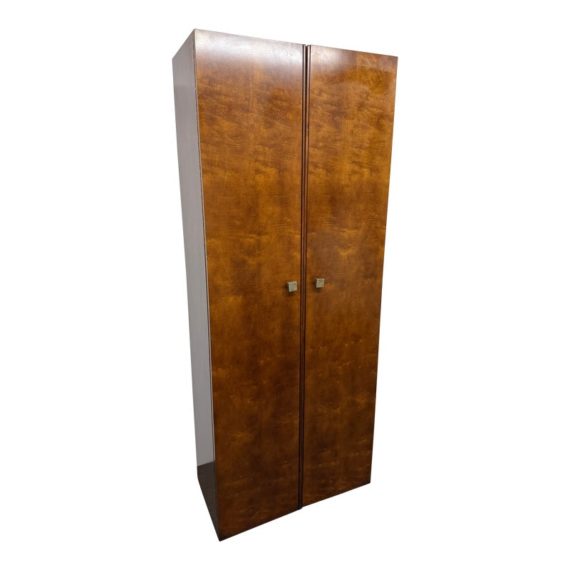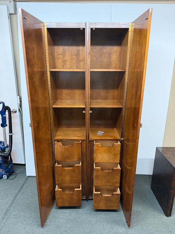 Design Plus Gallery presents a Pair of Burl Wood Cabinets by Century Furniture. Beautiful, narrow and tall, burl wood cabinet by Century Furniture. Well constructed in the US., with six storage drawers below and adjustable shelf storage compartment above. Unfinished exterior panel, the cabinets can be connected to create a single unit. Light surface wear; condition is good for age and use.