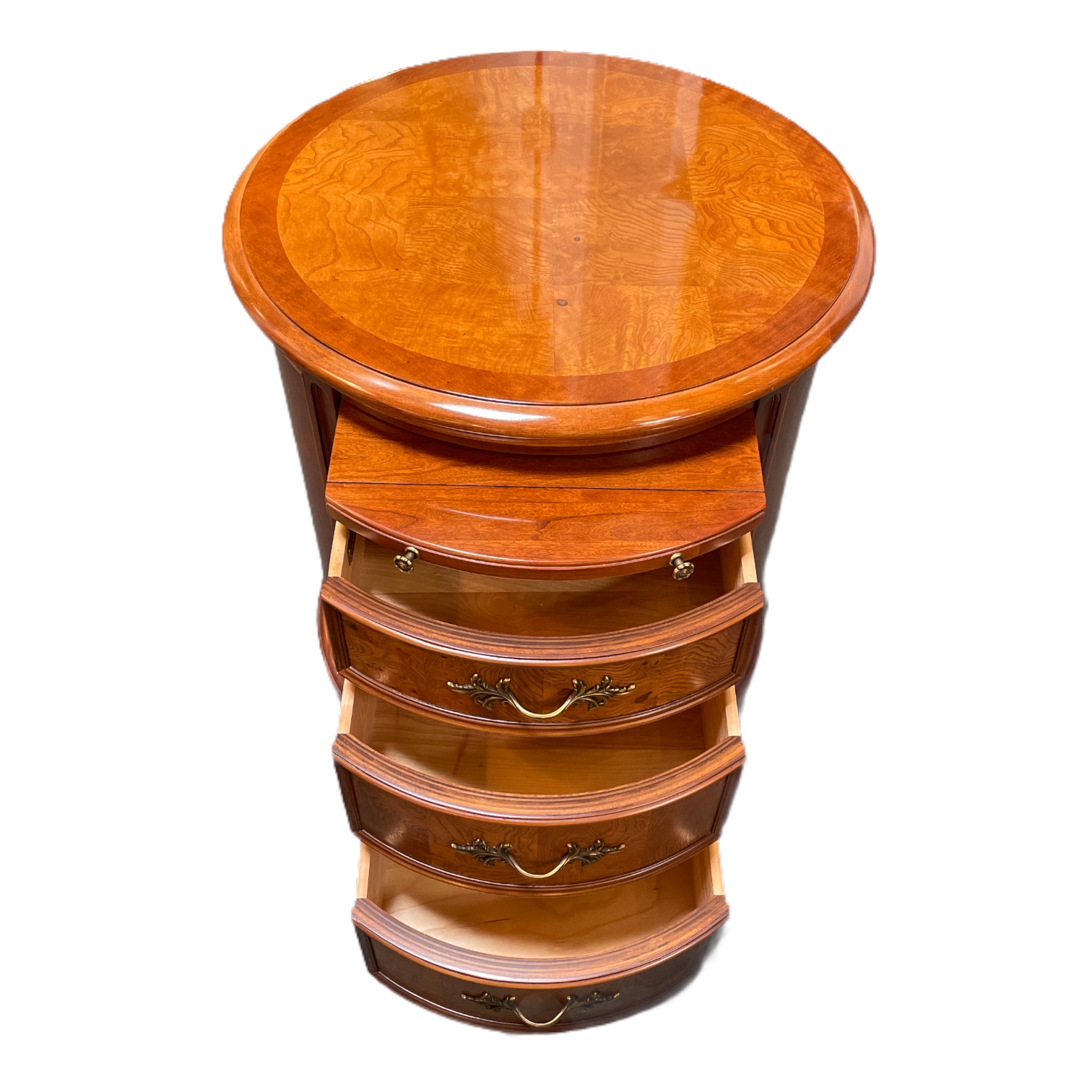 Design Plus Gallery presents a Century Furniture Baroque Style Post Modern Side Table. An impressive array of veneers circulate the lovely column form with burl wood and inlay details. Dovetail maple joinery make up the bank of drawers, all three equal in size. Ornate oiled bronze hardware adorns each drawer with optional pull out tray on top. Minor wear through out, side table is in good condition. Ideal floating in the middle of an arrangement or space due to being fully finished and curved.