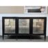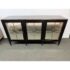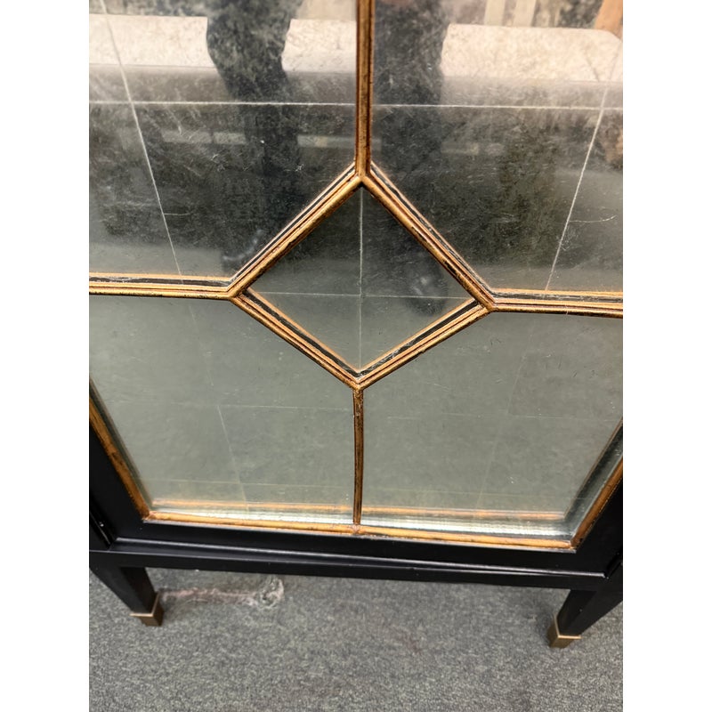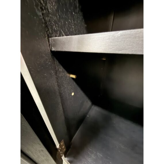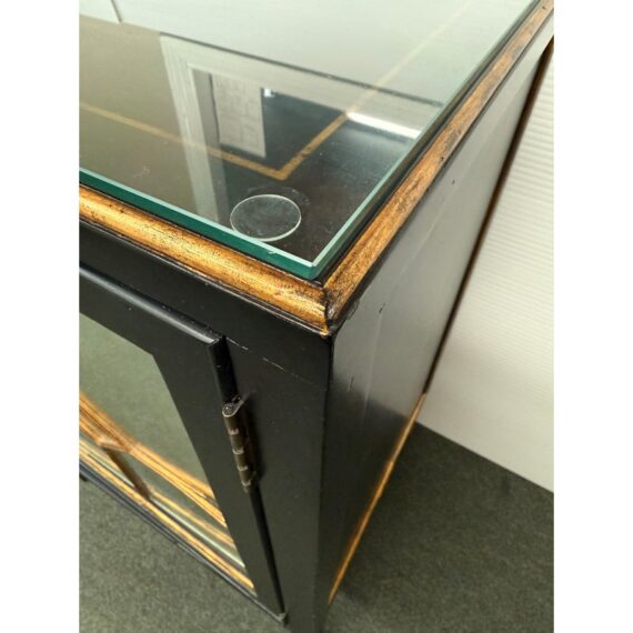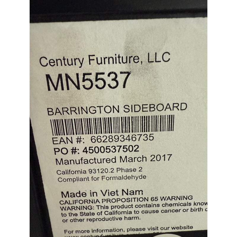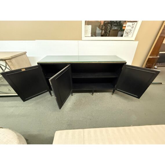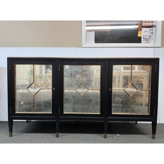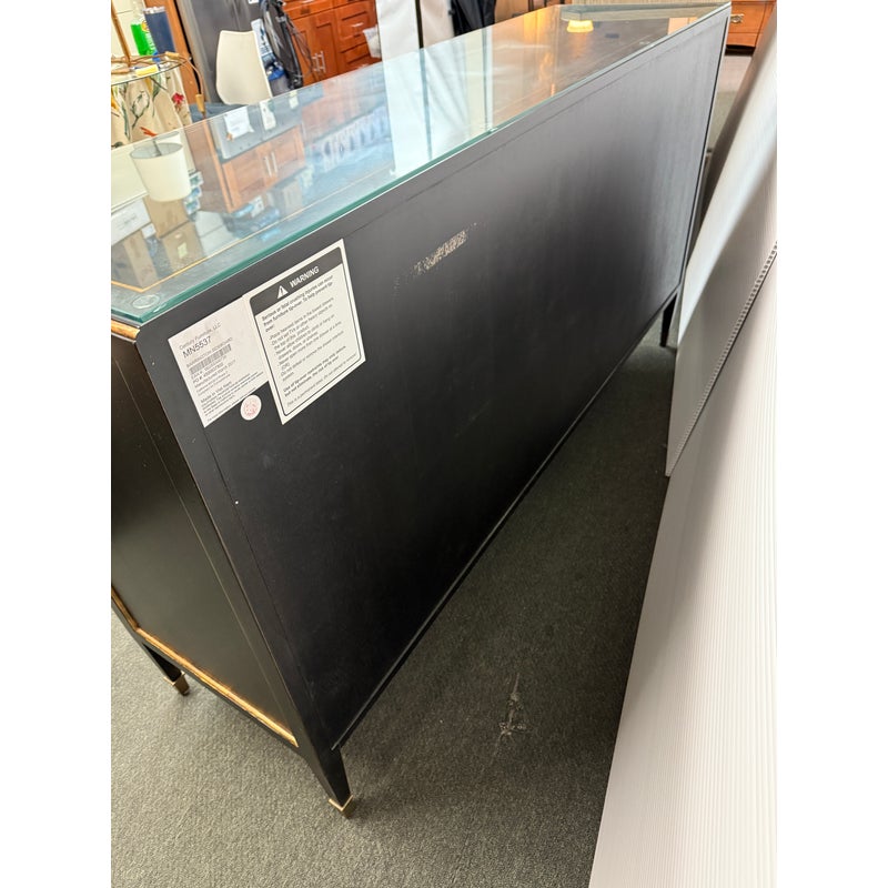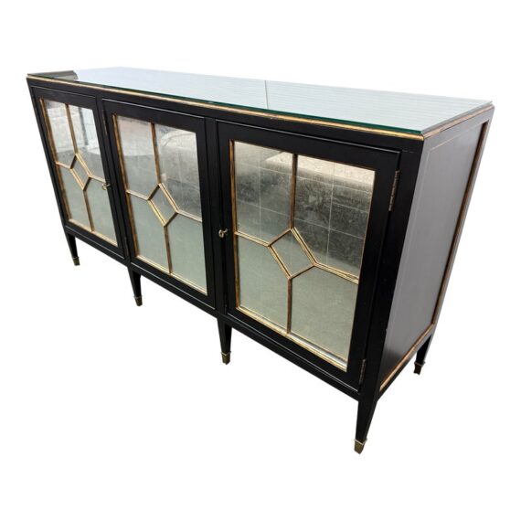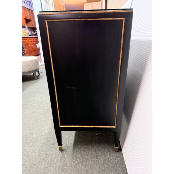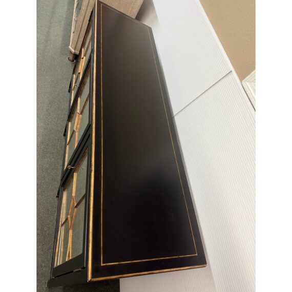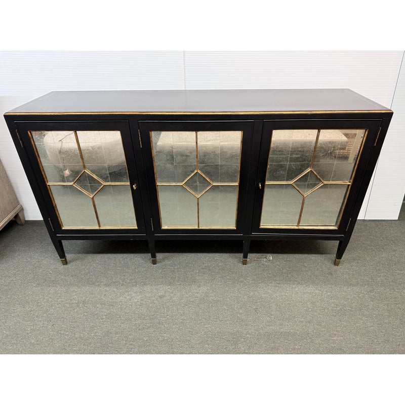 Design Plus Gallery presents a Barrington Sideboard from Century Furniture. This elegant Regency styled storage is crafted of Acacia, then finished in a slightly distressed black finish with hand applied gold accents. Each of the door fronts are inset with Eglomise glass panels centered with delicate antiqued moldings with a diamond motif. The left facing side is a single door with an adjustable shelf, behind. The right facing side has a pair of doors wide also with a single adjustable shelf. Glass surface protector. Light surface wear; condition is good for age and use. Comes with 2 Keys.