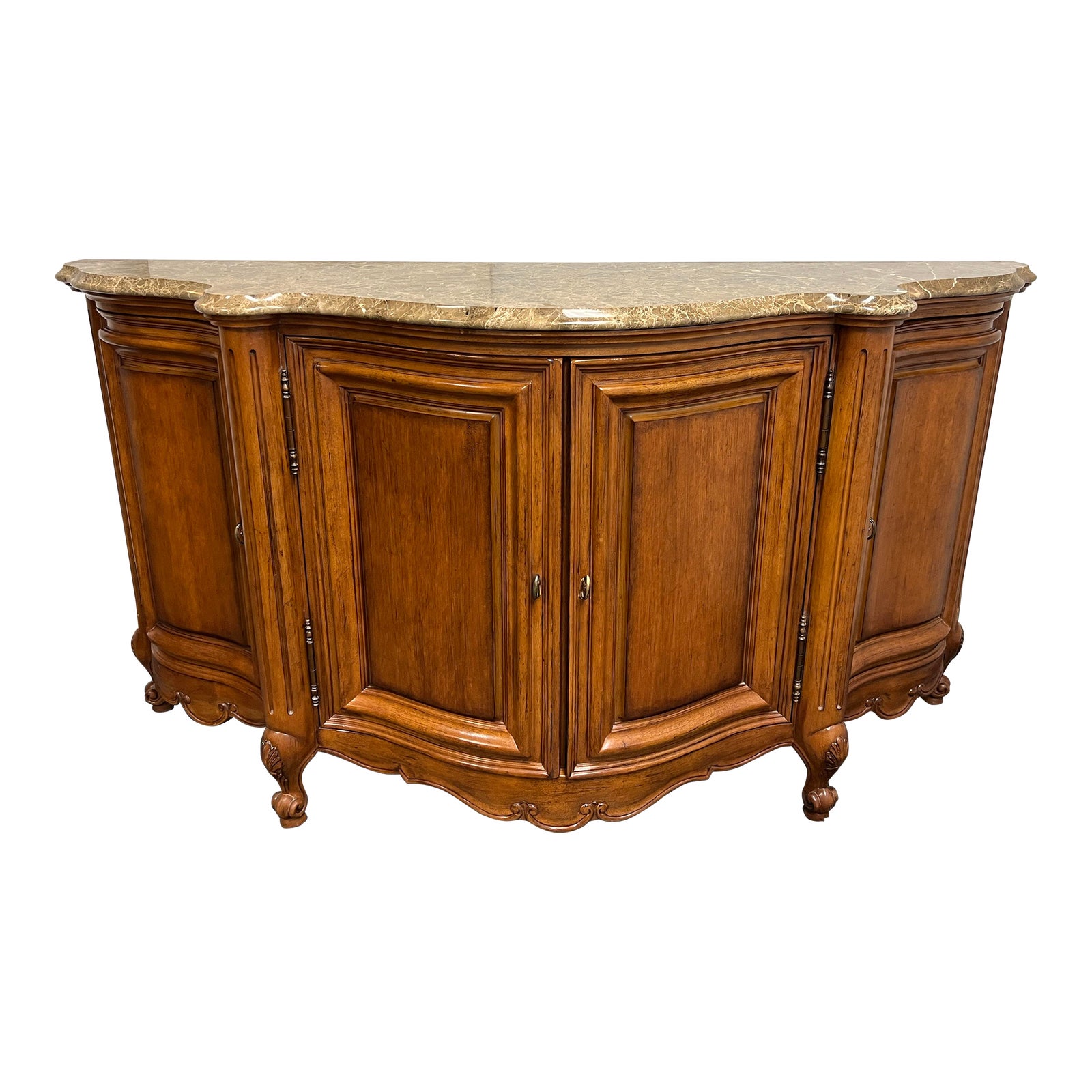 Design Plus Gallery presents a Bonneville Marble Top Credenza by Century Furniture. Constructed primarily with wood. The credenza is in a shape resembling Demi-lunes. The tan marble top has rounded edges in front. There are two side cabinets with two shelves, and a double cabinet in the center with a drawer and two shelves. The drawer is upholstered. Small chip on one leg. Minor wear consistent with use; credenza is in good condition.