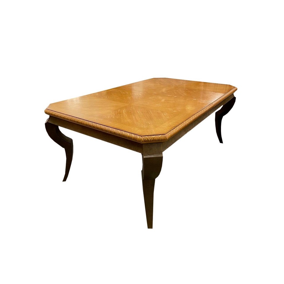 Design Plus Gallery presents a Century Furniture Brass + Oak Extension Dining Table. Brass has dynamic curved legs which extend from apron underneath the surfaces. Top has an inlay design and showcases the veneer’s wood grain. There is visible wear from the where the veneer is coming up. Comes with an extension leaf.