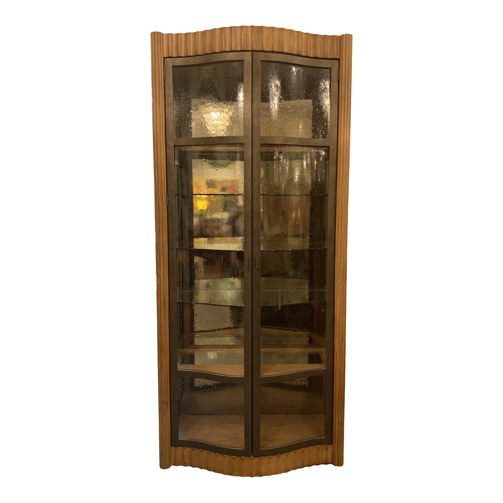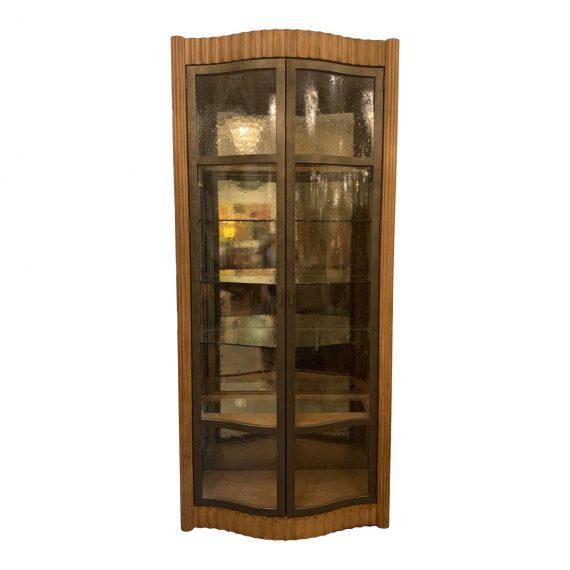 Design Plus Gallery presents a Bunching Glass Cabinet by Century Furniture. Oak Frame displays open glass shelving with mirrored backing and integrated down lighting. Seeded glass adds layer of sophistication to curved doors which are framed in a bronze metal finish.