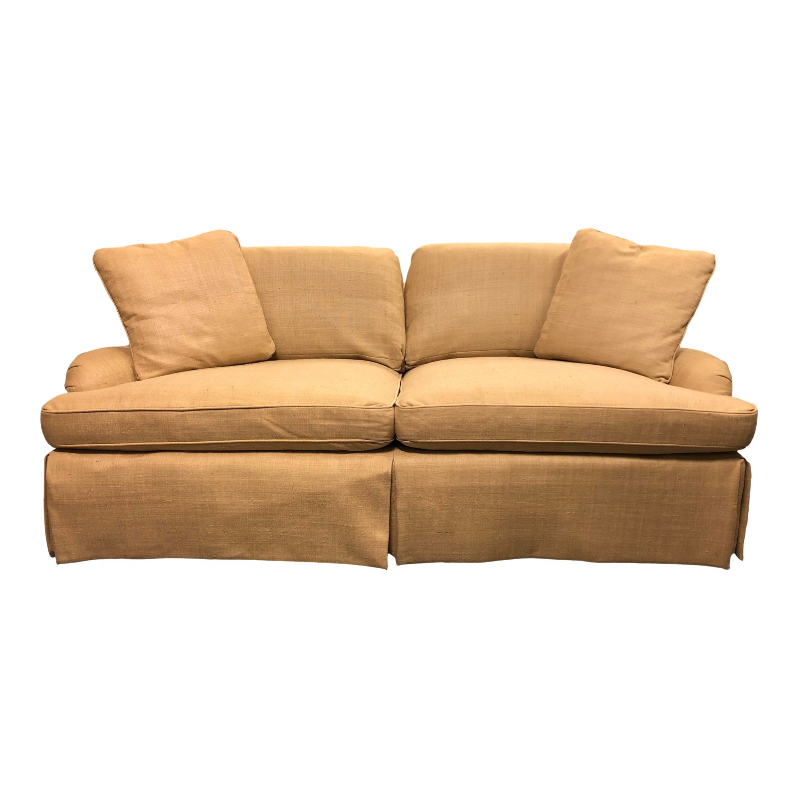 Design Plus Gallery presents a Custom Sofa by Century Furniture. A two on two cushion, accompanied with a pair of accented square pillows. English arm sofa with a skirted frame. Upholstered in a warm honey silk fabric with spring down seating. The back cushions and square pillows have feather down inserts. The seat cushions are foam with feather down wrapping. Minor wear on fabric. Arm Height: 24 inches, Seat Height: 20 inches.