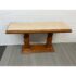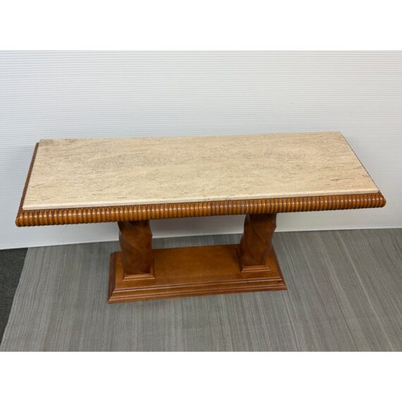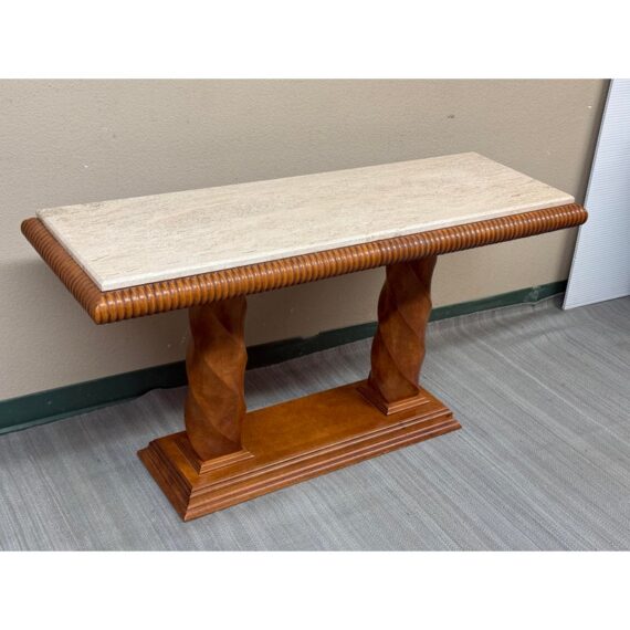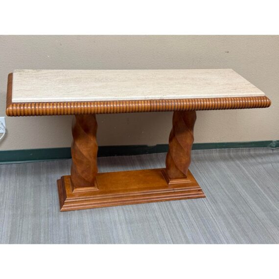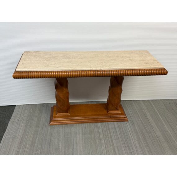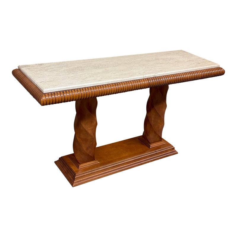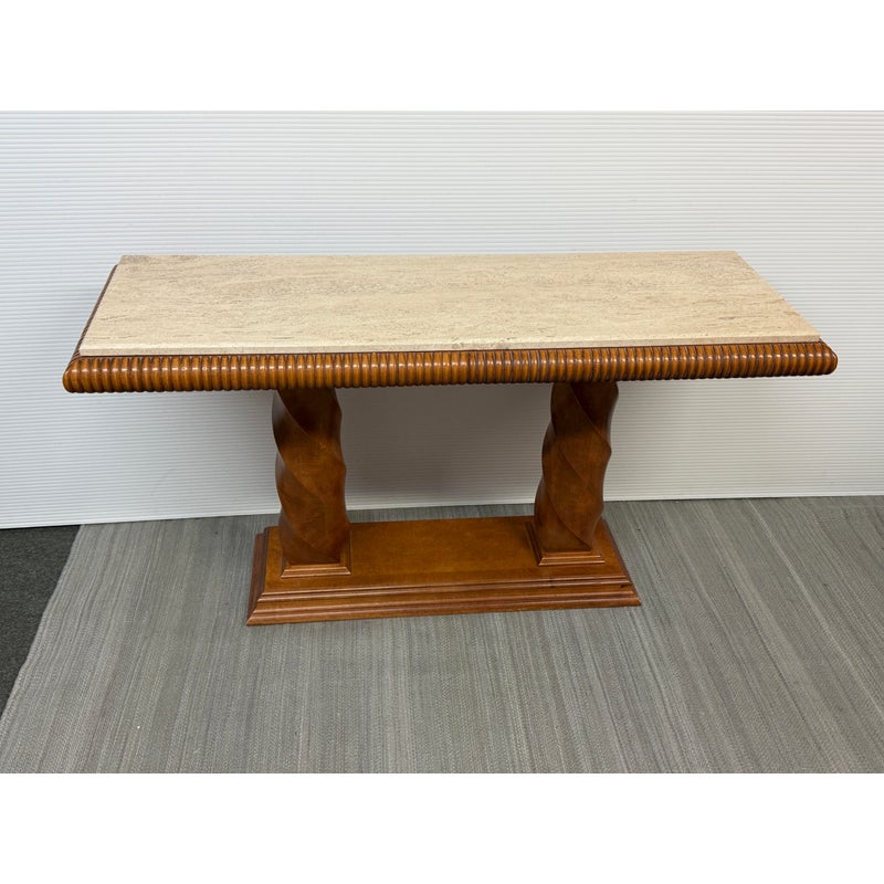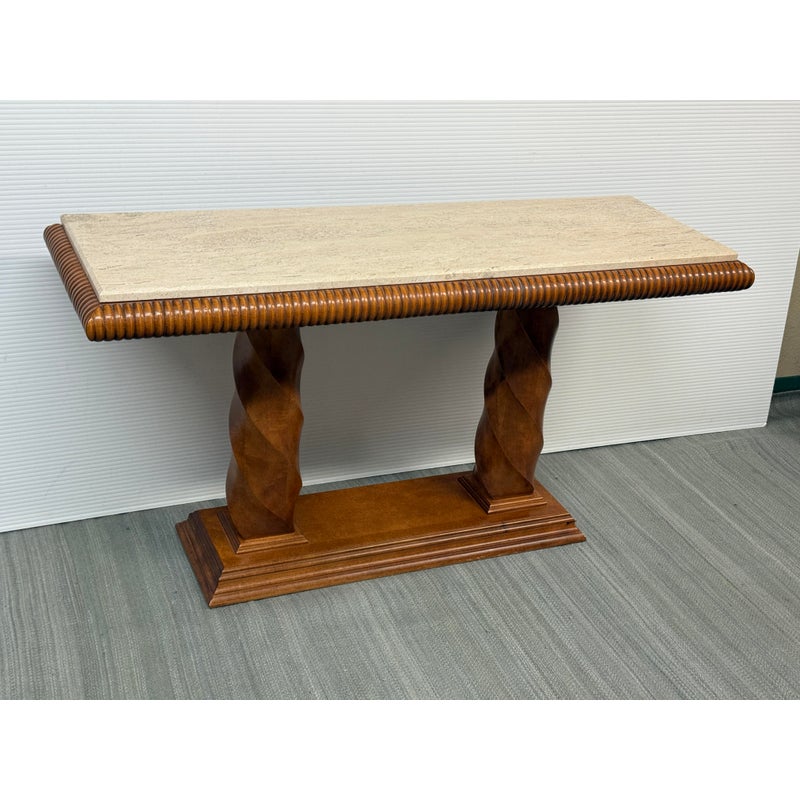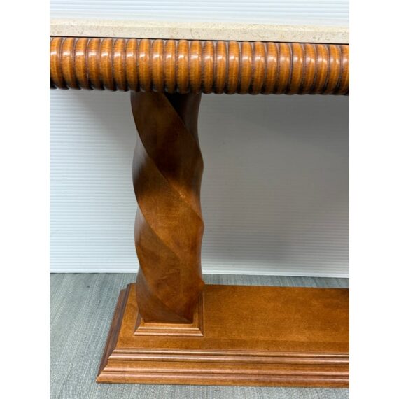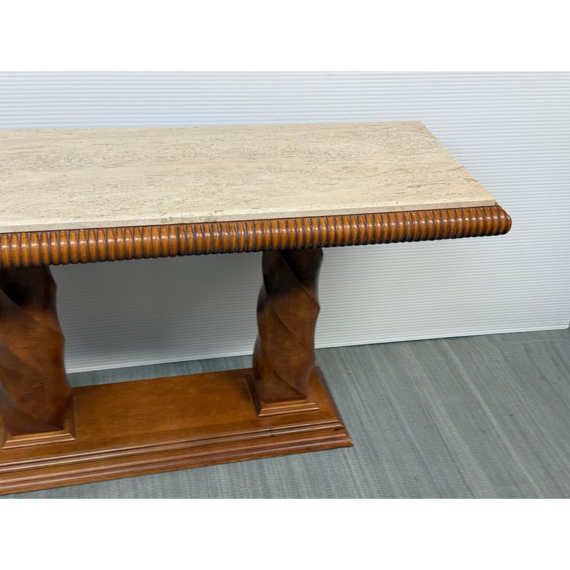 Design Plus Gallery presents the Grand Tour Collection Console Table from Century Furniture. The console has a warm, honey brown tone of wood with visual interest at every angle. The lower base has a molded edging with two twisting pedestal columns that give rise to the travertine top. The wood surrounding the stone surface is twisting and ribbed. The style has been discontinued by the brand. The console is in good condition with minimal wear for its age + use.