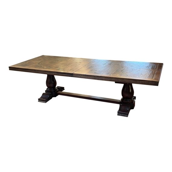 Design Plus Gallery presents the Marbella Amador Dining Table by Century Furniture. The large table, that gets even larger with two leaves, is crafted of Walnut Veneers, Mahogany Veneers and Mahogany solids with Ingin Inlay in a beautiful pattern. The trestle table is a wonderful gathering spot for every coming holiday. Little evidence of wear; table is in good condition for age and use.