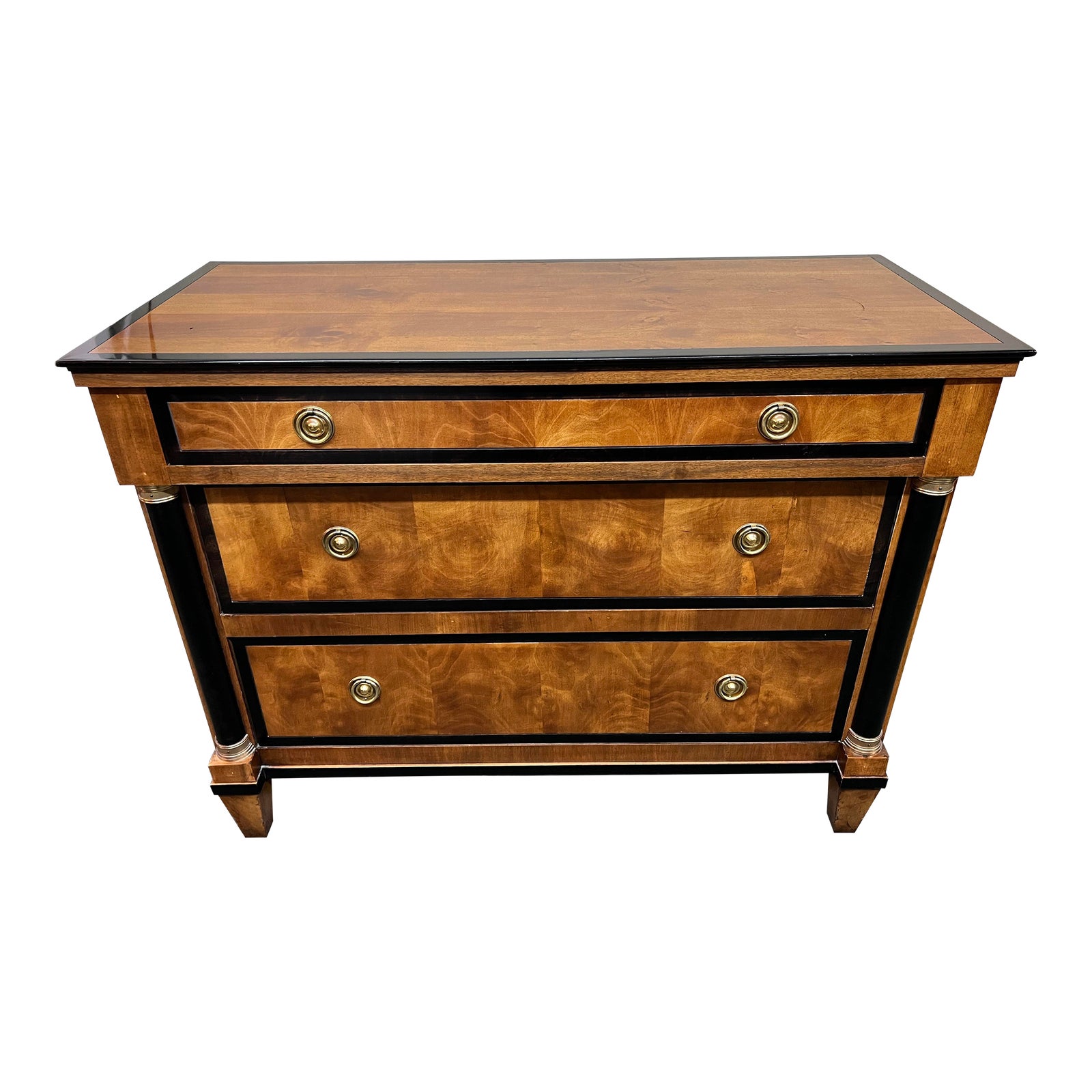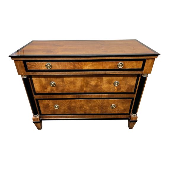 Design Plus Gallery presents a Vintage Neoclassical Capuan Dresser by Century Furniture. Designed by Ray Sabota, Biedermeier stylings are evident in the lovely mahogany veneers that have been detailed with ebony inlays. Columns flank the three drawers and taper at feet. Cast brass pulls on each drawer. Light surface wear; consistent with age and use; DIY repair can be seen on ebony inlay at front of dresser.