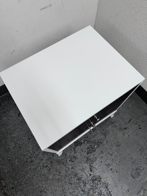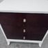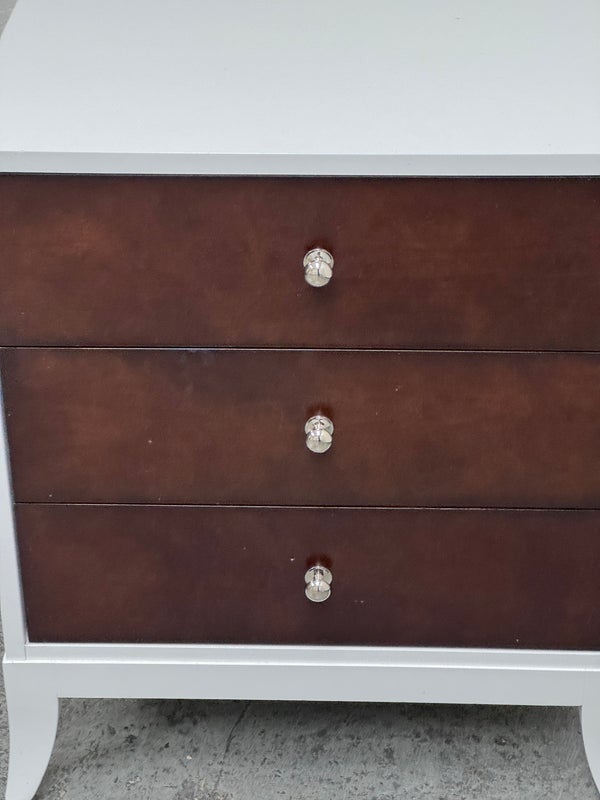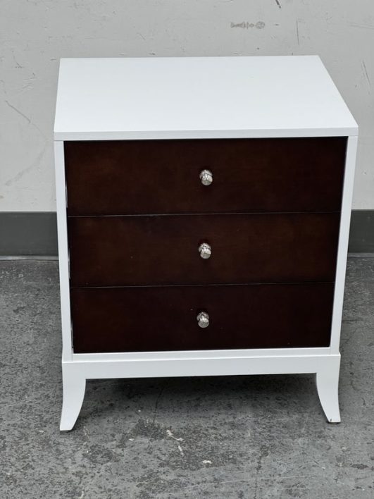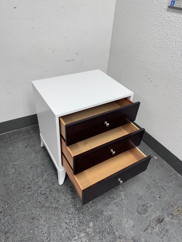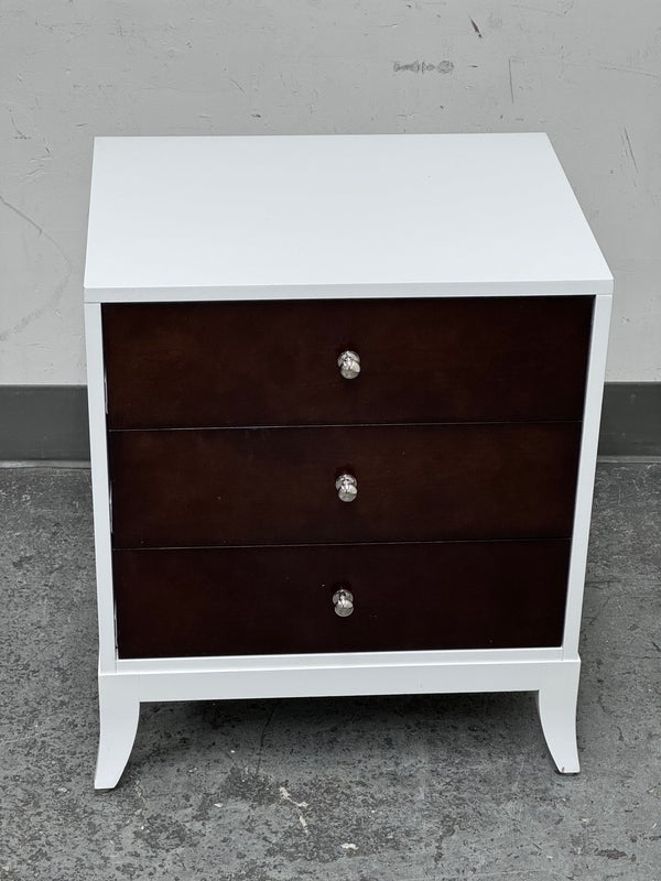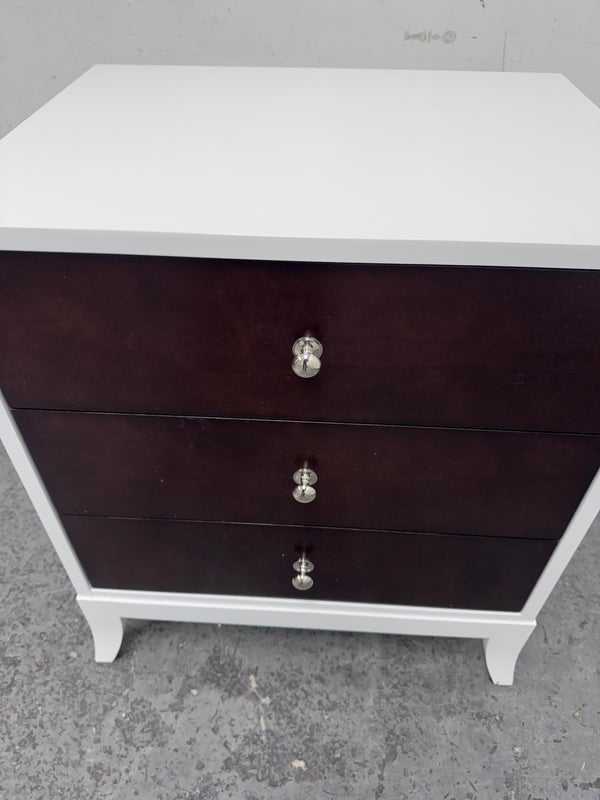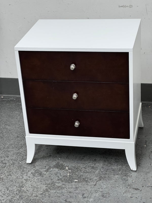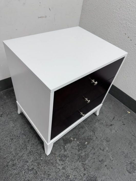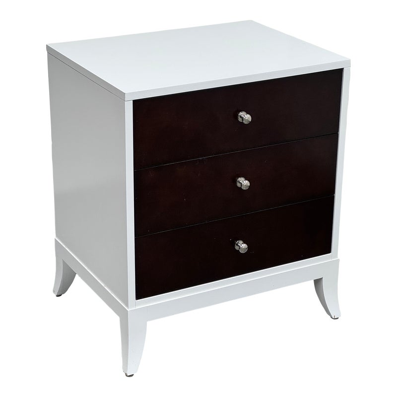 Design Plus Gallery presents a Tribeca Stark White and Dark Chocolate Espresso Nightstand from Century Furniture. The bed side table is great for apartment living as it is neutral to match with plenty of storage. Three dark wood drawers with nickel pull tab of staggered depths. Positively unique and were custom made of quality hardwoods in the US. Is in good condition with visible and minimal wear.