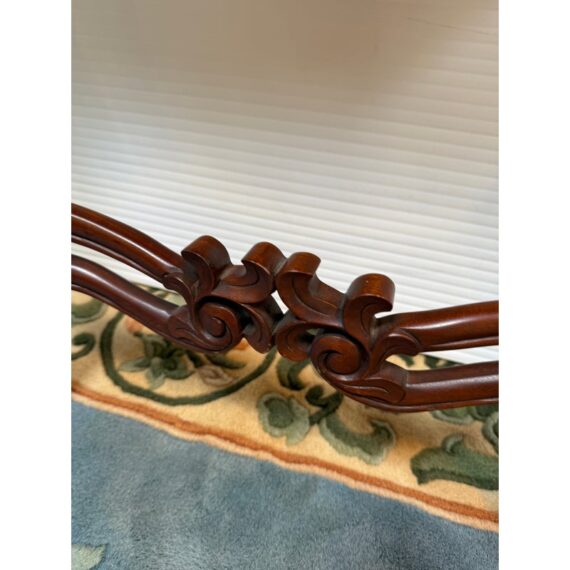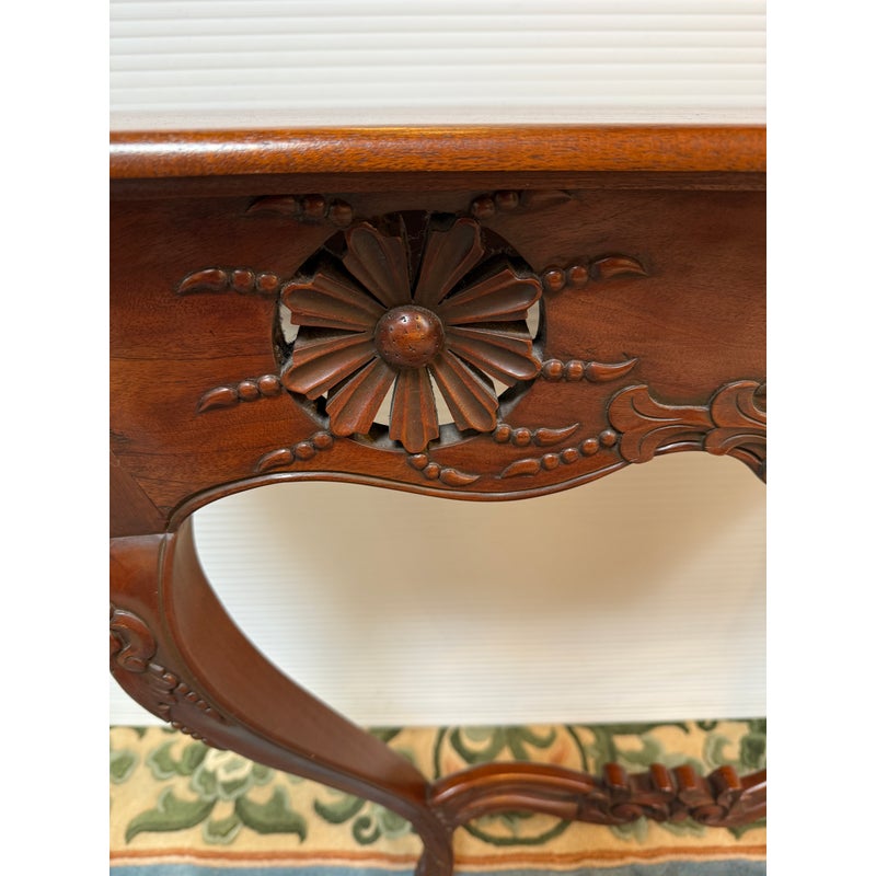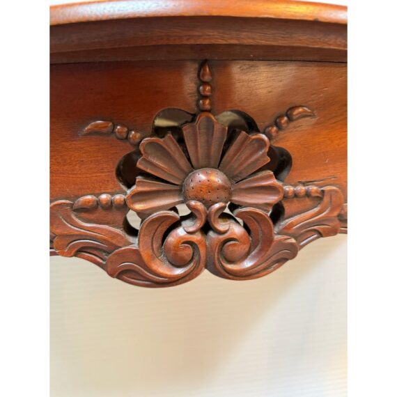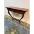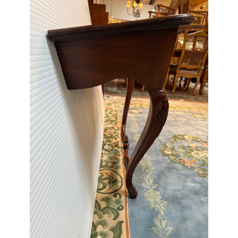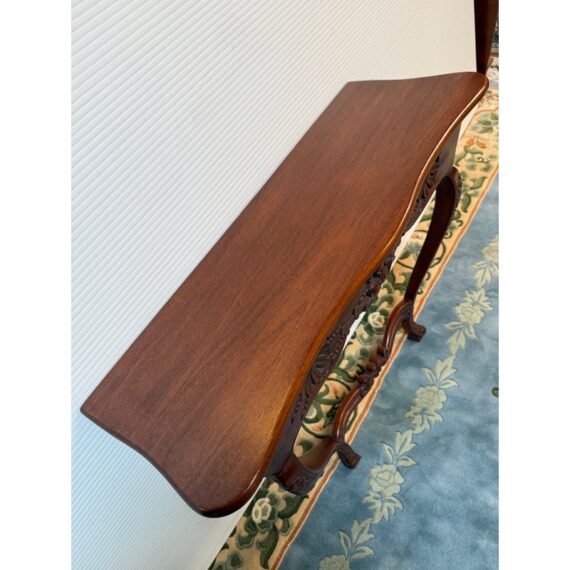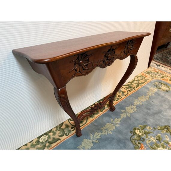 Design Plus Gallery presents a Wall Mount Console Table. Perfect for entryway, the shallow scaled table has elegant carvings on apron and brace, a shaped surface and lovely curved legs. A beautiful drop zone. Little surface wear; condition is consistent with age and use.