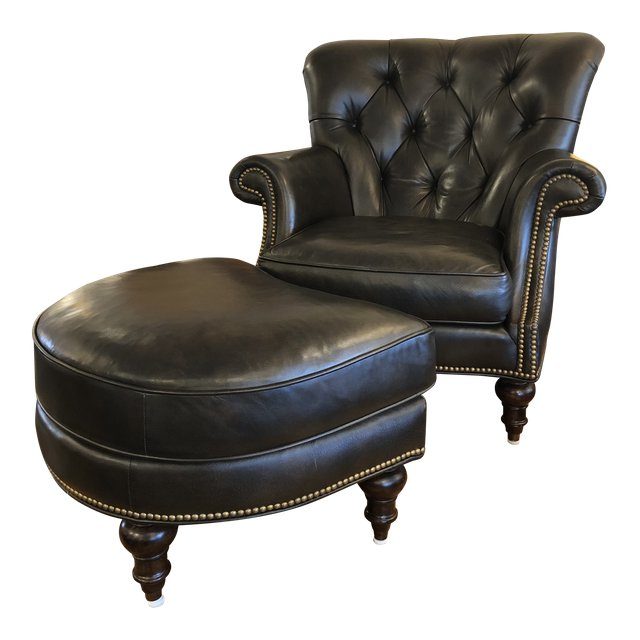 Design Plus Gallery presents Winfield chair and ottoman by Century Furniture. Chair and ottoman are made out of soft, dark brown leather. The back is tufted. The chair and ottoman are finished with brass neilheads. Elegant and comfortable.