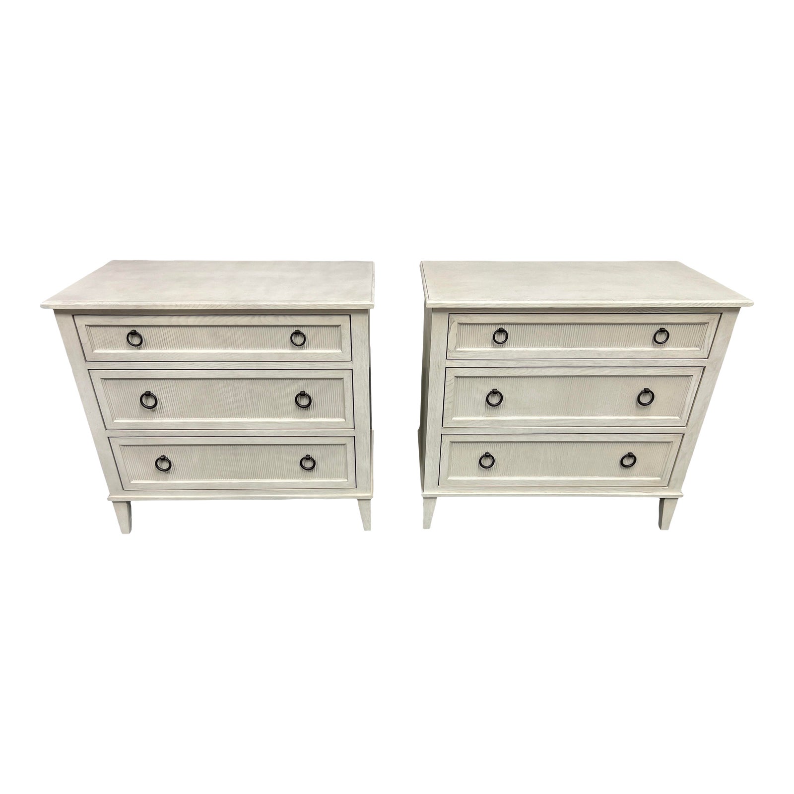 Design Plus Gallery presents a Pair of Monarch Century Furniture Hampton 3 Drawer Nightstands. Complete the look of your French Country bedroom with these beauties. This chic nightstand is beautifully made from ash wood and features three soft-close drawers with gun metal grey hardware. Made in Vietnam.