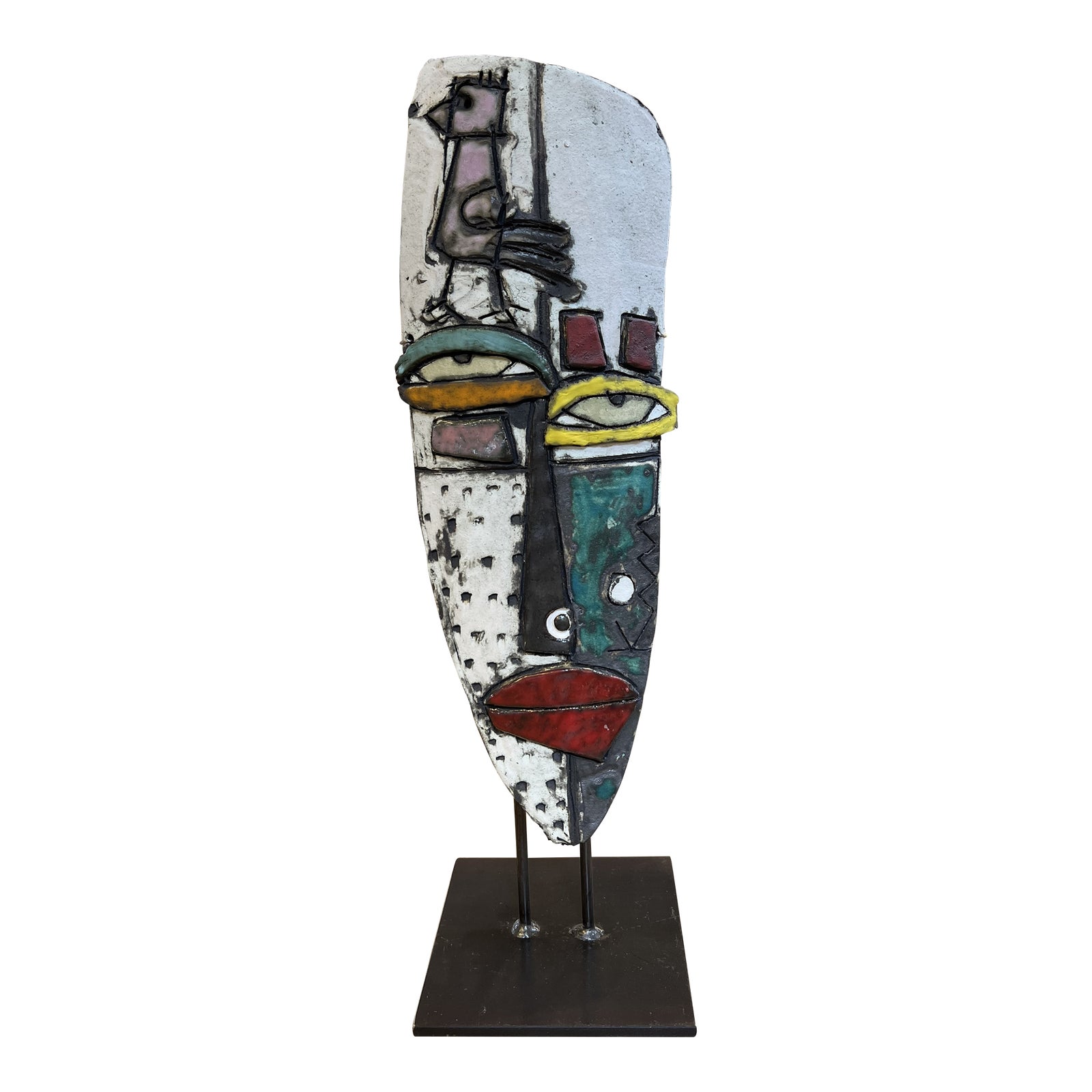 Design Plus Gallery presents the Ceramic Face With a Bird + Stand, by Kimmy Cantrell. With a focus on finding beauty within imperfections, Cantrell uses asymmetry to challenge the traditional notions. This particular mask features a bird carved over one eye. The colors are rich and varied, and each piece is made using clay and ceramic. A hanging cord keeps the mask hoisted on its stand. Minor wear from use; sculpture is in good condition.