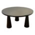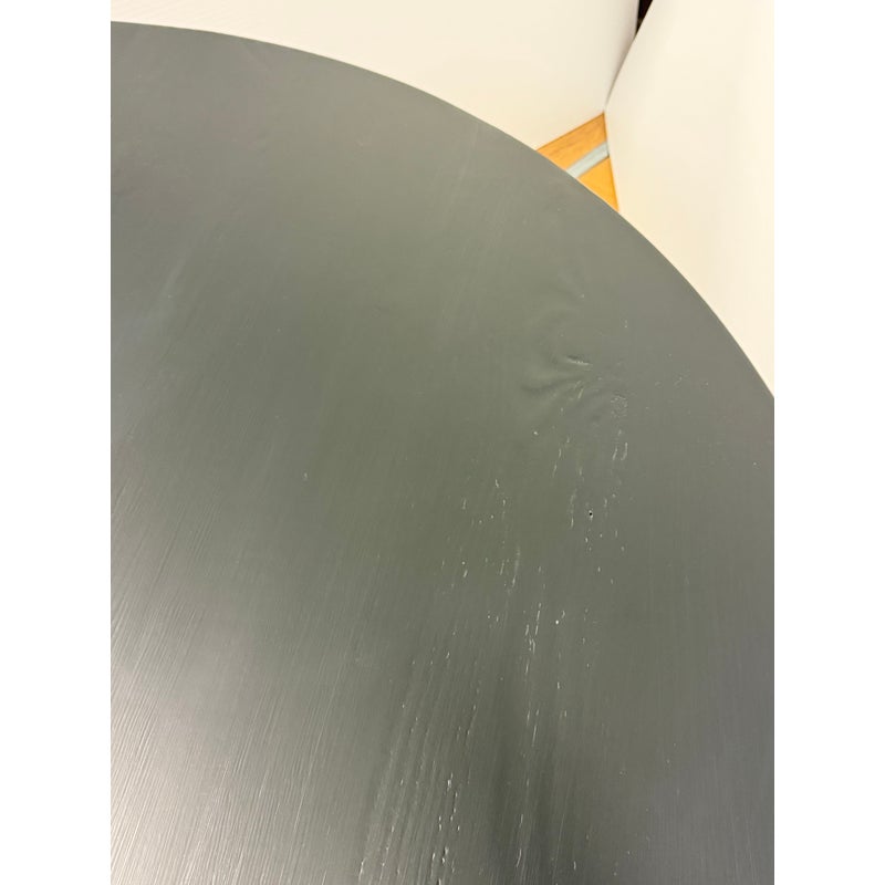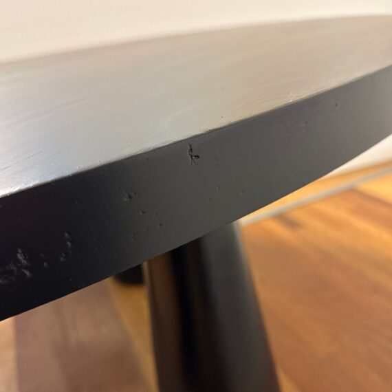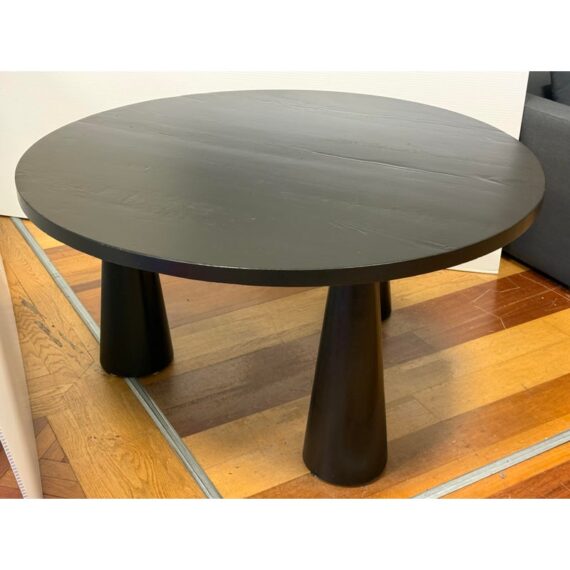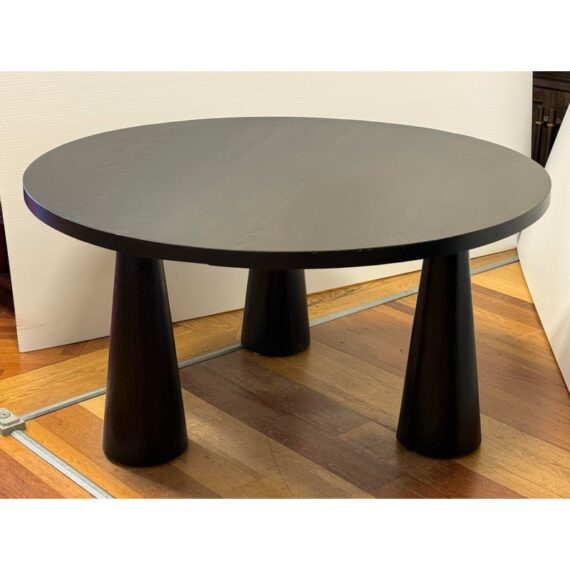 Design Plus Gallery presents the Noir David Dining Table by CFC. Designed with three conical legs inspired by architectural pillars, the table has a monumental presence with sculpted and modern lines. It is made from reclaimed Douglas fir wood and carries subtle variations in grain and texture that speak to the material’s past life. The black stain enhances the table’s bold silhouette while allowing the natural nuances of the wood to remain visible. The generous round top comfortably accommodates gatherings, encouraging conversation and connection. In good condition, visible and minimal wear from usage.