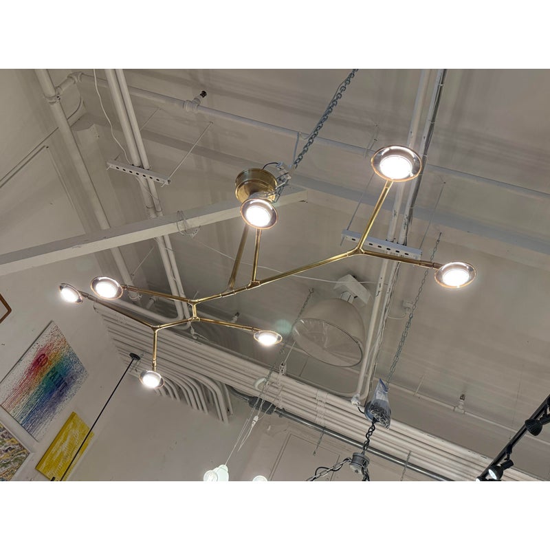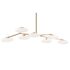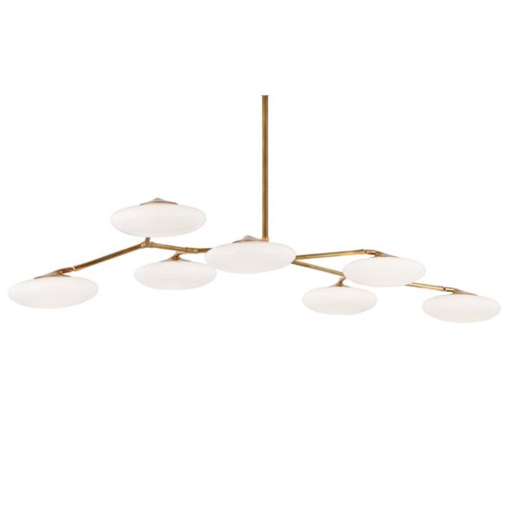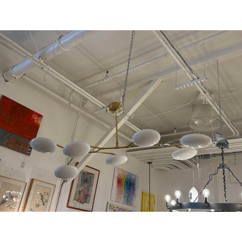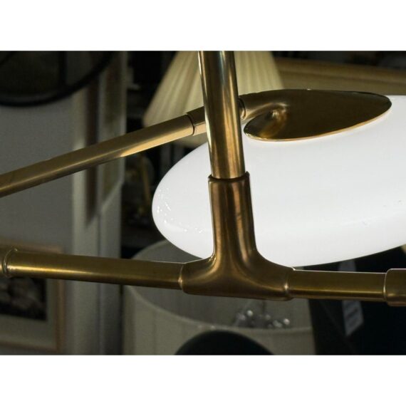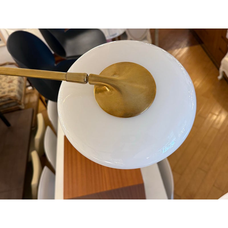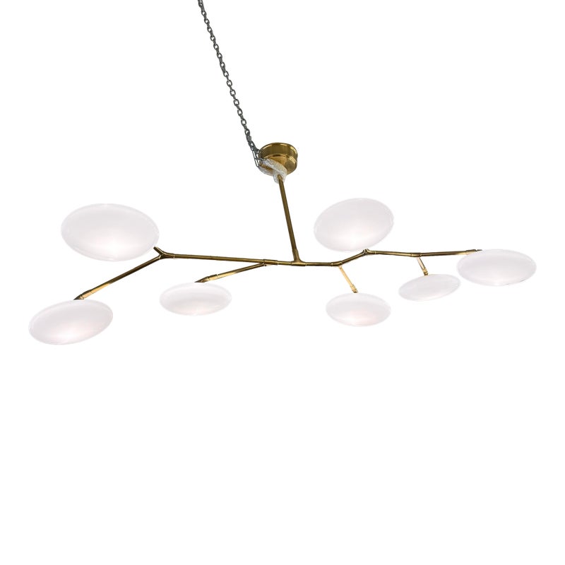 Design Plus Gallery presents a Brindille XL Articulating Linear Led Soft Brass Chandelier by Visual Comfort Signature. Designed by Champalimaud. A harmonious blend of organic beauty and technical innovation. The slender arms of the suspended frame, resemble a branch adorned with delicate petals. These petal-like white glass shades are ingeniously designed with a spoon-shaped brass fitting, allowing them to rotate 360 degrees for versatile and adjustable lighting. This chandelier becomes a poetic focal point above any dining room table, captivating with its artistic allure and functional charm. In good condition.