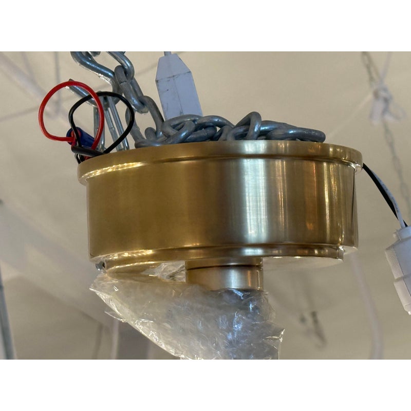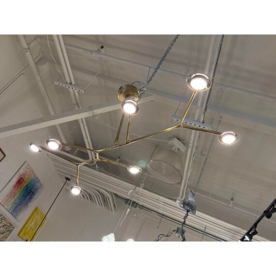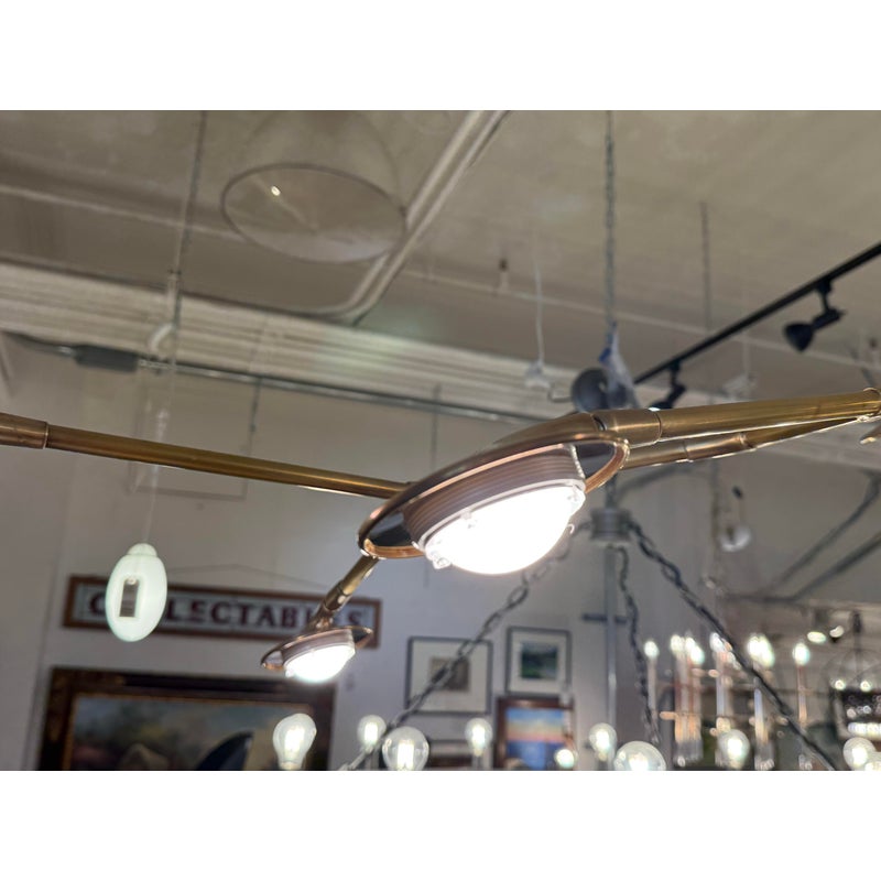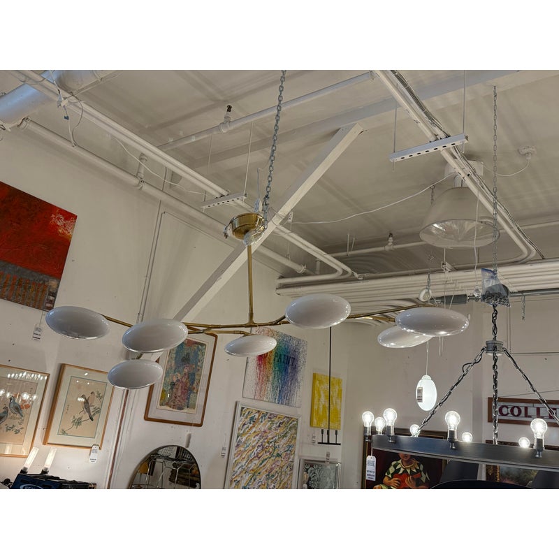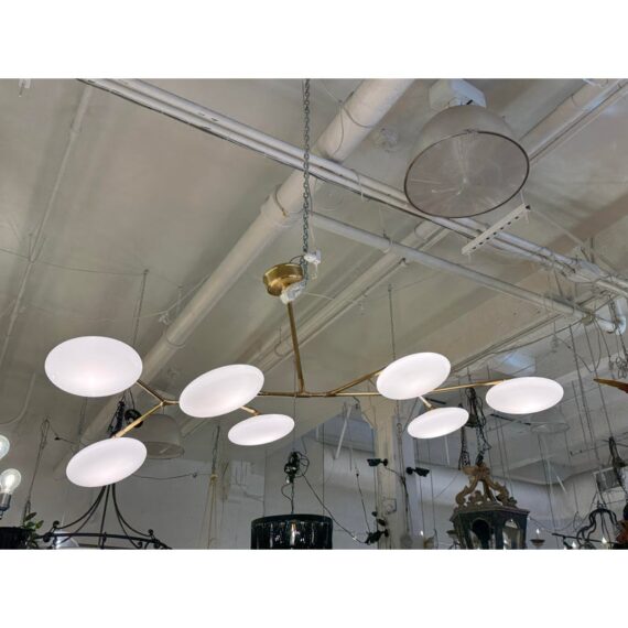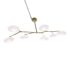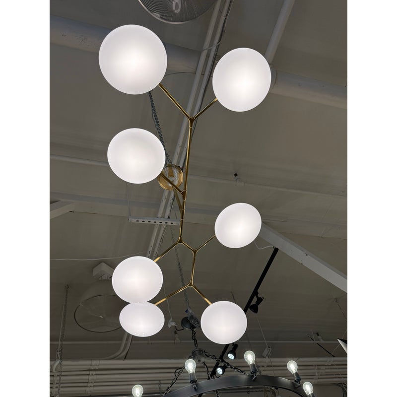 Design Plus Gallery presents a Brindille XL Articulating Linear Led Soft Brass Chandelier by Visual Comfort Signature. Designed by Champalimaud. A harmonious blend of organic beauty and technical innovation. The slender arms of the suspended frame, resemble a branch adorned with delicate petals. These petal-like white glass shades are ingeniously designed with a spoon-shaped brass fitting, allowing them to rotate 360 degrees for versatile and adjustable lighting. This chandelier becomes a poetic focal point above any dining room table, captivating with its artistic allure and functional charm. In good condition.