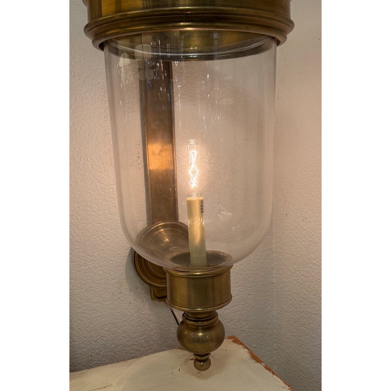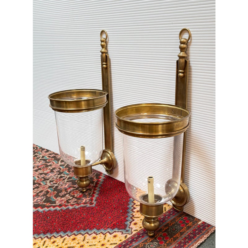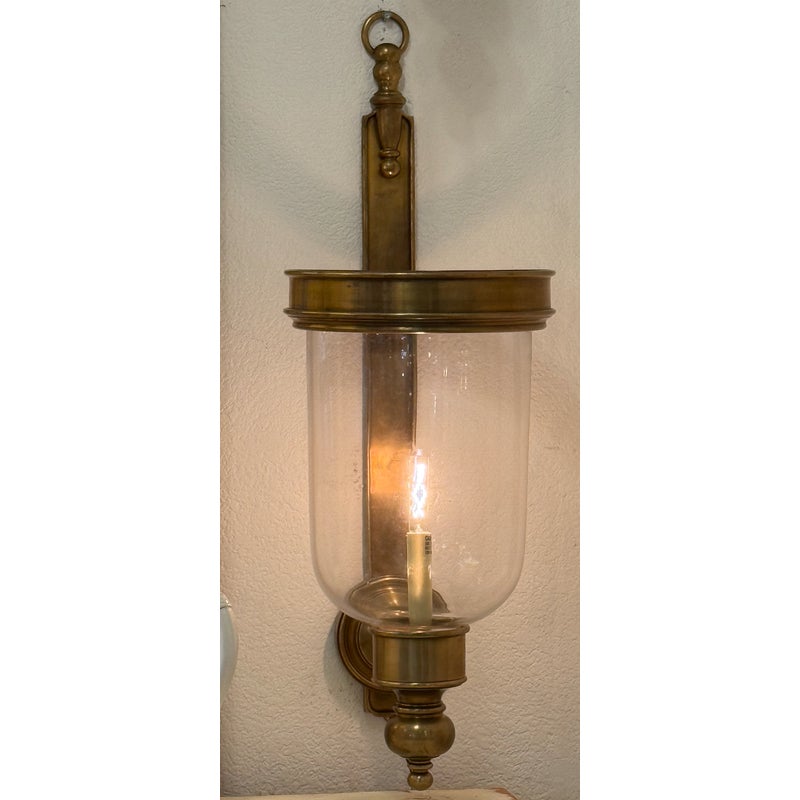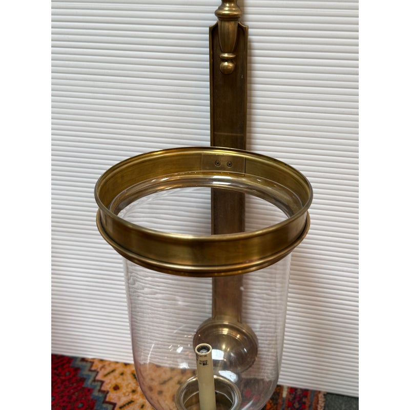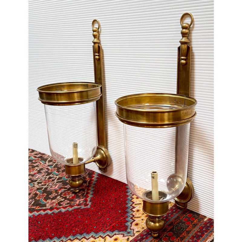 Design Plus Gallery presents a Pair of Georgian Hurricane Wall Sconces by Chapman & Myers for Visual Comfort. The Georgian Hurricane Wall Sconces recall the great attention to detail of old-world luminaires with an elegant, tiered design. While heavily accented, they sport a silhouette so clean that modern spaces can appreciate it. The sconces slide into a tight column or entryway with a vertical backplate topped with traditional ornamentation. Rippling metal hardware in front pairs with a crowning ring to hold a beautiful clear glass shade. A milky lamp holder and candelabra bulb inside mimic a wax candle in silhouette and with a spirited, ambient glow. They are in good condition for their usage with minimal surface wear.