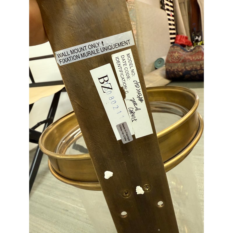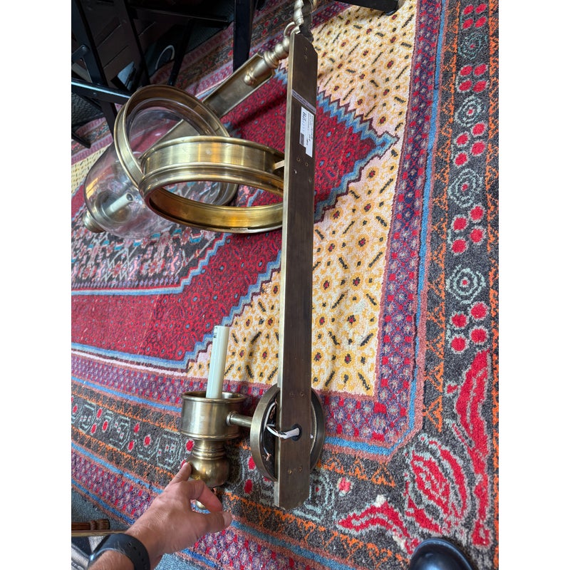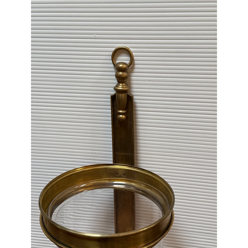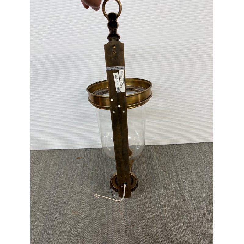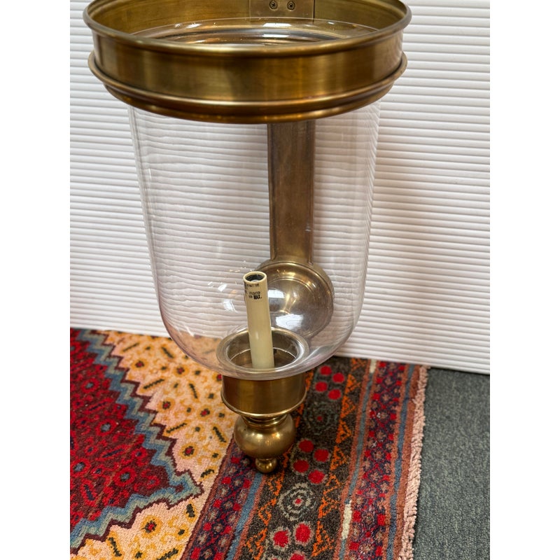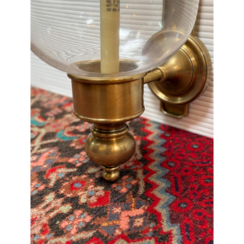 Design Plus Gallery presents a Pair of Georgian Hurricane Wall Sconces by Chapman & Myers for Visual Comfort. The Georgian Hurricane Wall Sconces recall the great attention to detail of old-world luminaires with an elegant, tiered design. While heavily accented, they sport a silhouette so clean that modern spaces can appreciate it. The sconces slide into a tight column or entryway with a vertical backplate topped with traditional ornamentation. Rippling metal hardware in front pairs with a crowning ring to hold a beautiful clear glass shade. A milky lamp holder and candelabra bulb inside mimic a wax candle in silhouette and with a spirited, ambient glow. They are in good condition for their usage with minimal surface wear.