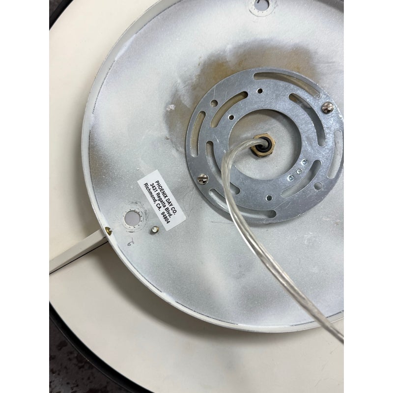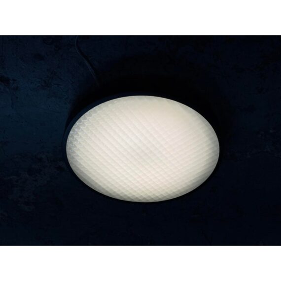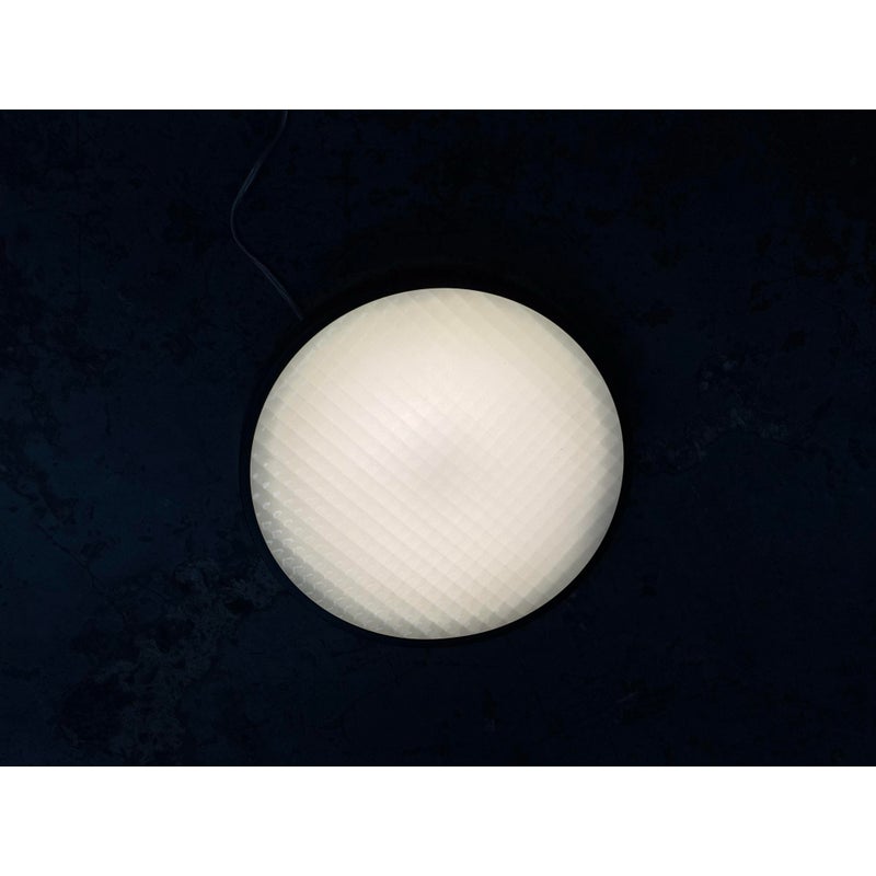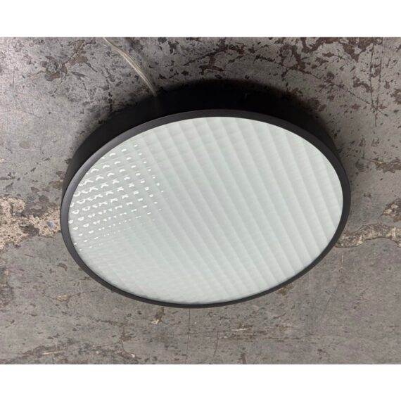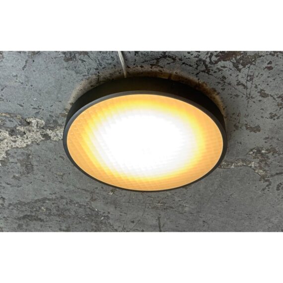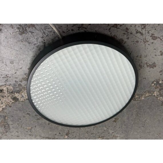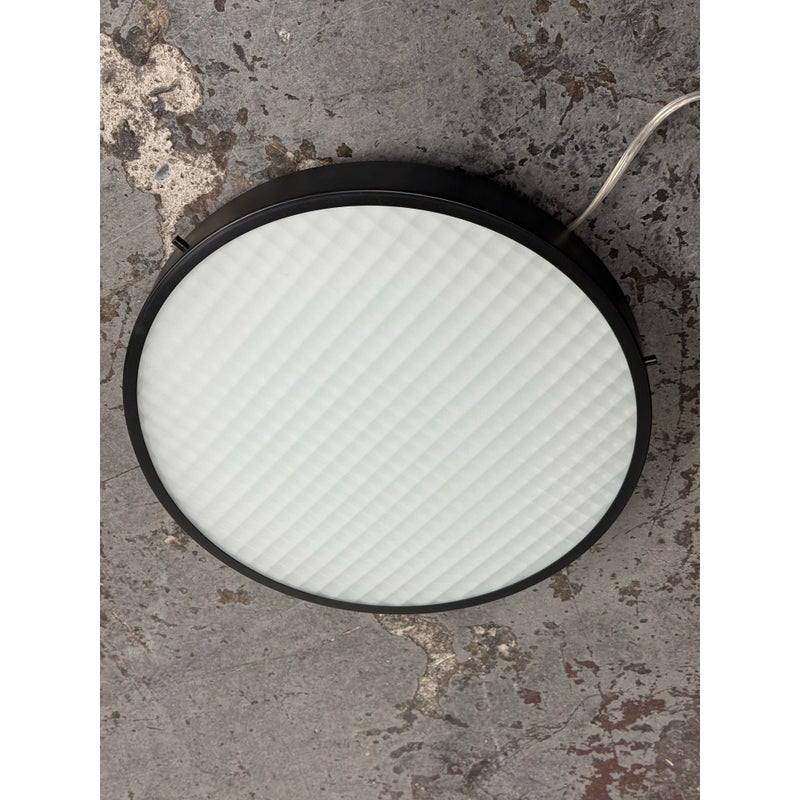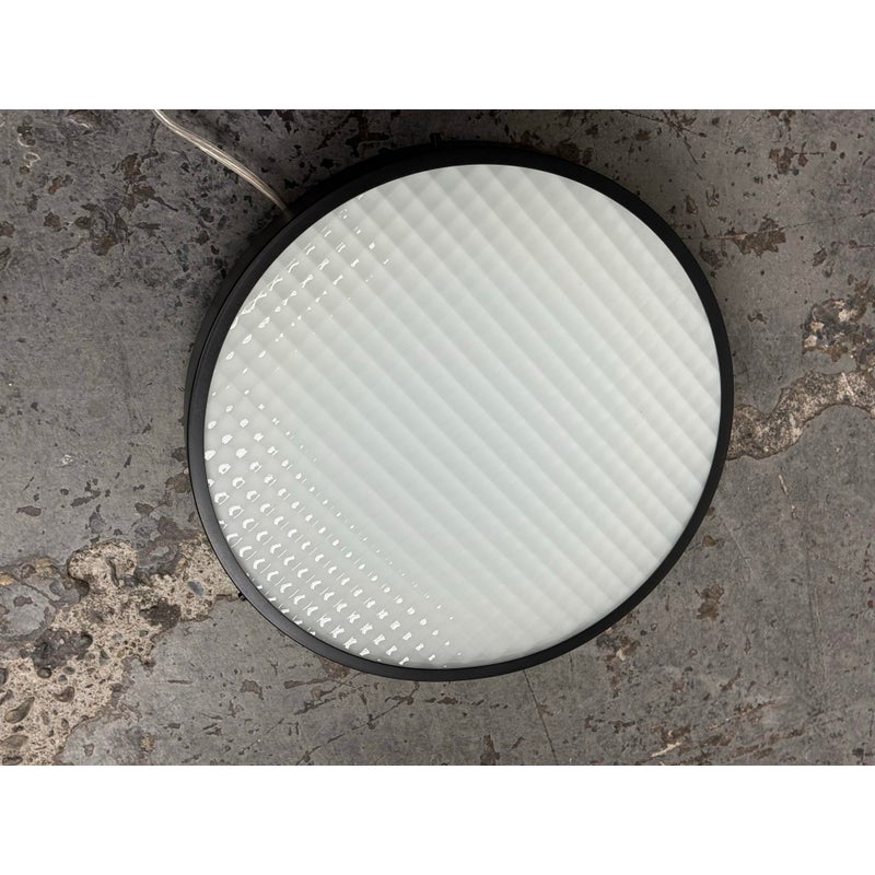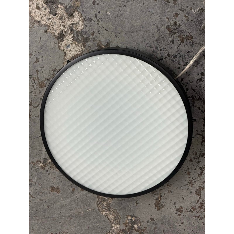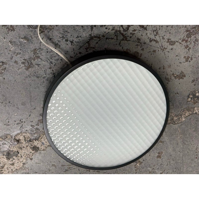 Design Plus Gallery presents the 2085 Felix Flush Mount by Charles De Lisle for Phoenix Day. The light fixture is perfectly round with a metal frame enriched with their Dark Antique finish. The fixture offers a refined architectural presence that cements itself into the ceiling for illuminated overhead lighting. The soft glow is maintained through a slumped and sandblasted glass diffuser with a square pattern that offers dimension to its overall appeal. The textured glass enhances visual interest while maintaining a clean, understated aesthetic, allowing the fixture to complement both modern and transitional interiors. In good condition, visible and minimal wear from usage. Made in the USA.