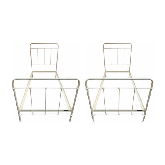 Design Plus Gallery presents a Cottage Twin Bedframes by Charles P. Rogers. The frame is constructed with heavy iron and given an antique white finish. The headboard and footboard have decorative ball accents. The frame uses a mattress with either box springs or foundation. Its simplicity gives it elegance. Minor wear from use; bedframe is in good condition.
