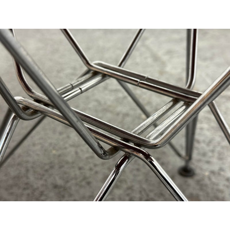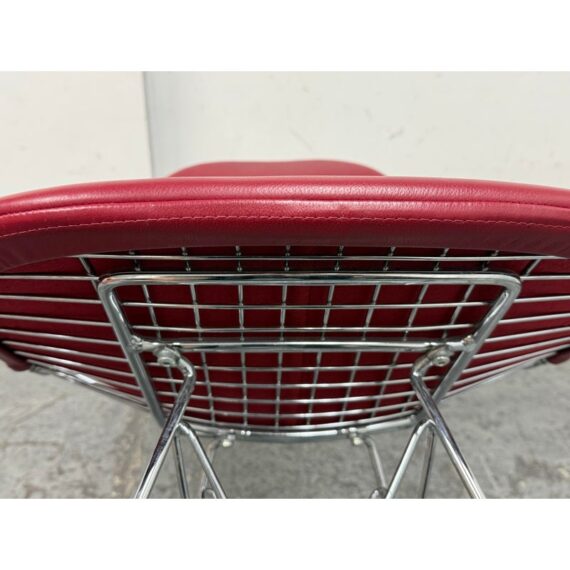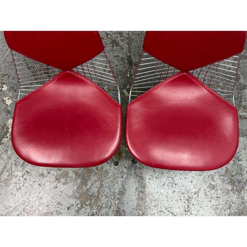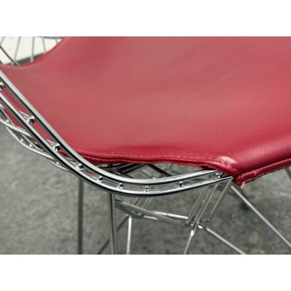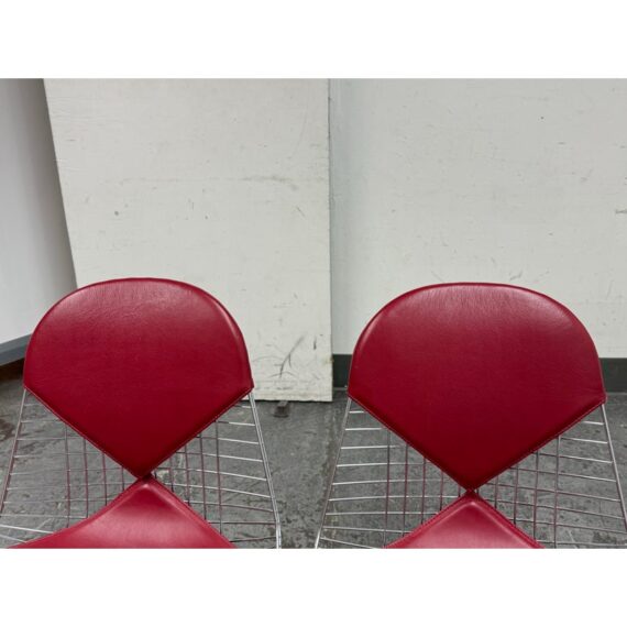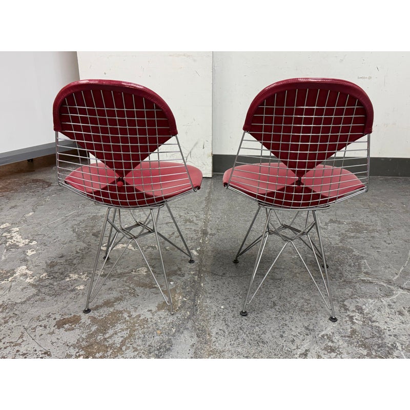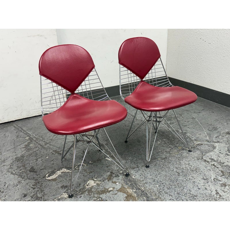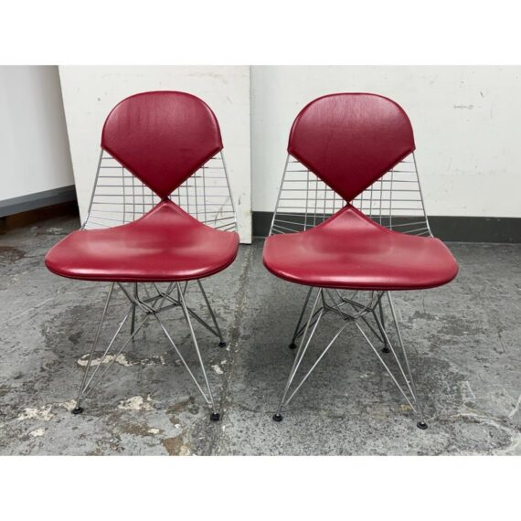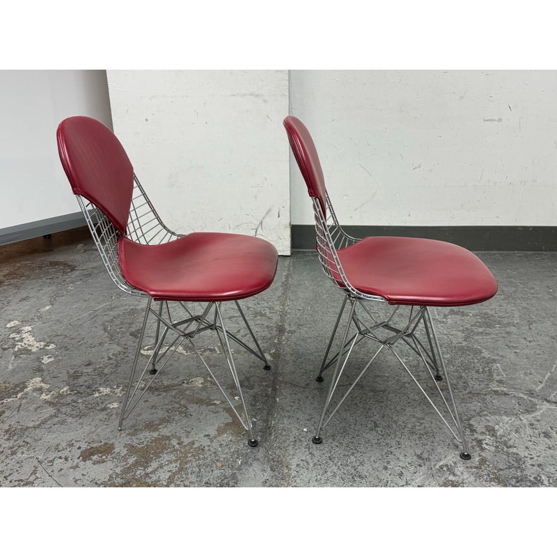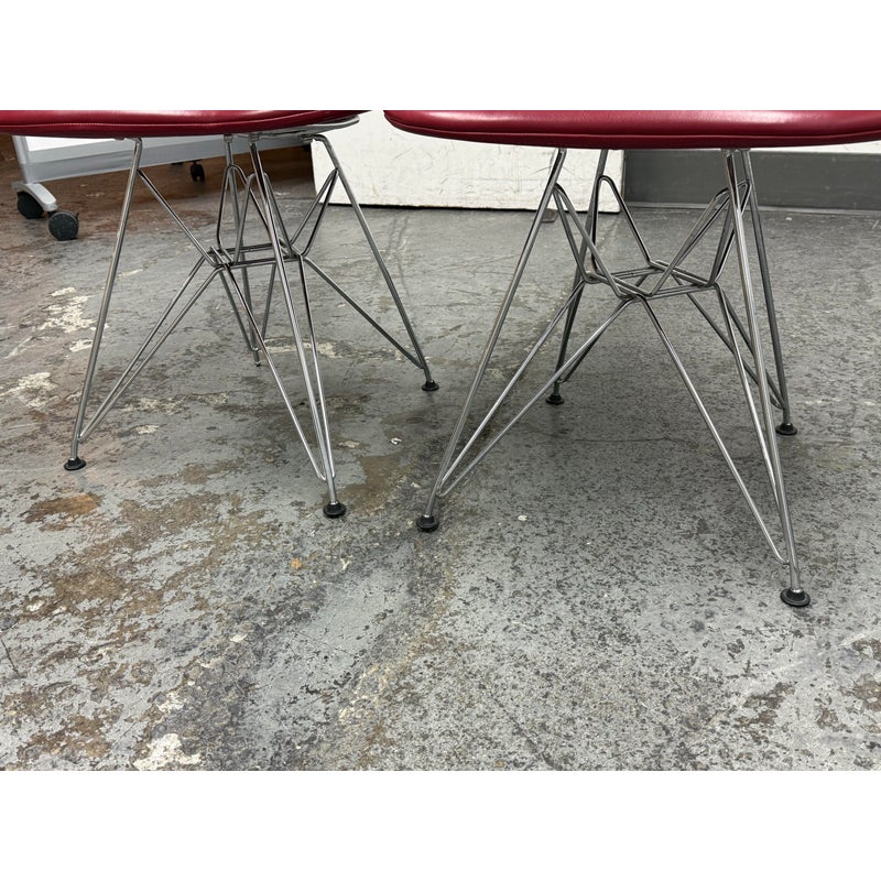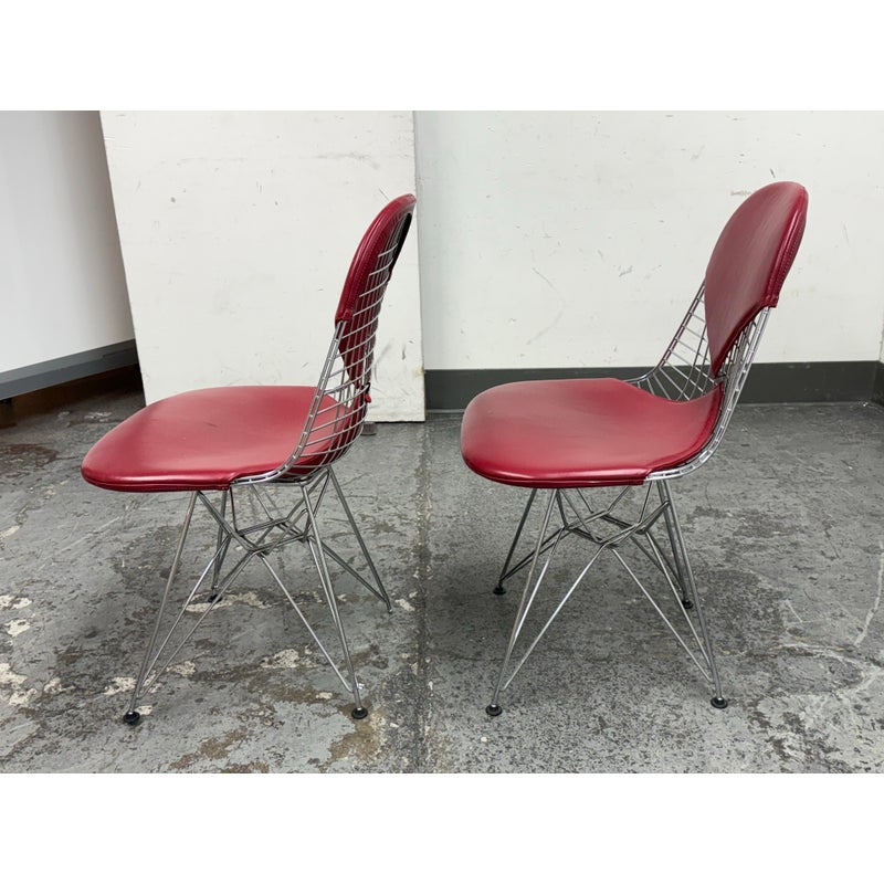 Design Plus Gallery presents a Classic Pair of Eiffel Side Chairs by Charles & Ray Eames for Herman Miller. The airy steel wire duo are padded in a lipstick “bikini” red leather. They will knock you out with their perfect Mid Century style + rich color captivating your eye. They are both in good condition for their usage with minimal surface wear.
