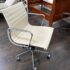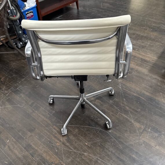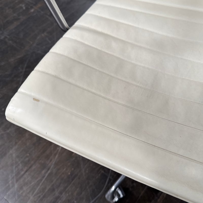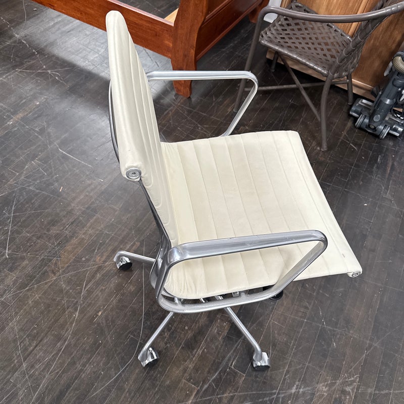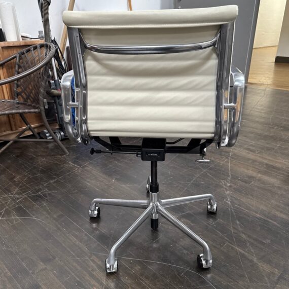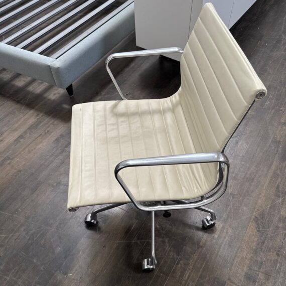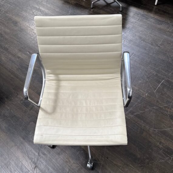 Design Plus Gallery presents the Eames Aluminum Group Management Chair by Charles + Ray Eames for Herman Miller. This iconic midcentury design features light ribbed leather upholstery set within a polished aluminum frame. The chair has a low back, open arms, and a swivel base with casters, creating the clean, refined silhouette that defines the Aluminum Group series. Celebrated for its precise lines and enduring modern presence, this classic design remains as versatile as it is recognizable. It is in good condition with visible wear to the leather, minimal wear from use. Made in the USA.