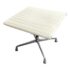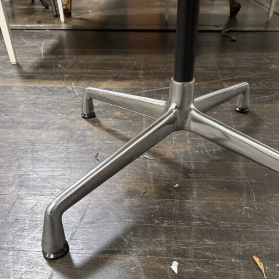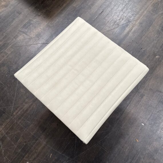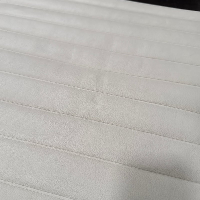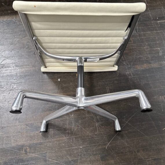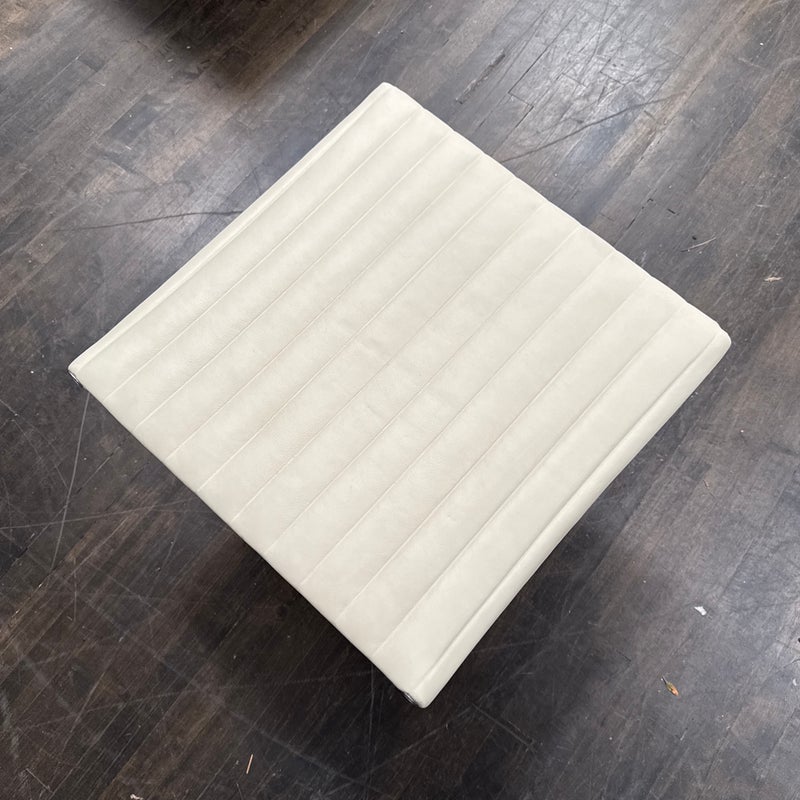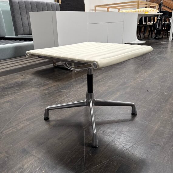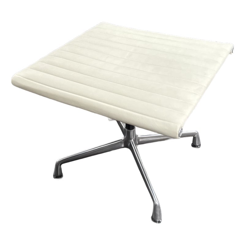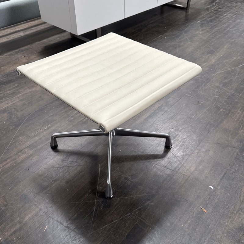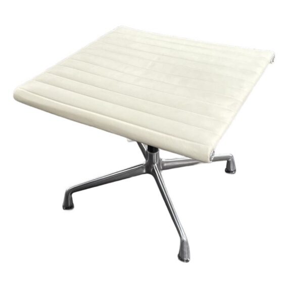 Design Plus Gallery presents the Eames Aluminum Group Ottoman by Charles + Ray Eames for Herman Miller. This iconic midcentury piece features light ribbed leather upholstery framed in polished aluminum. Echoing the clean lines and horizontal channeling of the Aluminum Group series, the ottoman has a sleek profile and aluminum base that give it a refined, modern presence. Celebrated for its precise construction and timeless design, it remains a classic example of enduring American modernism. It is in good condition with visible, minimal wear from usage. Made in the USA.