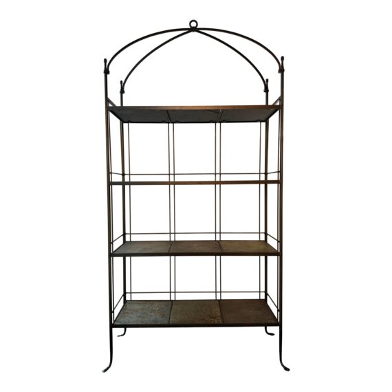 Design Plus Gallery presents the Monarch Bakers Rack by Charleston Forge. A Royal silhouette, the black iron etagere creates lovely display or storage, with slate tiles creating shelving. Iron rails on three sides keep things where you want them or hold dish towels or linen. Light surface wear; consistent with age and use. Made in Boone, North Carolina, USA.