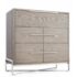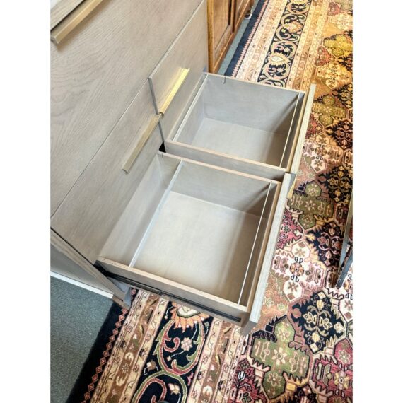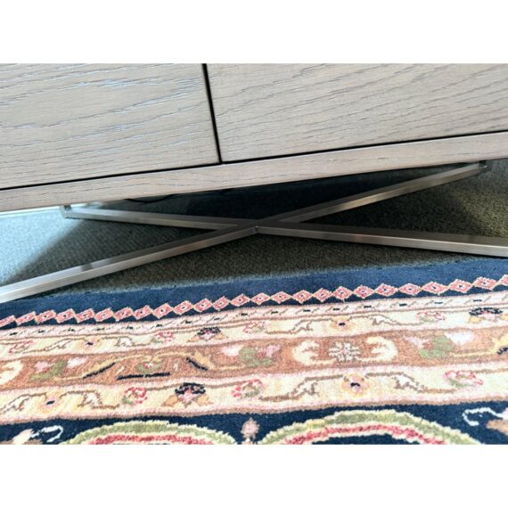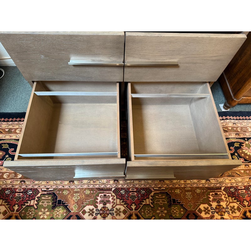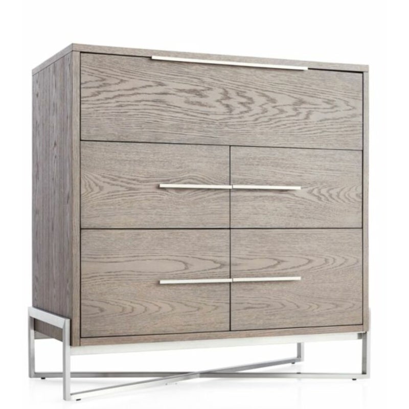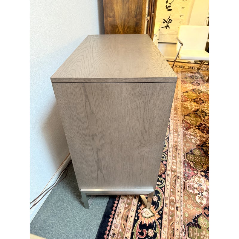 Design Plus Gallery presents the Covert Secretary Desk from Crate & Barrel. This modern secretary desk conceals its multifunctional identity behind beautifully grained and grey-tinted drawers of oak veneer. Slim iron pulls provide access to four roomy drawers and a top cabinet door that folds down as a work surface. Designed by Charlie Zagaroli, this exclusive secretary desk rises on an architectural X-base of gleaming stainless steel, giving the desk a clean and contemporary look that works equally as well in the office or living room. The desk is in good condition for its overall usage. Made in Vietnam.
